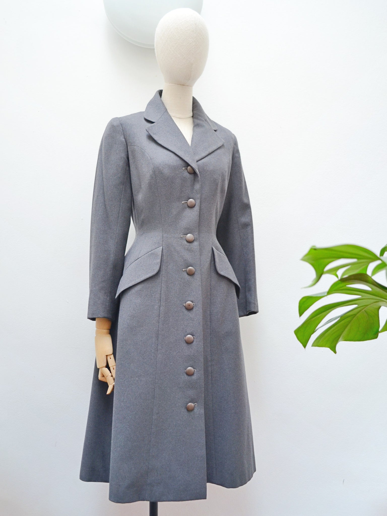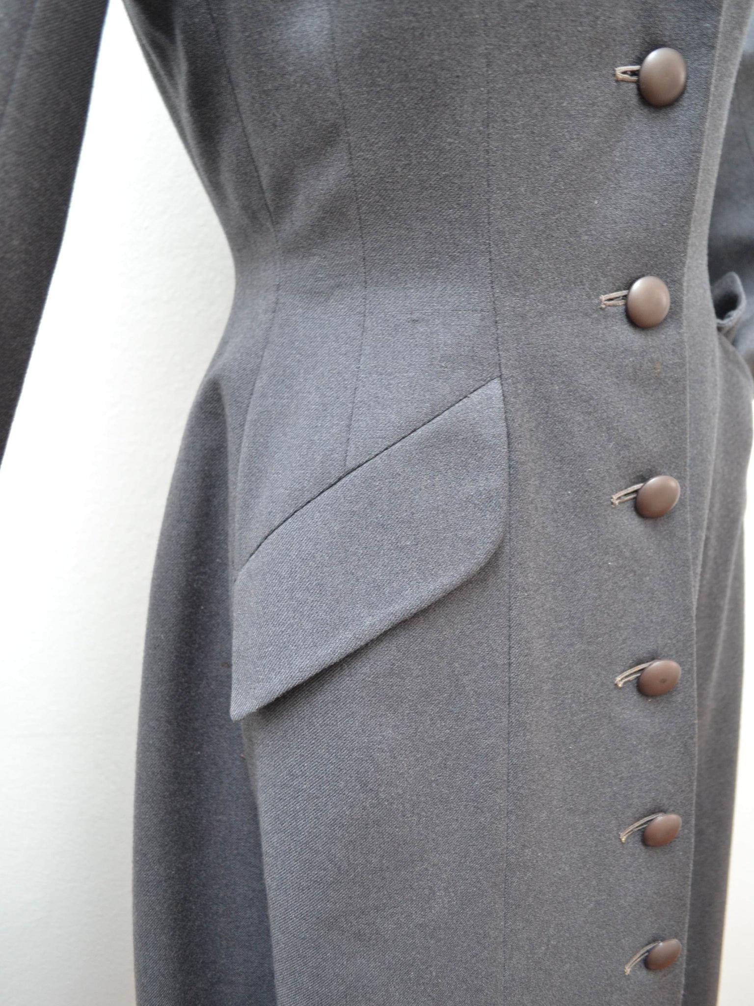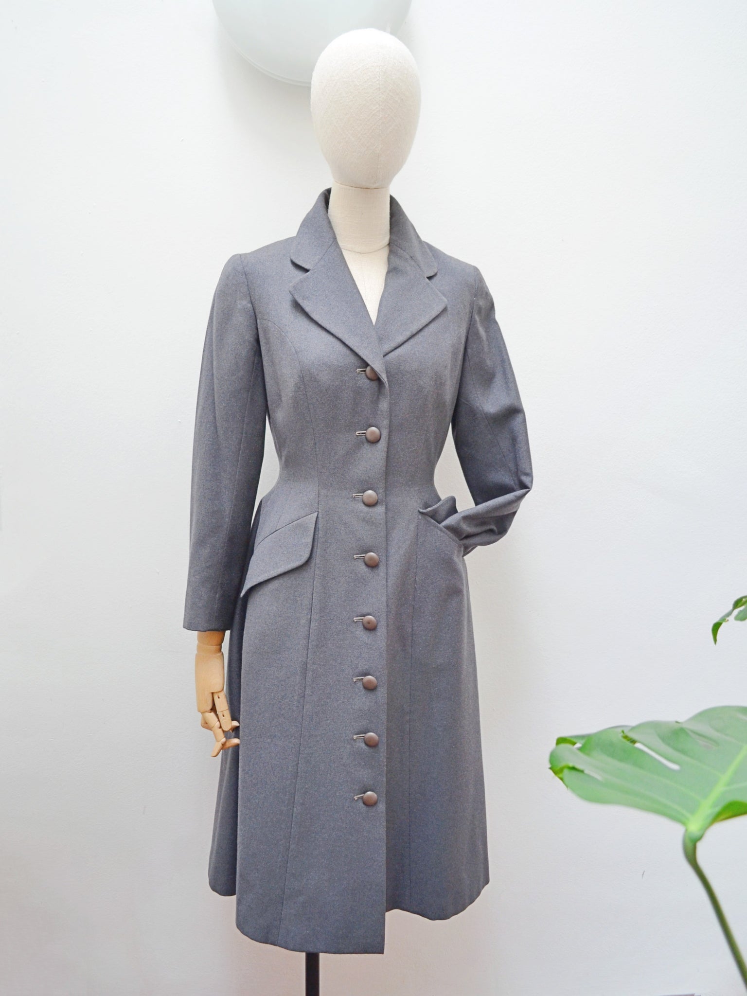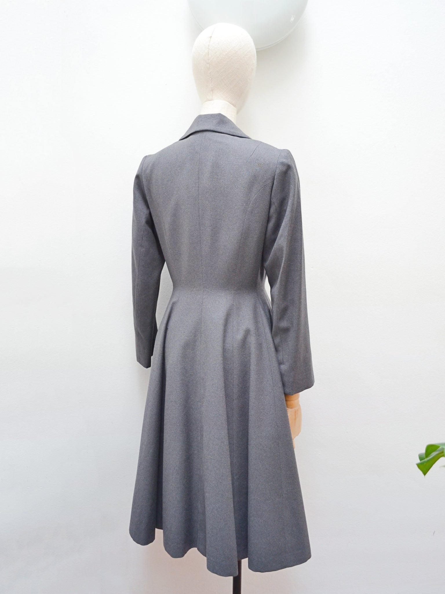 A chic early 1950s coat from ’Leslie Raymond Model’ label, in dark grey fine wool, interfaced to hold form and lined in rayon. Fitted to the waist and gored in panels for fulness from there down, it features lapel collar and slanted pockets.