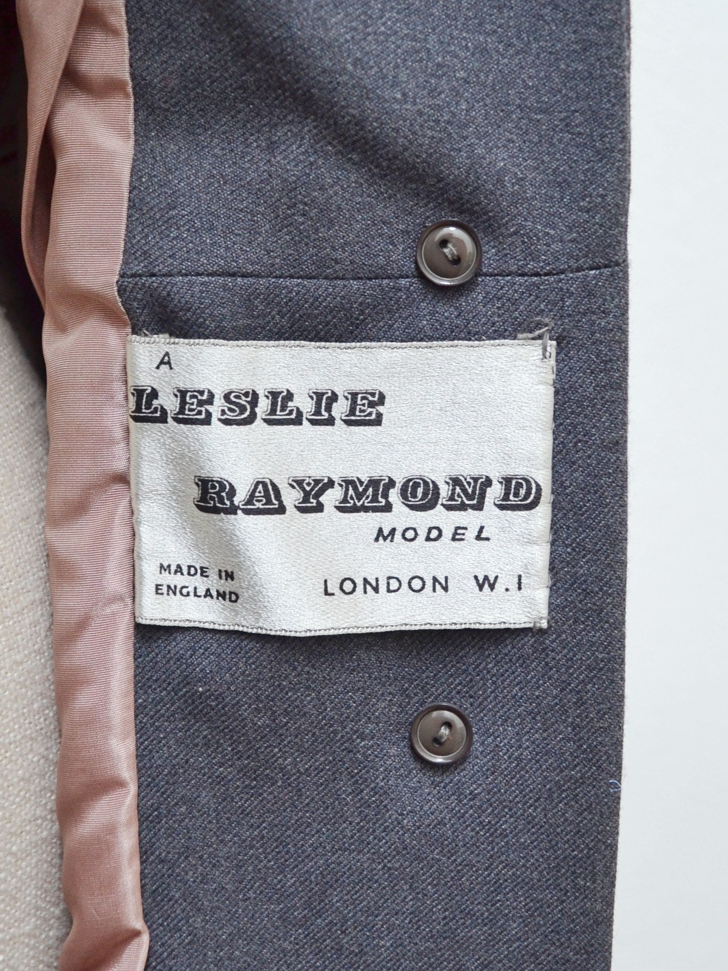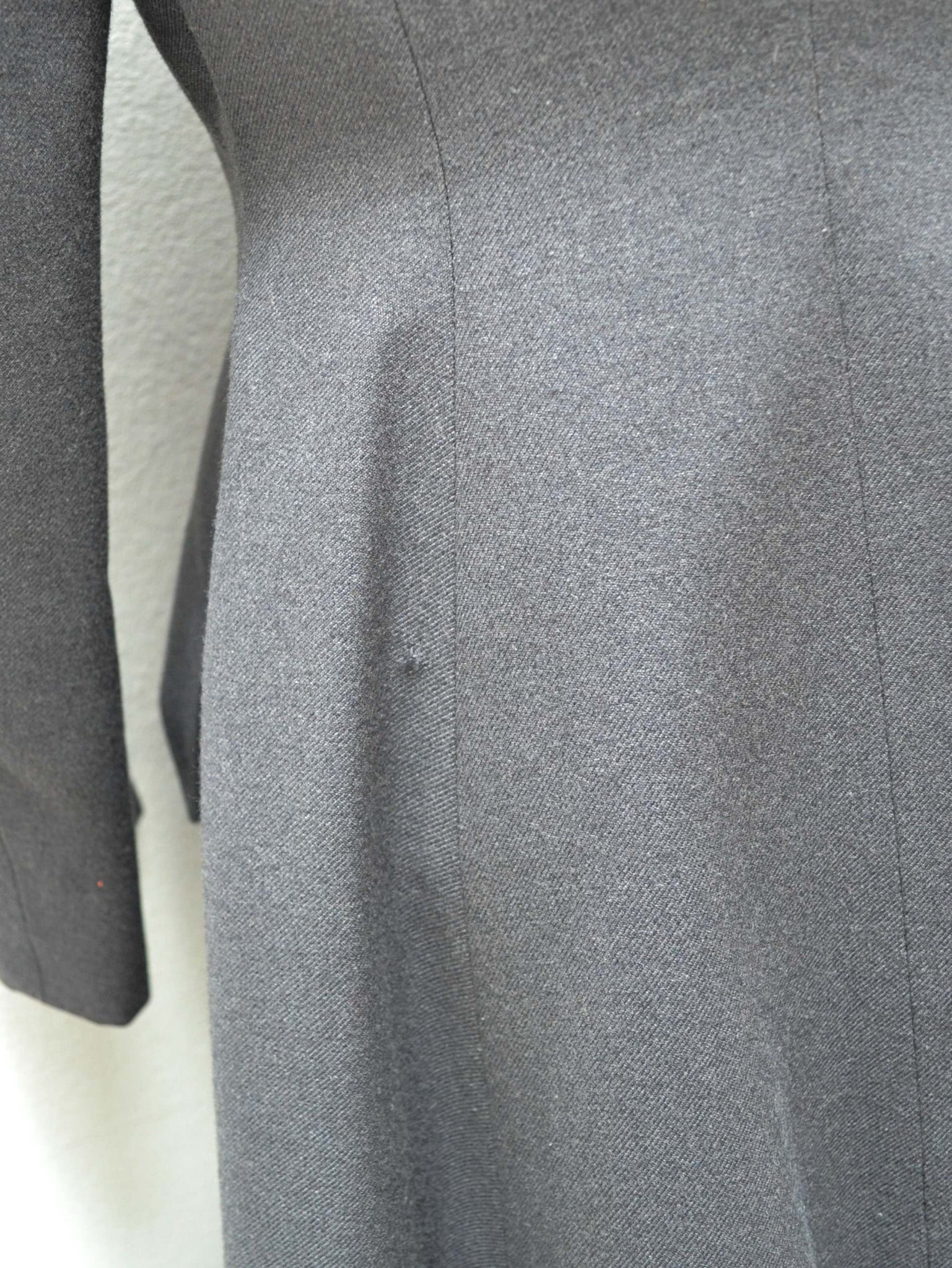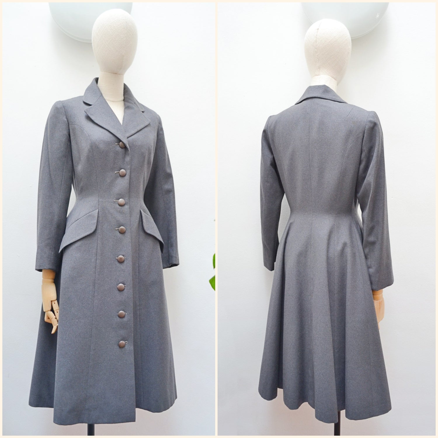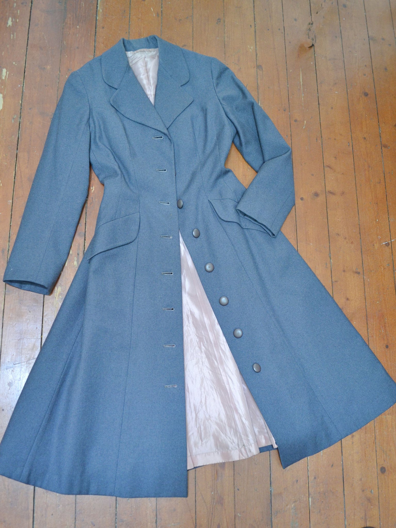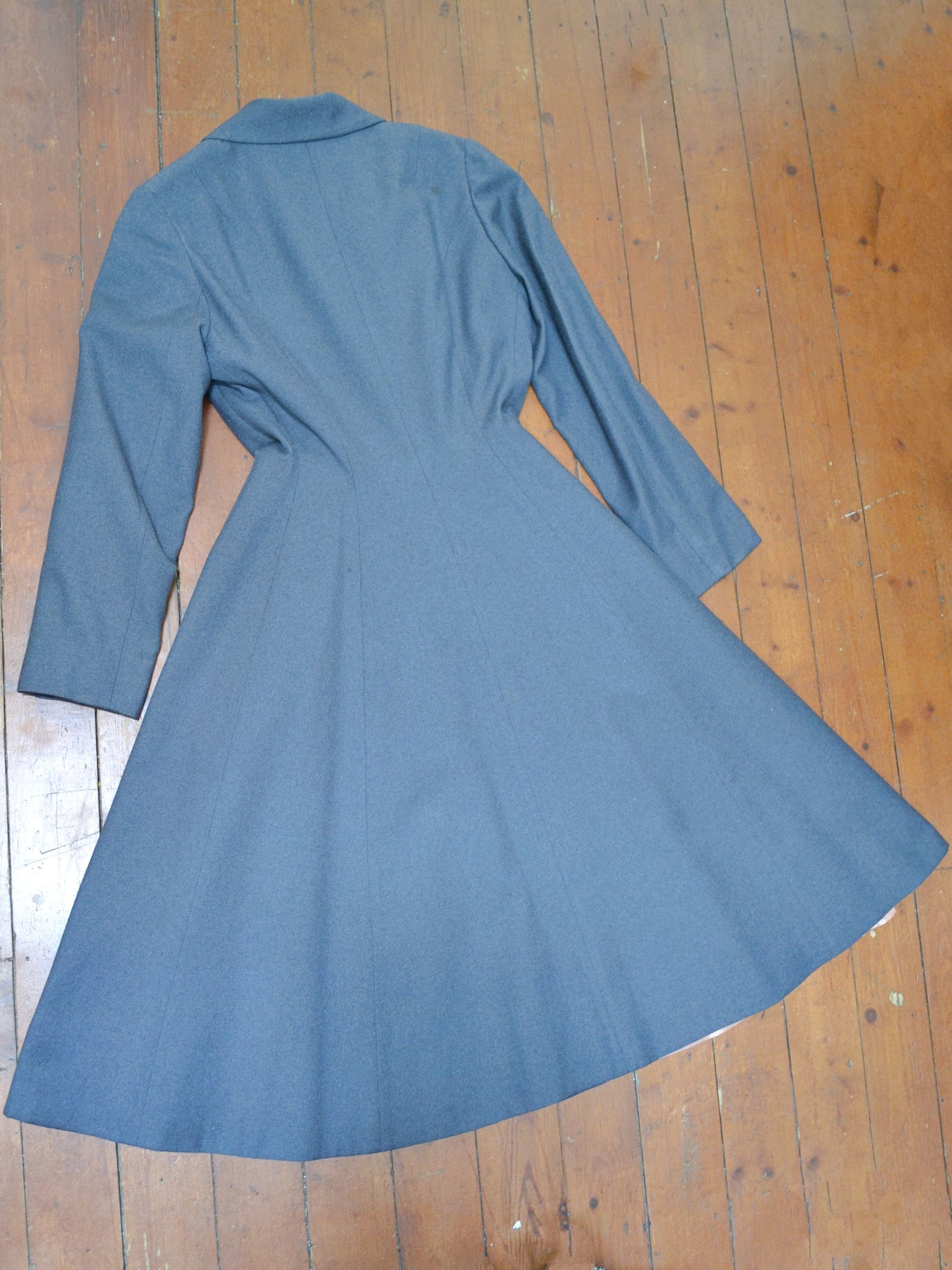 A chic early 1950s coat from ’Leslie Raymond Model’ label, in dark grey fine wool, interfaced to hold form and lined in rayon. Fitted to the waist and gored in panels for fulness from there down, it features lapel collar and slanted pockets.