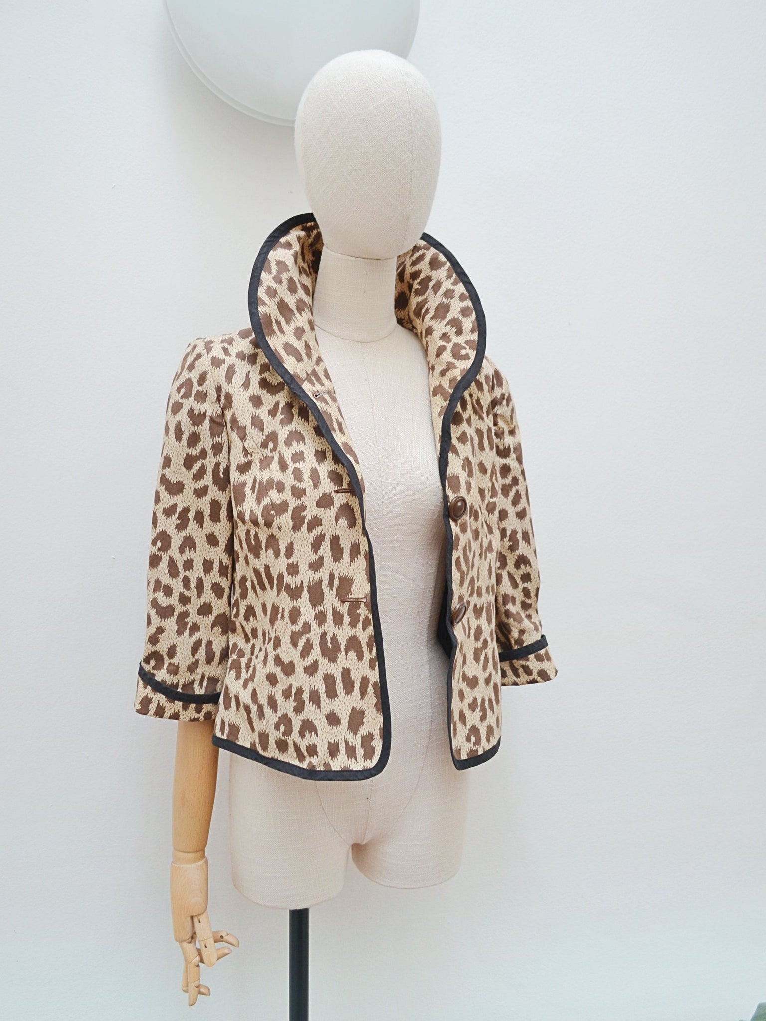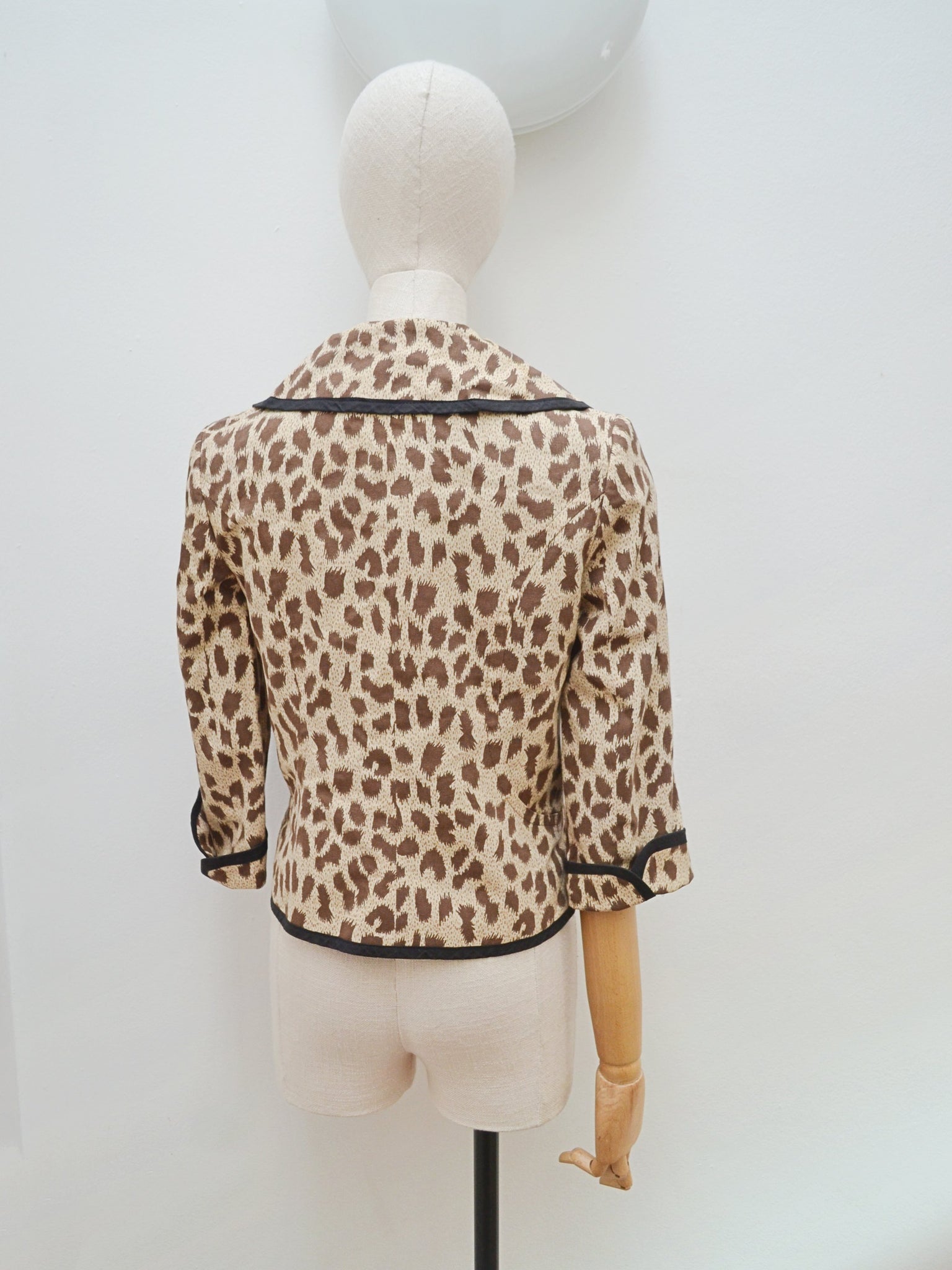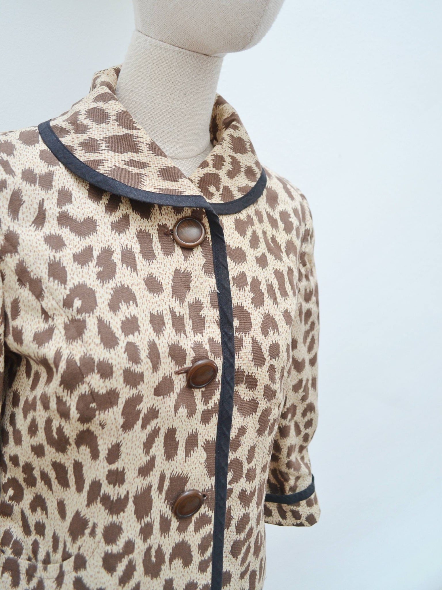 A chic casual early 1960s jacket in kind of cotton drill, with versatile leopard print in chocolate brown against a warm cream (leopard is a neutral!). With edges bound in black cotton, it is semi fitted, with nice shaping to the back, and curved front pockets. 3/4 length sleeves are finished with fold back petal cuffs, and rounded collar is able to be worn ‘popped’ for a bit of drama.