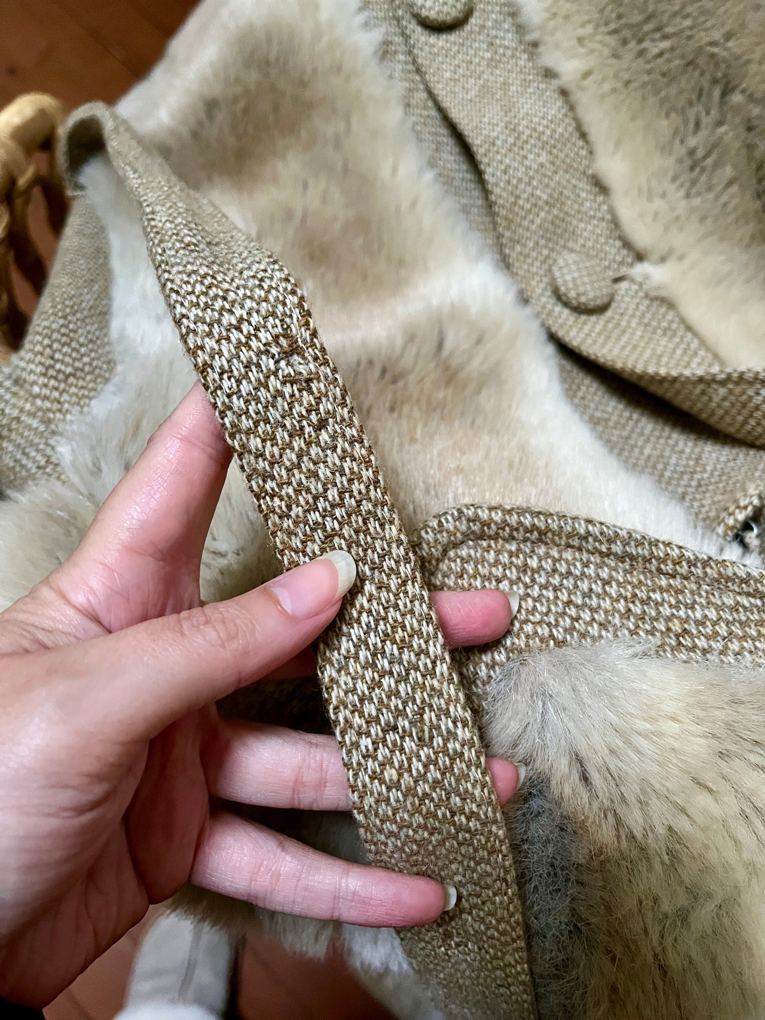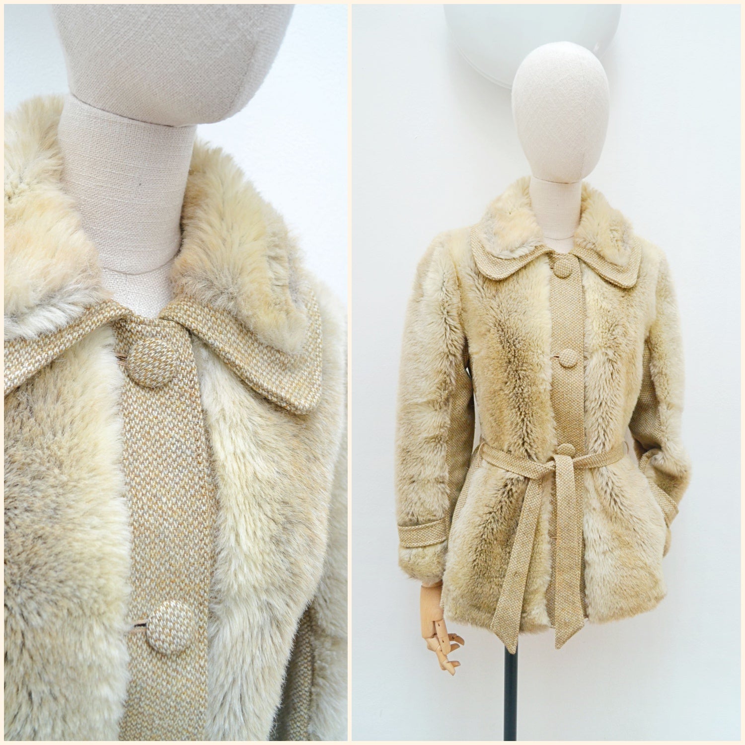 A glamorous 1970s jacket/short coat from British ‘Astraka’ label, a company on the go since the 1890s manufacturing the most realistic simulated furs. Their later label slogan “beauty without cruelty” is particularly lovely! Semi fitted but with tie belt to draw in the waist as desired, it is constructed in alternating panels of faux fur, and khaki/cream coloured tweedy wool. Fastening with large covered wool buttons, the collar is SO chic and spectacular, and pockets finish the front.