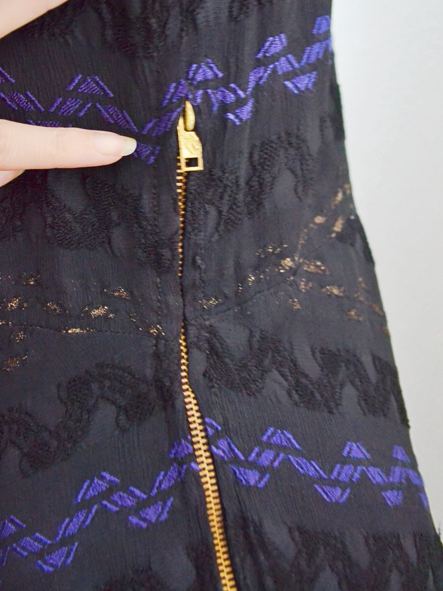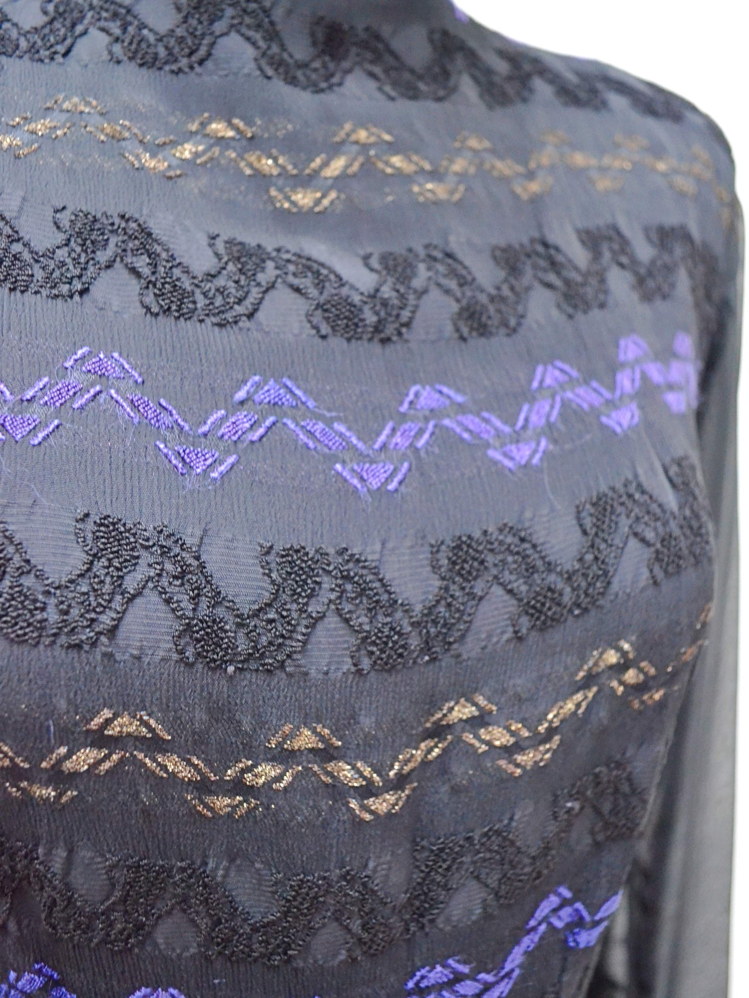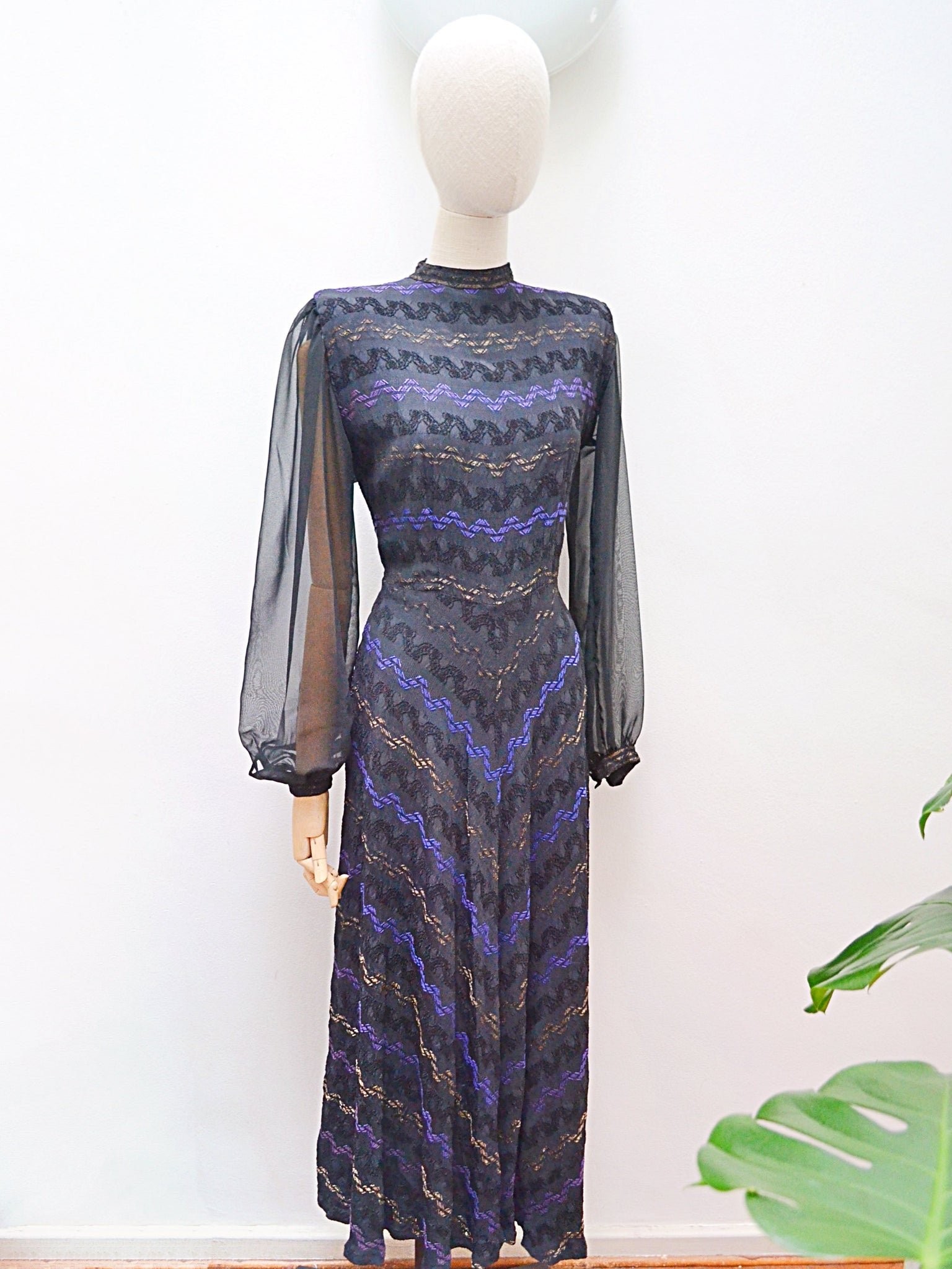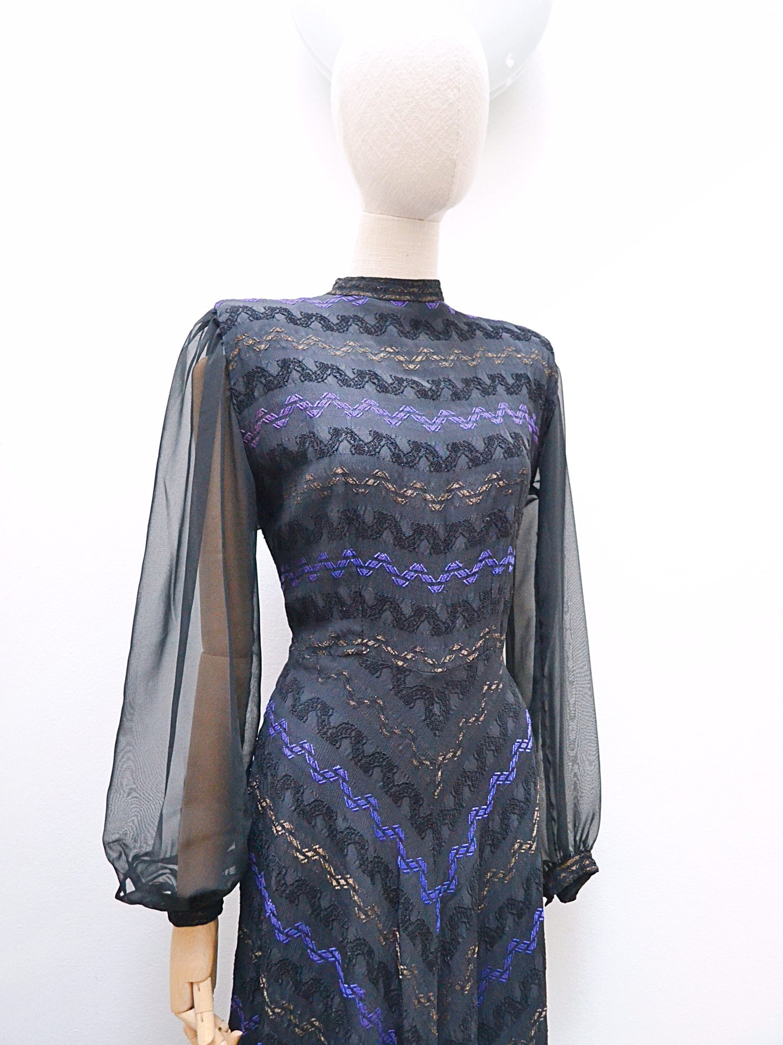 Just divine 1940s evening dress in gorgeous black textured crepe, with jacquard pattern of zig zags in deeper black, regal purle-blue, and gold threads. Bias cut for the perfect cling and drape, the long sleeves are sheer, and gathered to a flat cuff to ‘billow’ for some drama. A statuesque high neckline with popstud fastening to back, and hip-skimming skirt. Metal Lightning brand zip to fasten at side, the pice is lined in the body, with little shoulder pads.