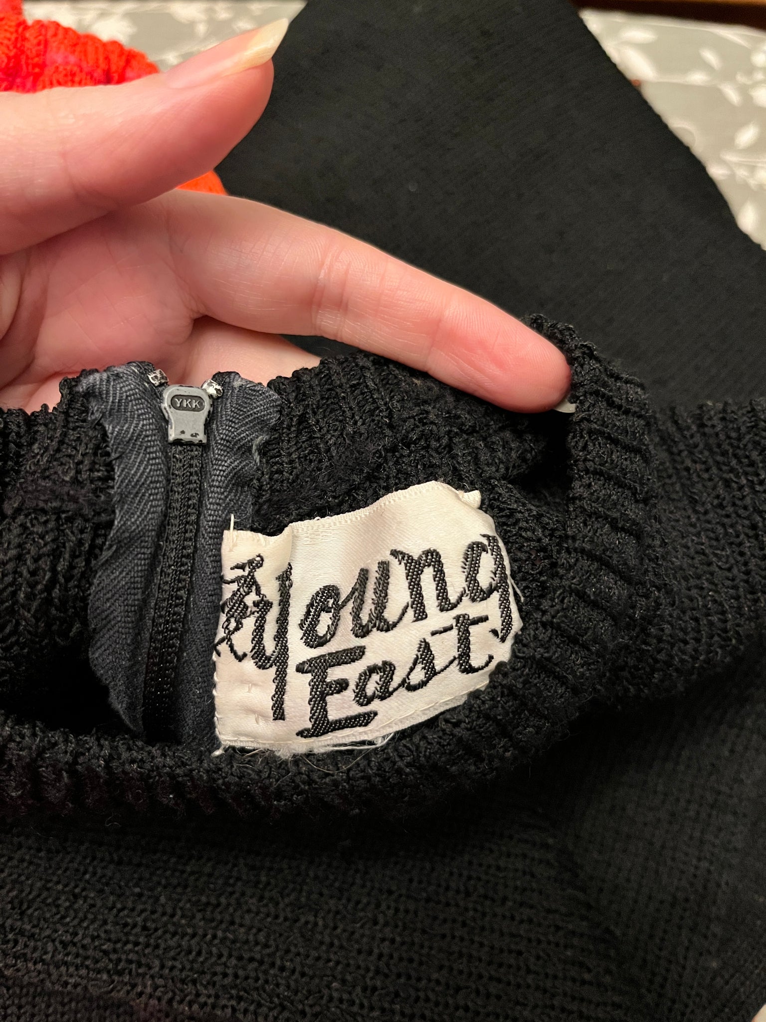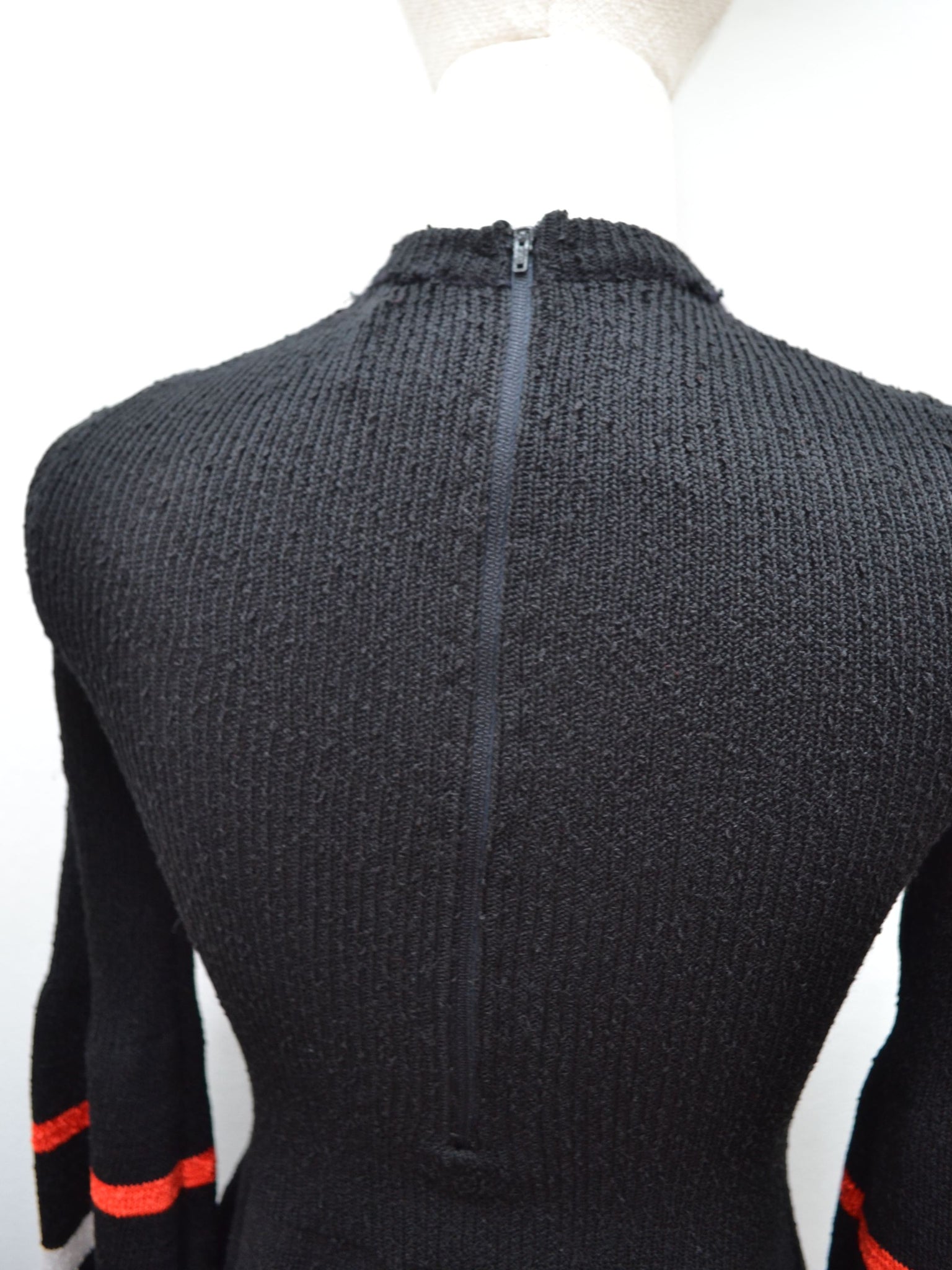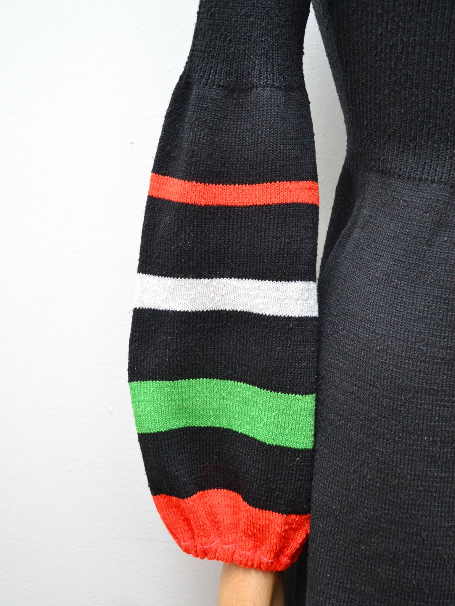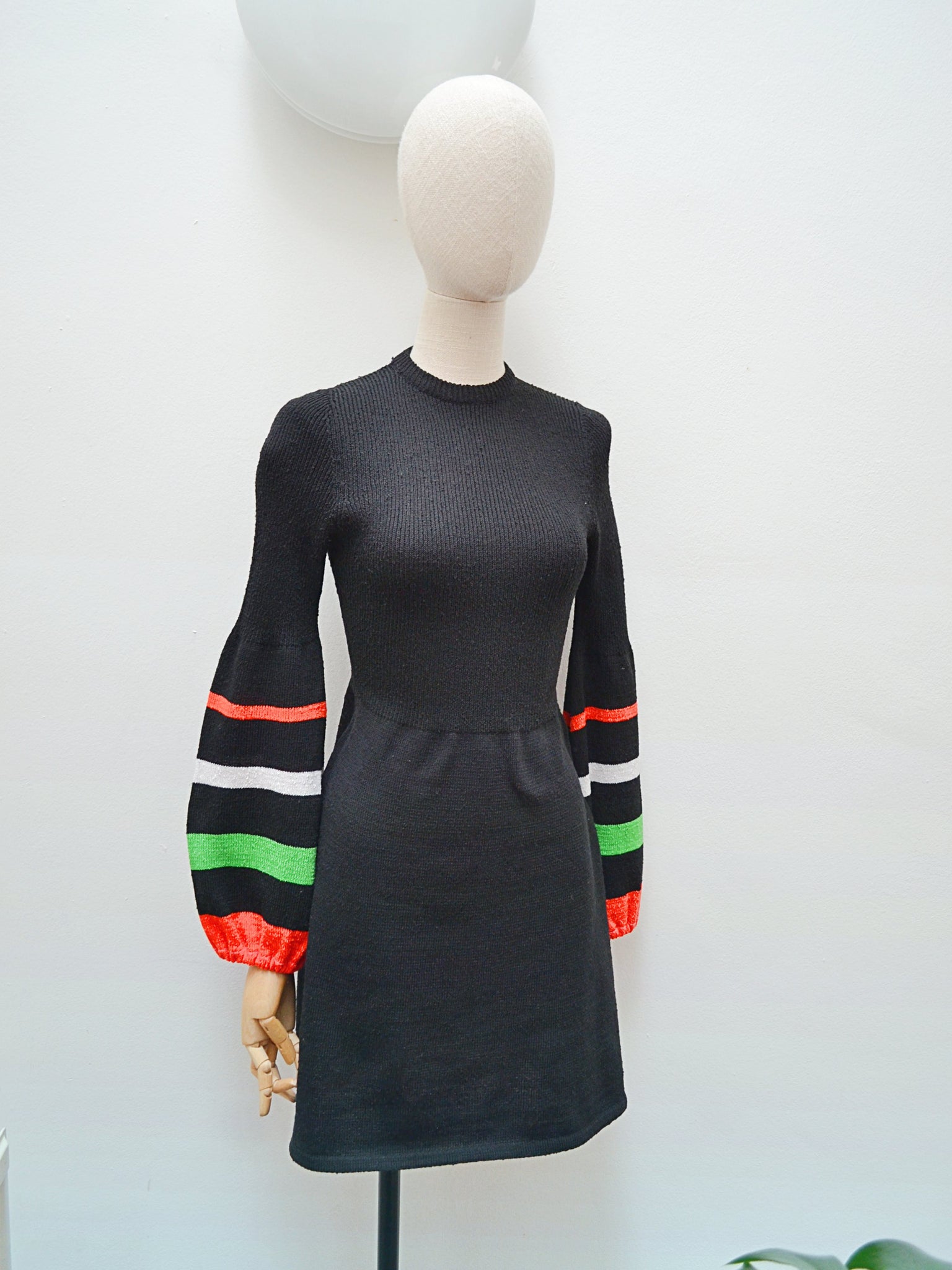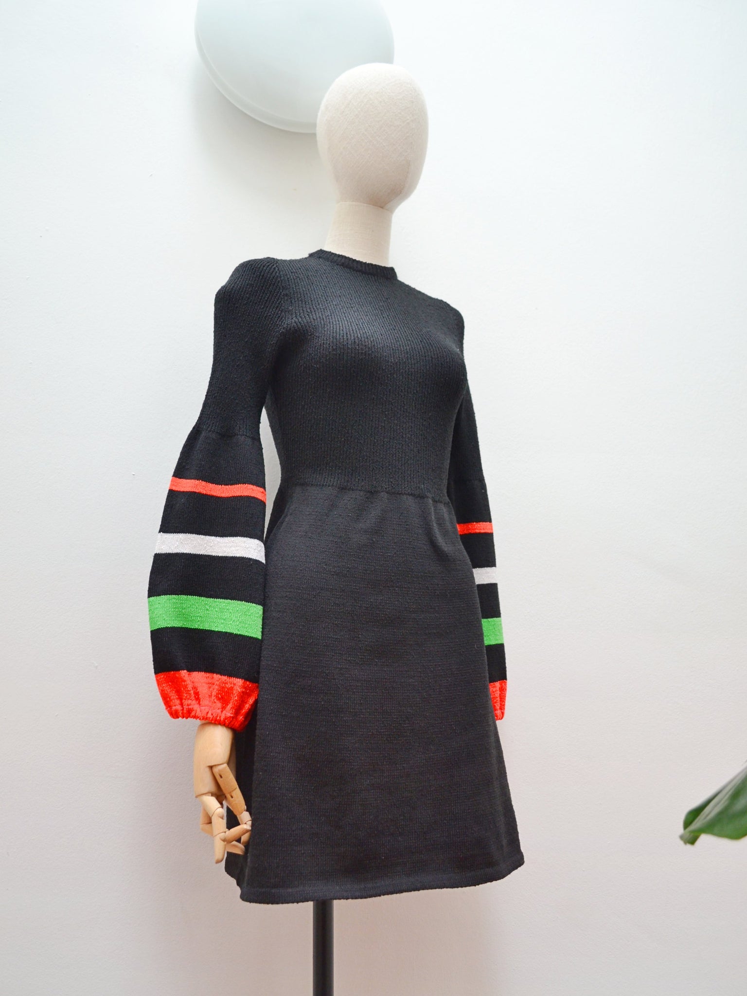 A groovy 1970s dress in black jersey, feels like a rayon or good quality synthetic?, from ‘Young East’ label. With fitted bodice and A line skirt, the long sleeves are straight to elbow length, where they balloon out then gather to an elasticated wrist. The balloons are detailed with stripes of for a pop of colour! Unlined, with back neck zip