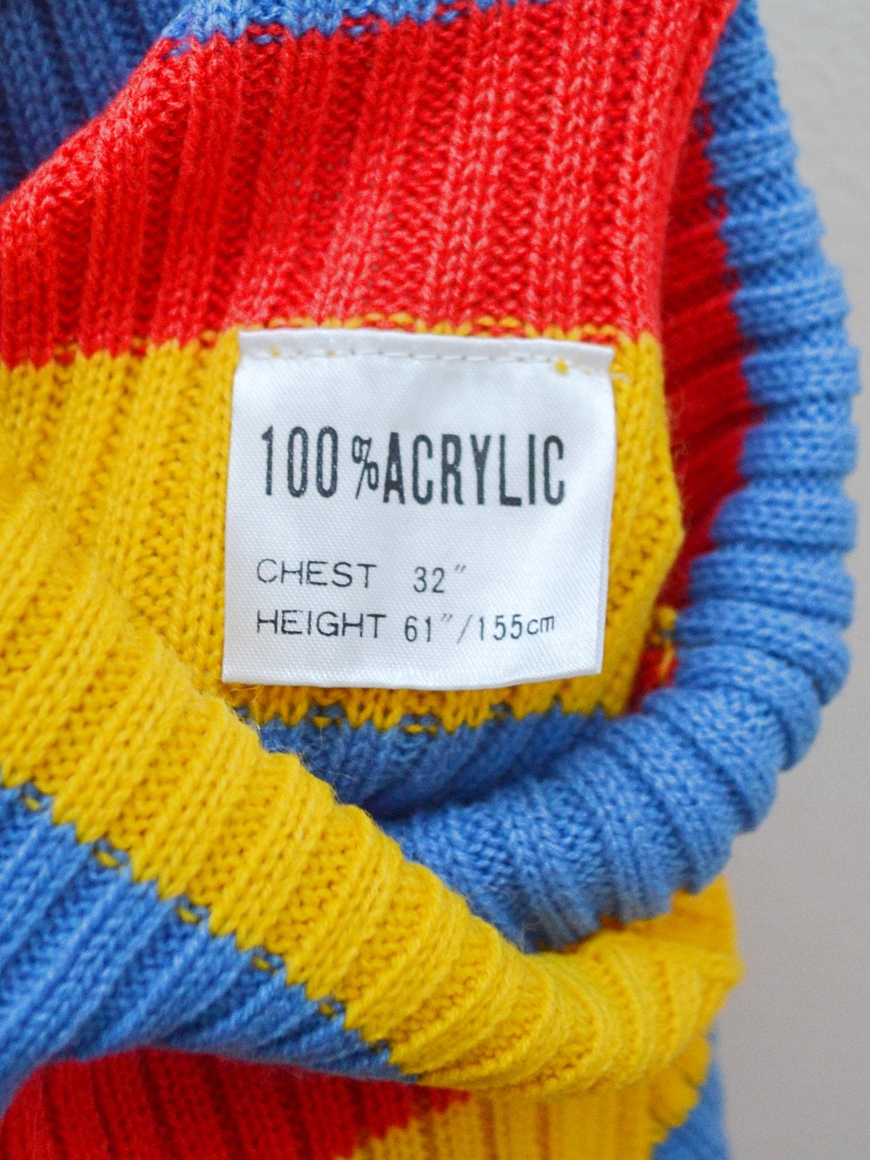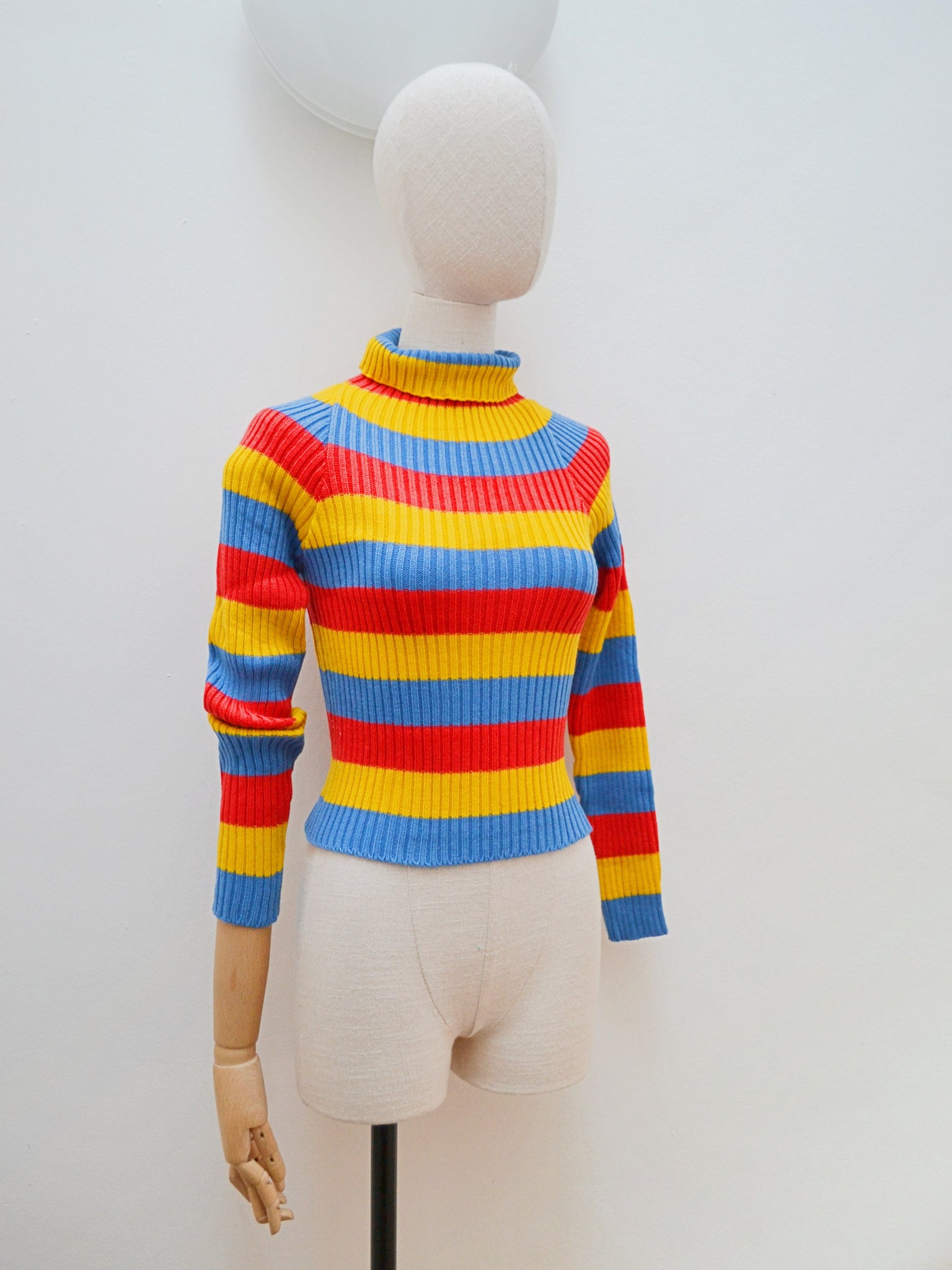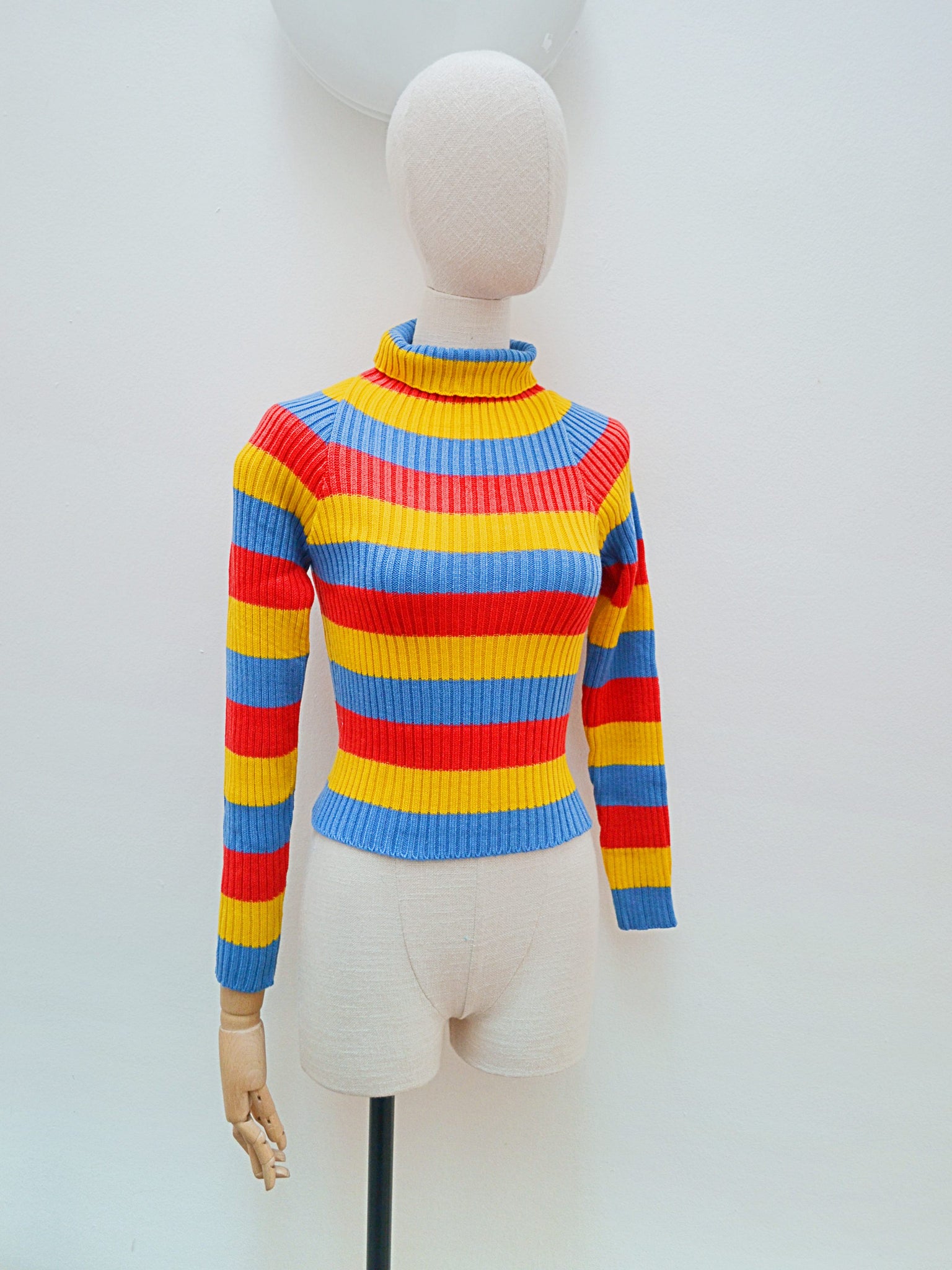 A classic 1970s skinnyrib sweater top in acrylic, striped in brigt yellow, red, and blue, with poloneck. Great with denim, why not style with flares, or A line mini skirt and boots! More retro knitwear can be found instore