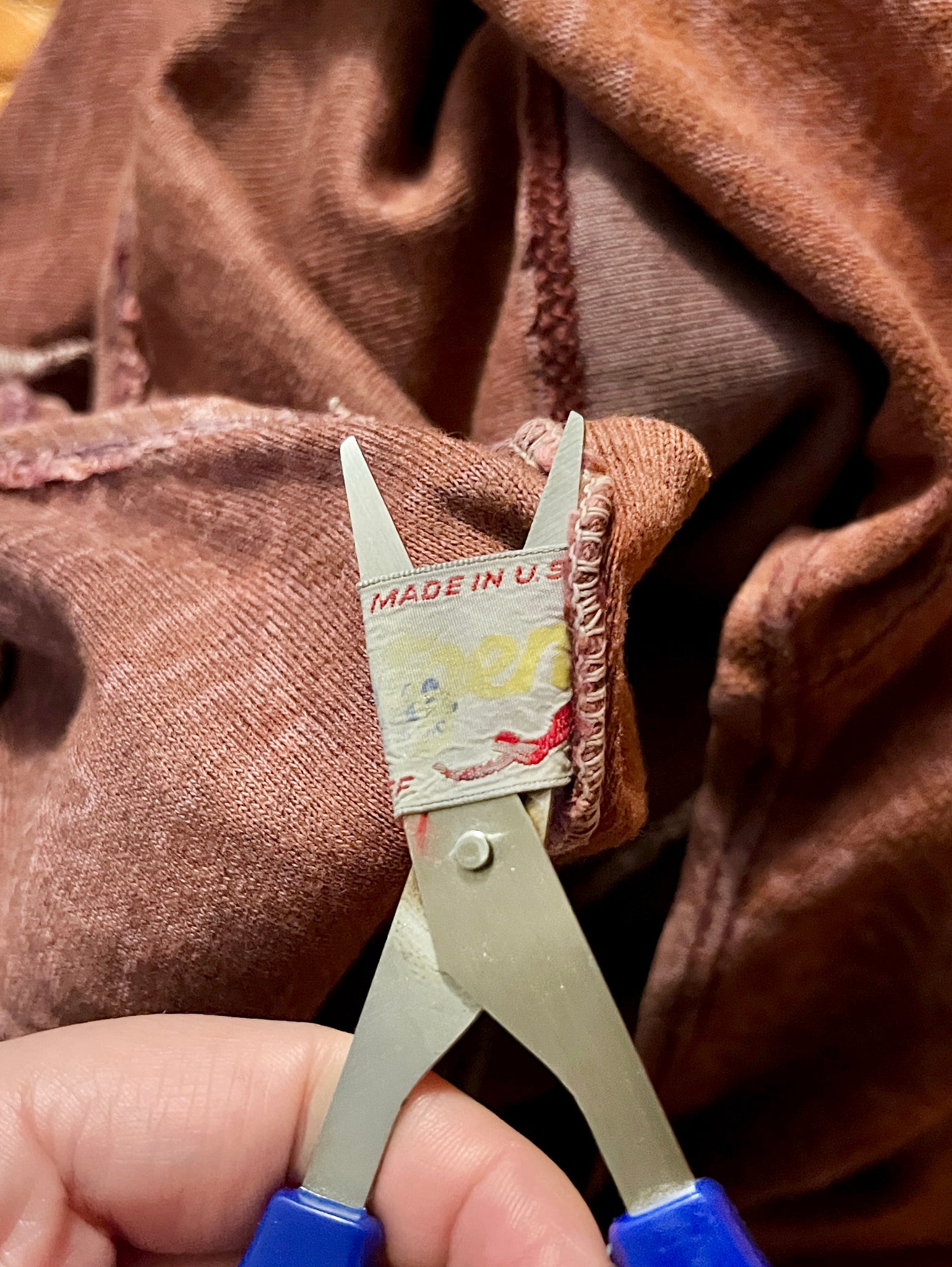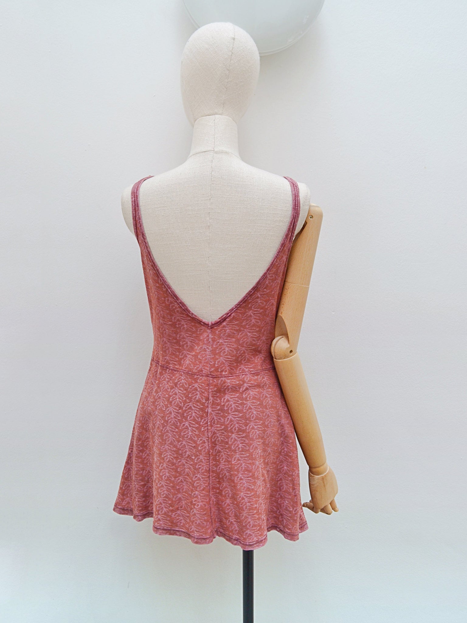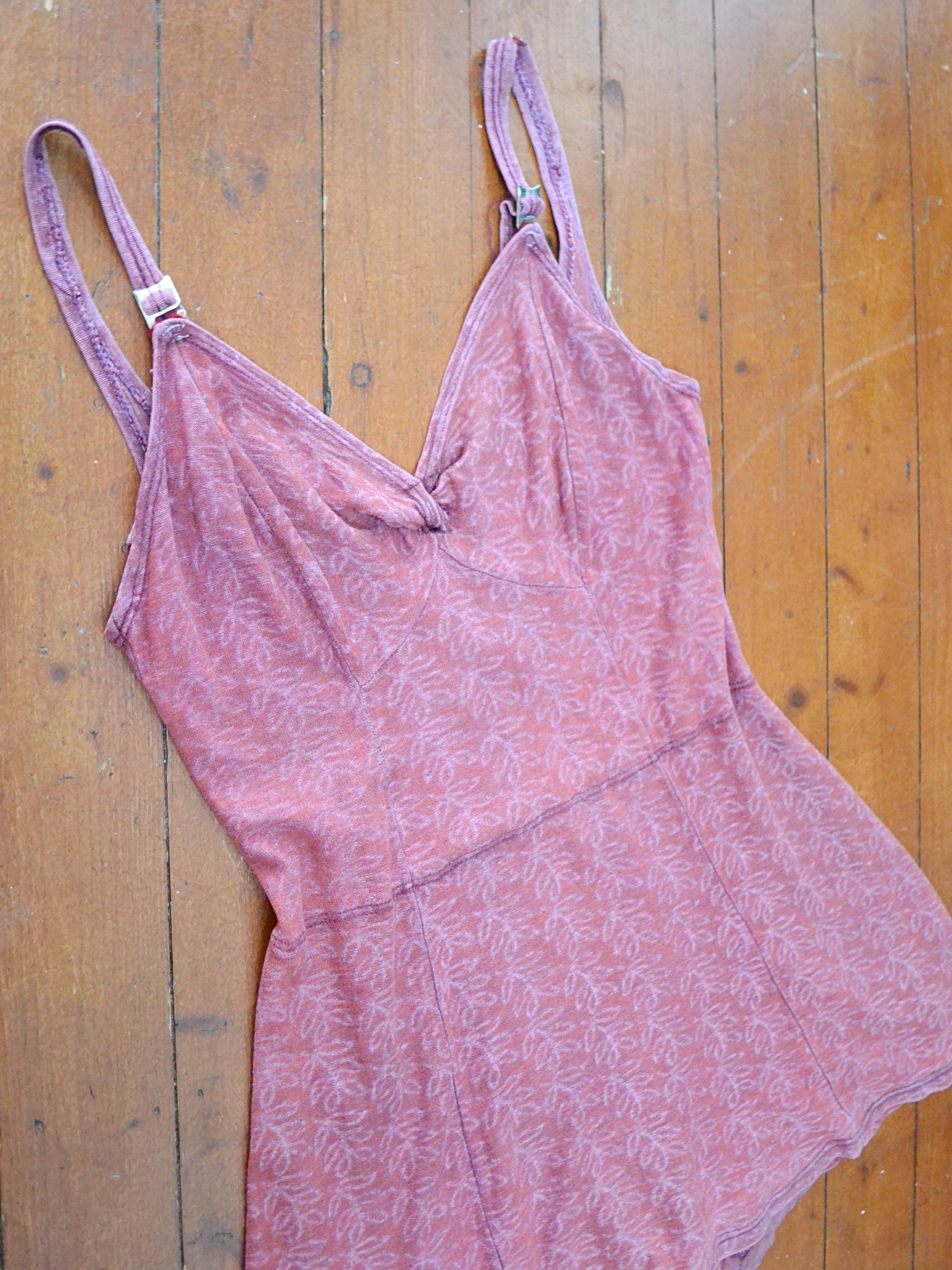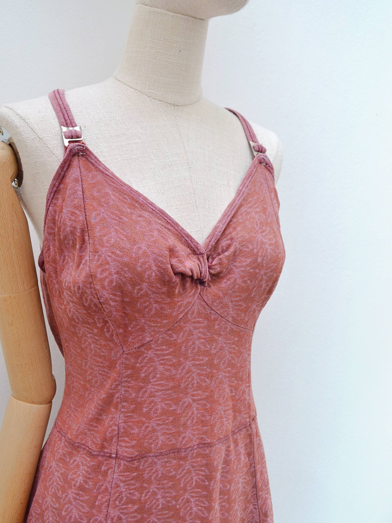 An original mid 1930s Jantzen label swimsuit, in lovely shade of dusky plum-mauve, in dense cotton jersey patterned with a raised texture vine motif. Typical skirted cut with briefs beneath, with ‘knotted’ centrefront and adjustable straps fastening with signature bow detail hooks. Label states size at 38, colour is most like close up image of texture