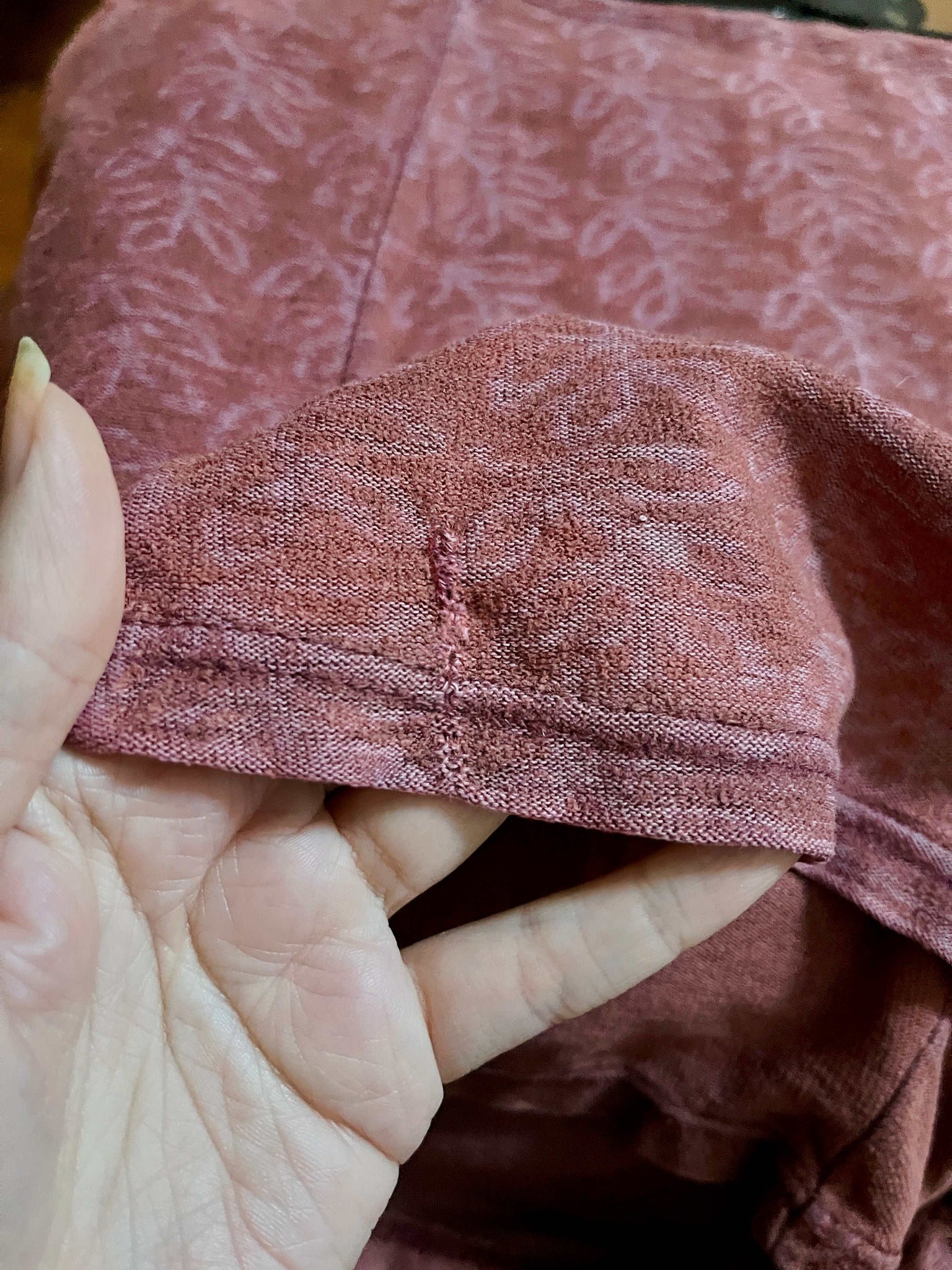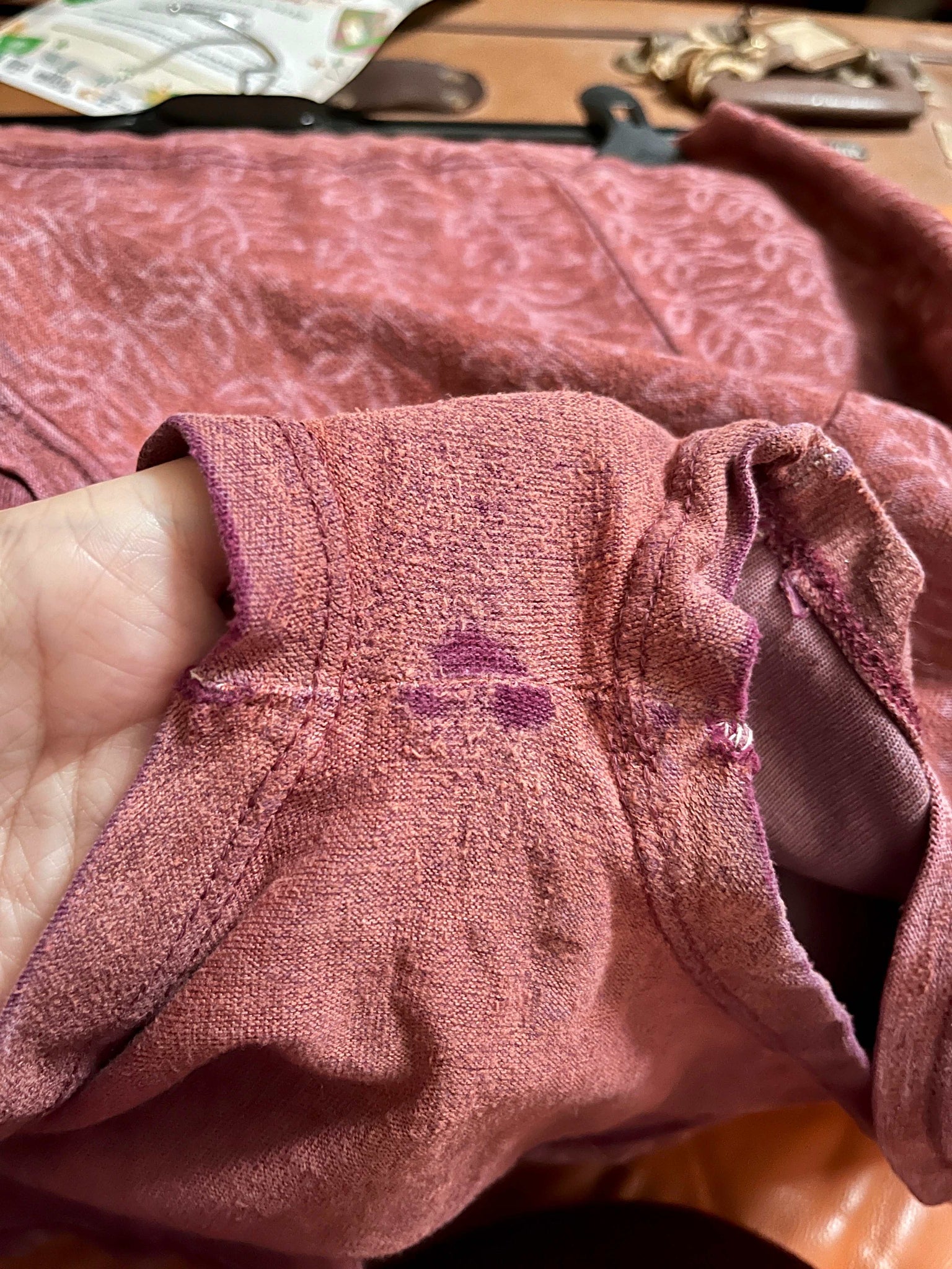 Presents very well and structurally sound & wearable. A run in the jersey to the front of skirt hem as pictured, which has been secured with some neat darning stitches, and not as noticeable when worn. Darn repair to the strap as seen which is very secure. Gusset of the briefs has wear to the surface of the weave, and small area of fraying to either end of the seam which has been secured with unnoticeable stitches and isn't seen when worn.