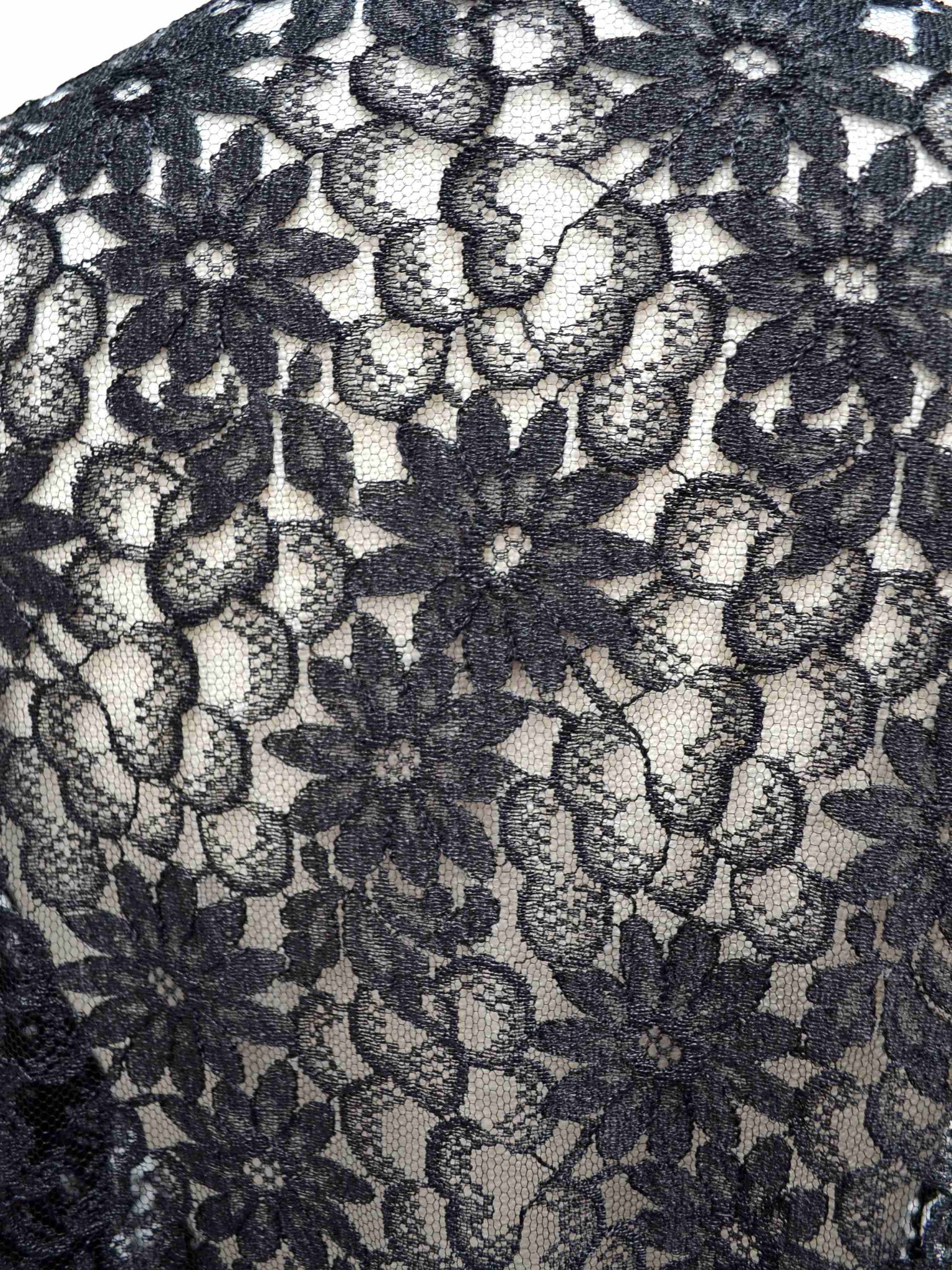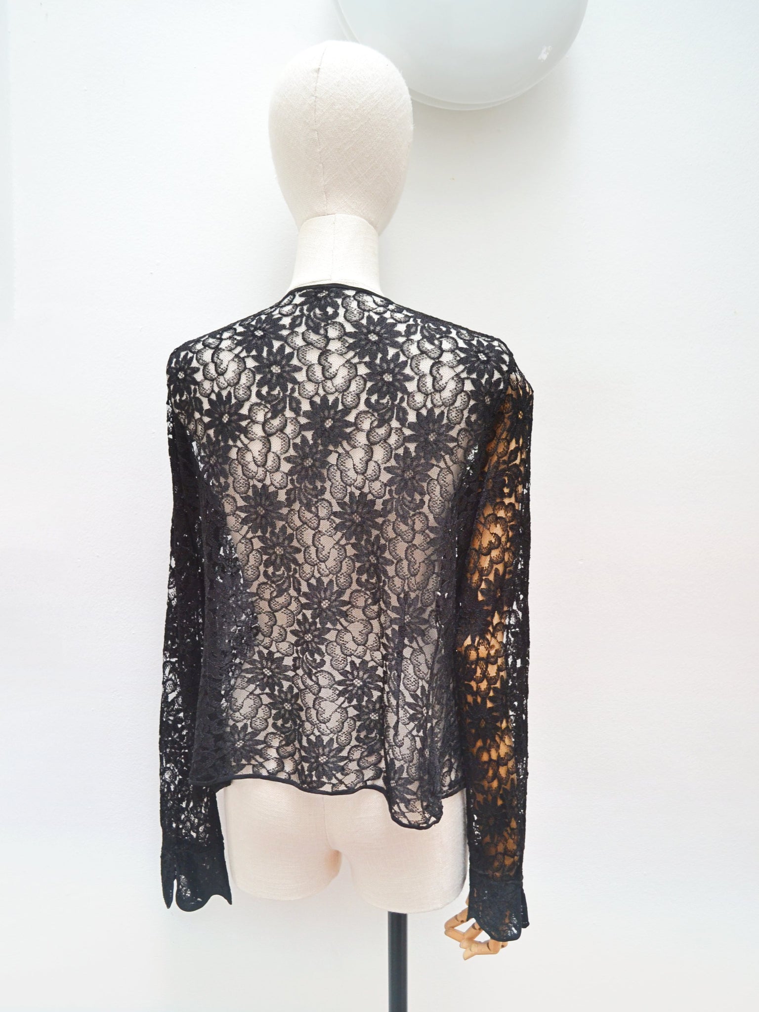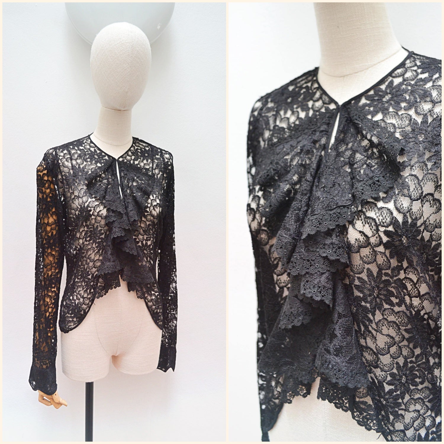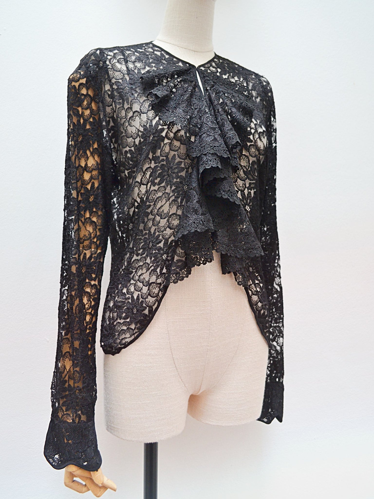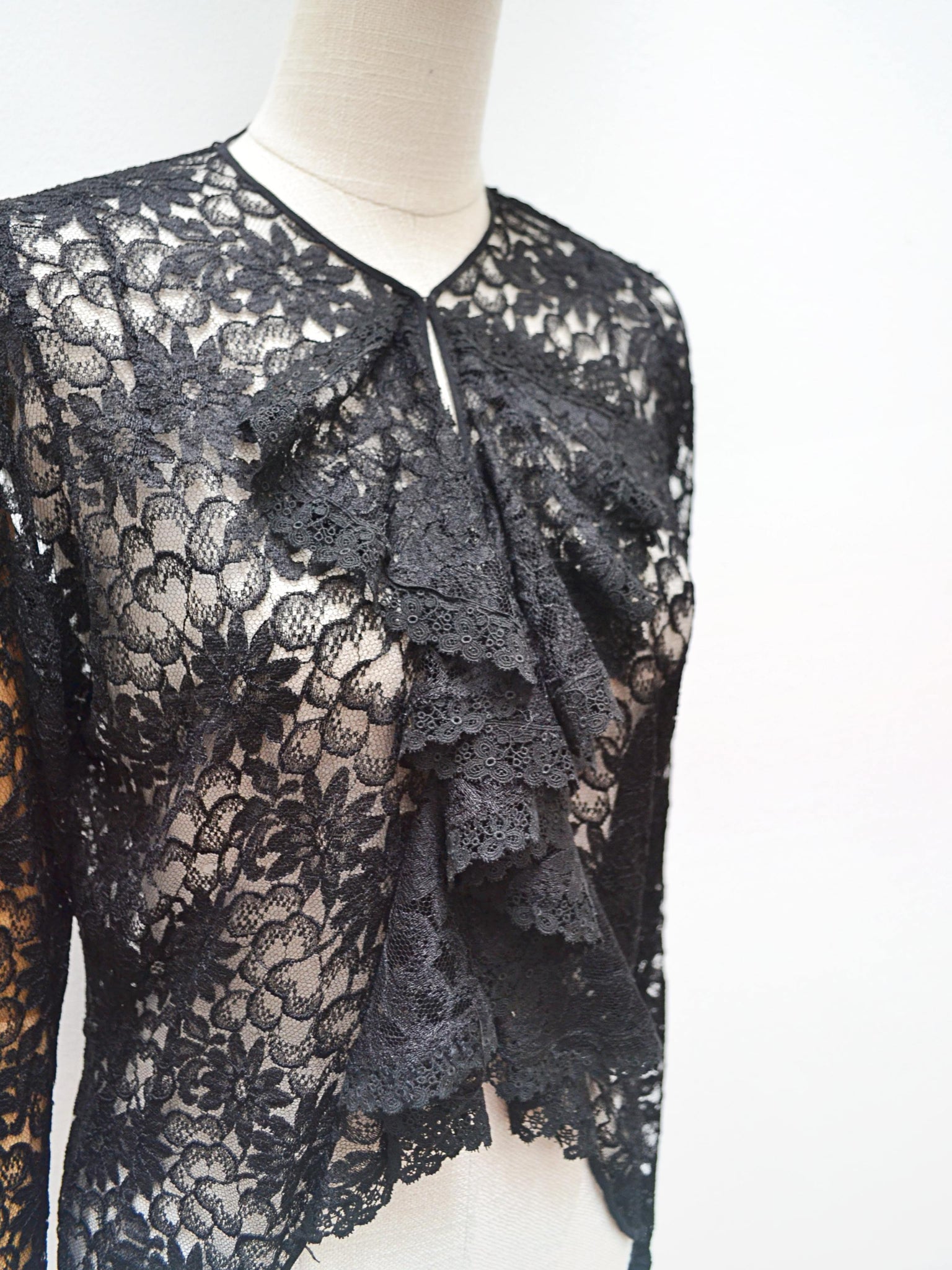 A demure 1930s coverup jacket (or blouse perhaps!) in blackest black floral lace, semi fitted, with edged bound in silk and dainty hook/eye fastenings. The long sleeves are finished with scalloped cuffs which extend down over the hands, and front is detailed with lace-trimmed ruffle jabot.