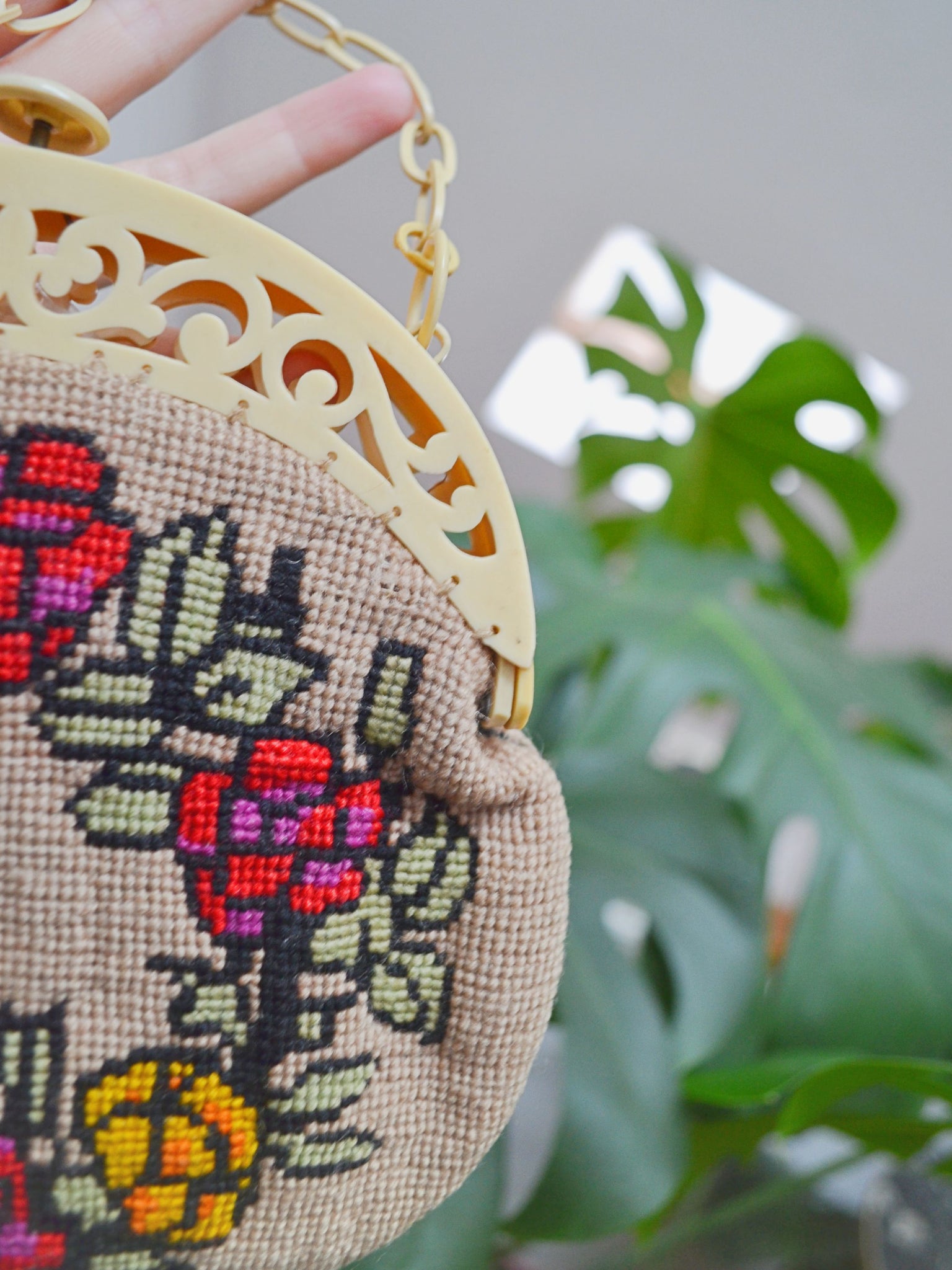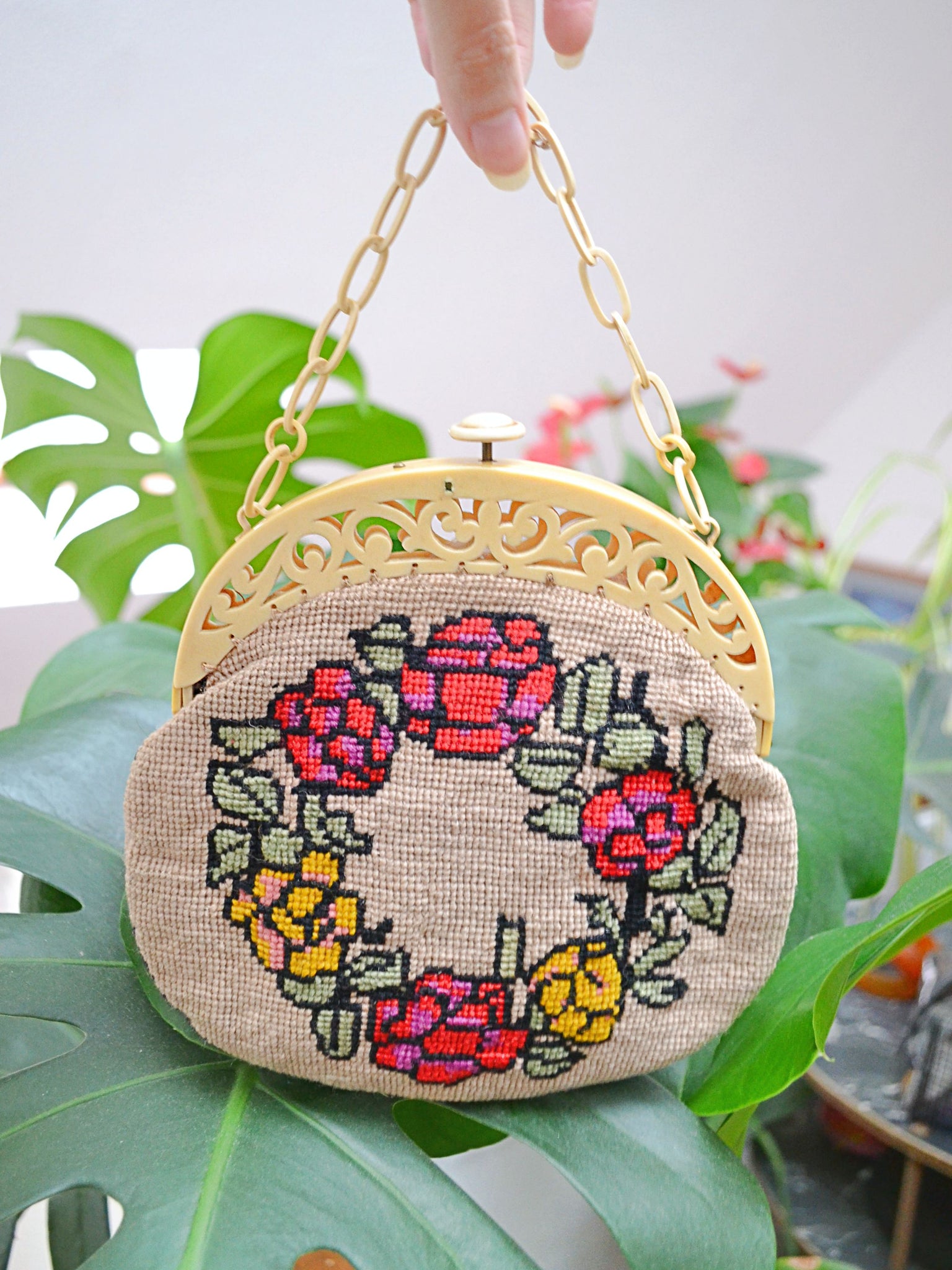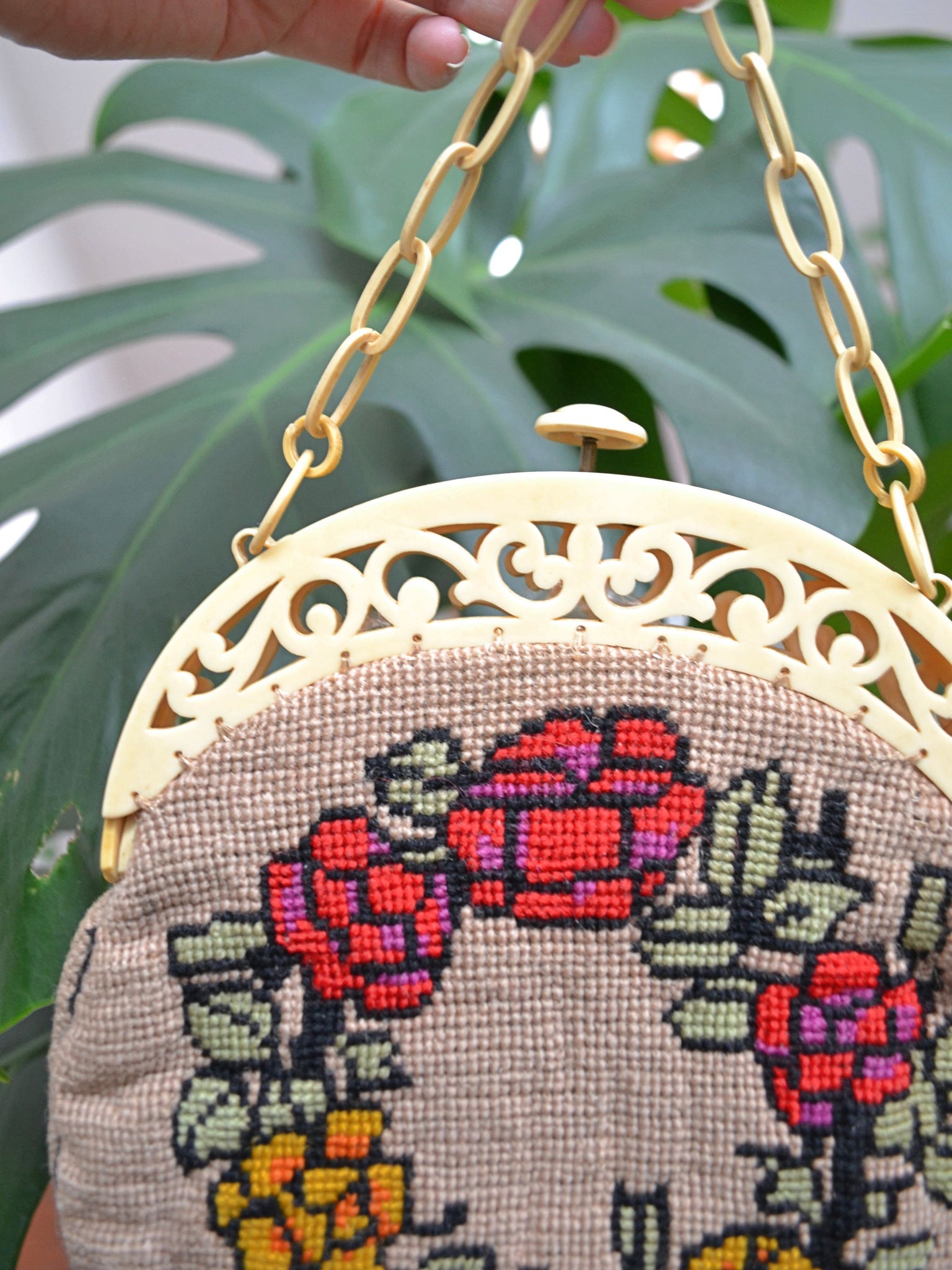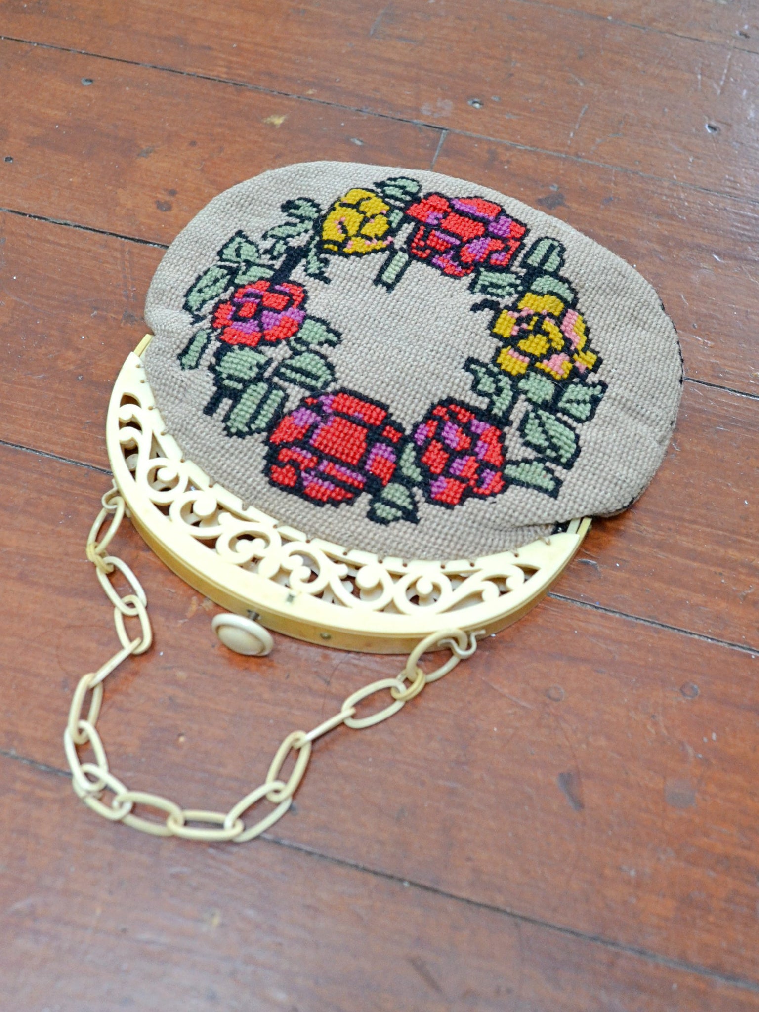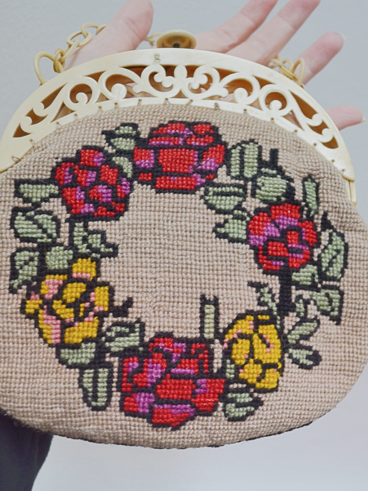 A particularly special 1930s handbag, with body in biscuit-coloured 'tapestry' wool with charming pattern of red and yellow roses to each side. Lined in cotton, it features beautiful celluloid frame, moulded into ornate openwork design. The fastening is a push-release button, and handle classic celluloid chain.