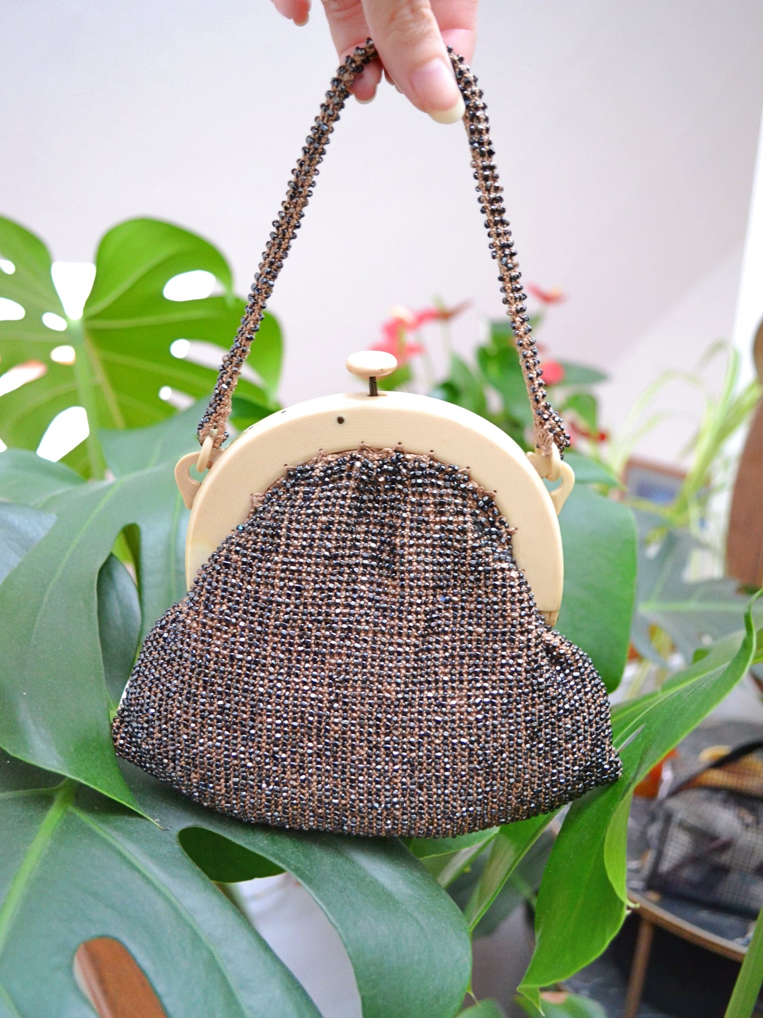 A beautiful 1930s evening handbag, with body constructed in crocheted silk yarn, with each stitch containing a twinkling graphite coloured glass bead. The silk jersey strap is detailed with handstitched beading also, and the piece is lined in cream silk, finished with floral trim. It's frame is a substantial 'Ivorine' crescent, ie celluloid imitating Ivory, with push-button release fastening.