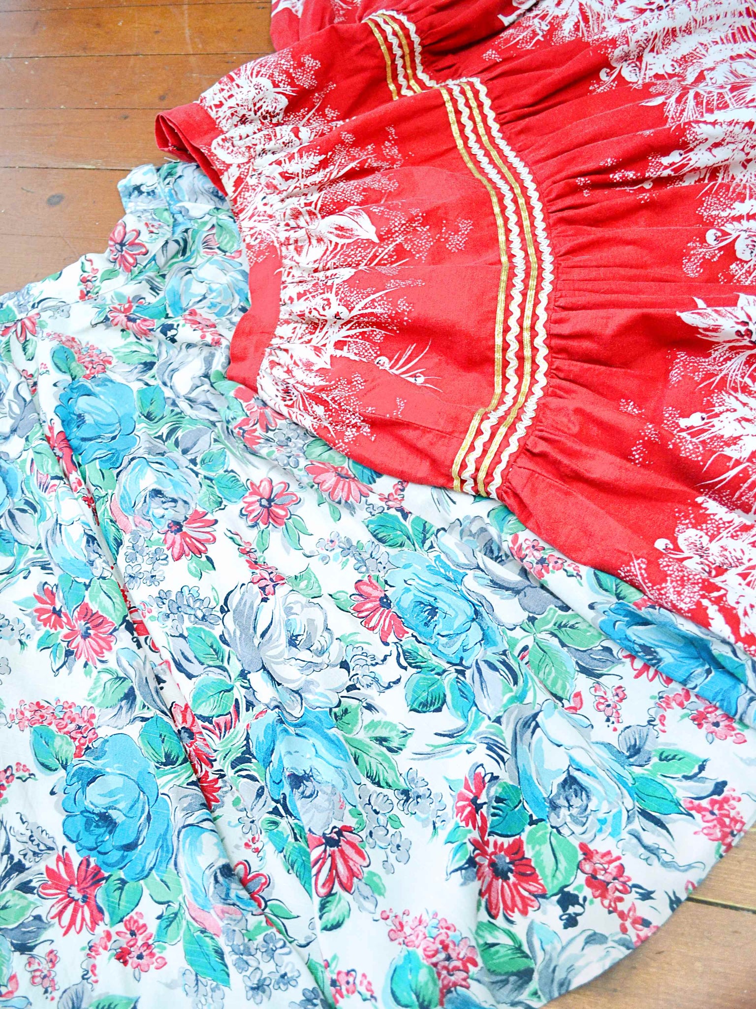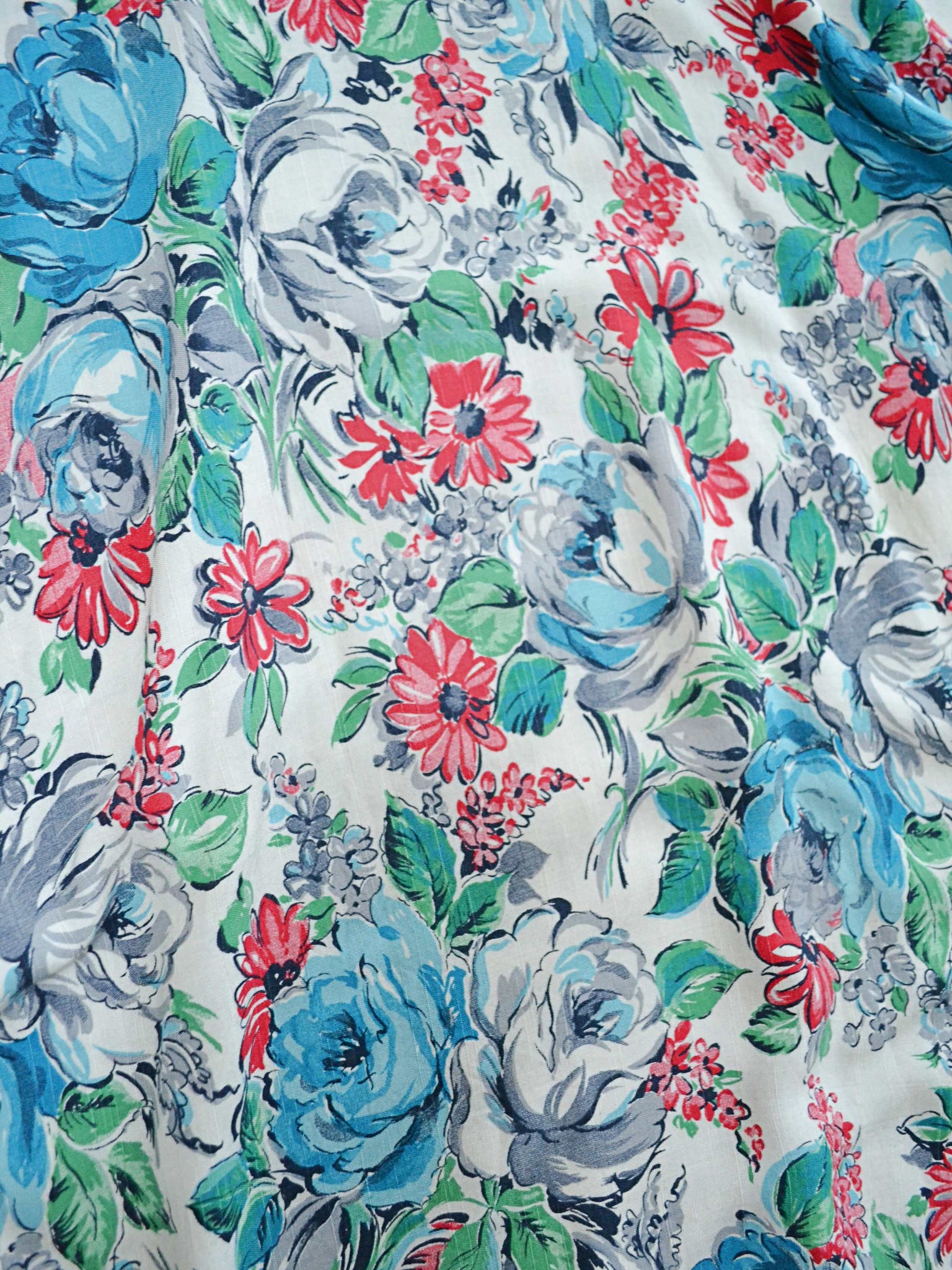 A lovely late 1940s early 50s full circle skirt in rayon with lovely weight, printed with pretty florals in red/blues/white against pale cream. With metal zip to fasten at side, and handworked loops for hooks.