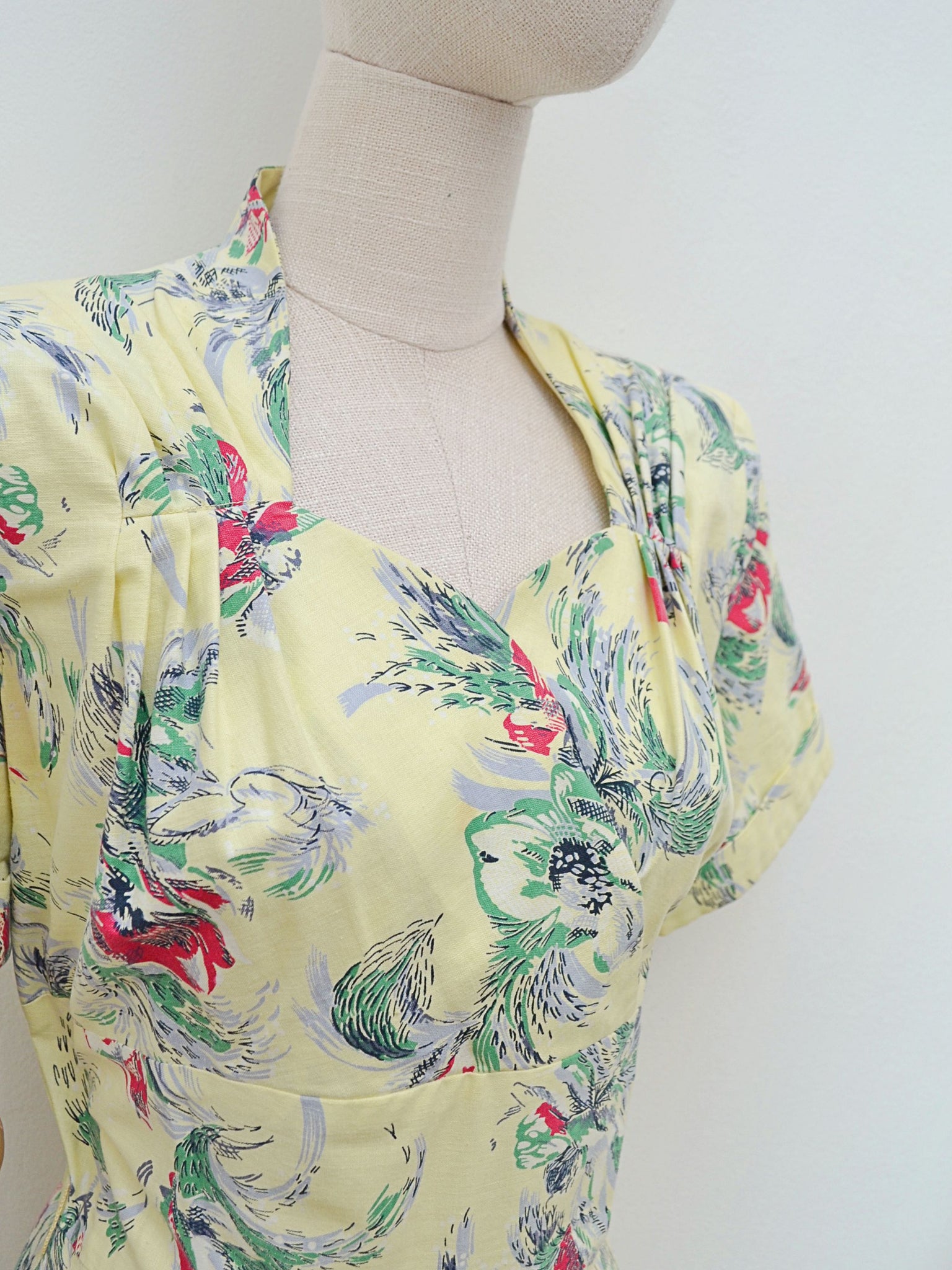 A pretty day dress from “Ivis model, Mayfair” label, in pale citrus yellow cotton printed with abstracted painterly florals in reds and greens. With short cuffed sleeve and neckline pleated into sweetheart cut, skirt is lightly gathered to crescent shaped hip seming, and fastens with side metal zip.