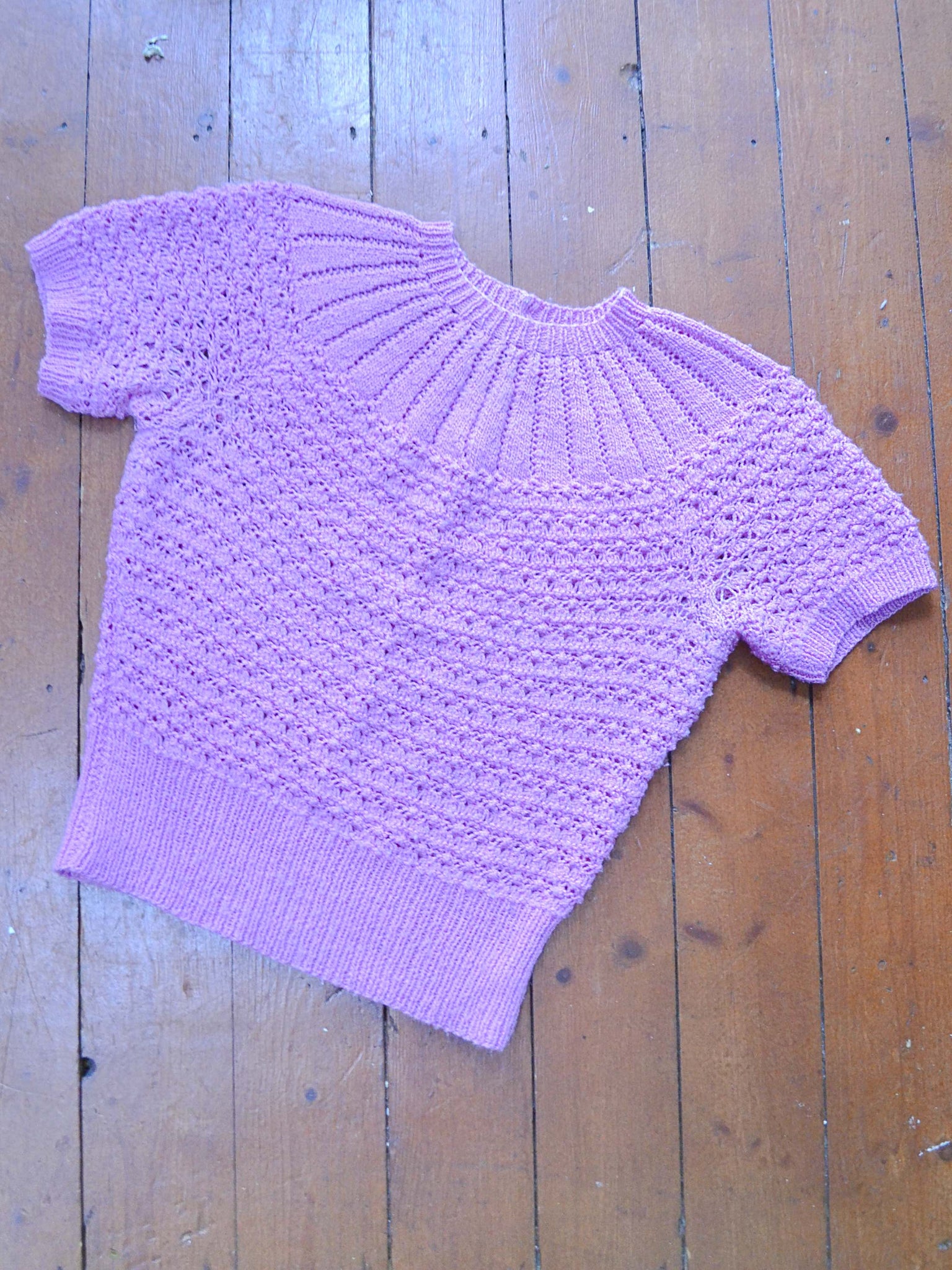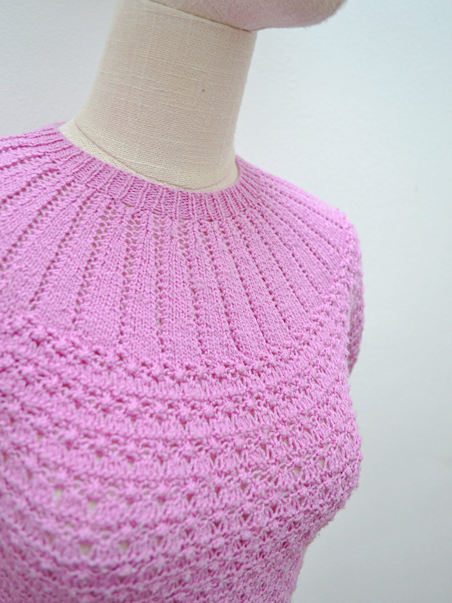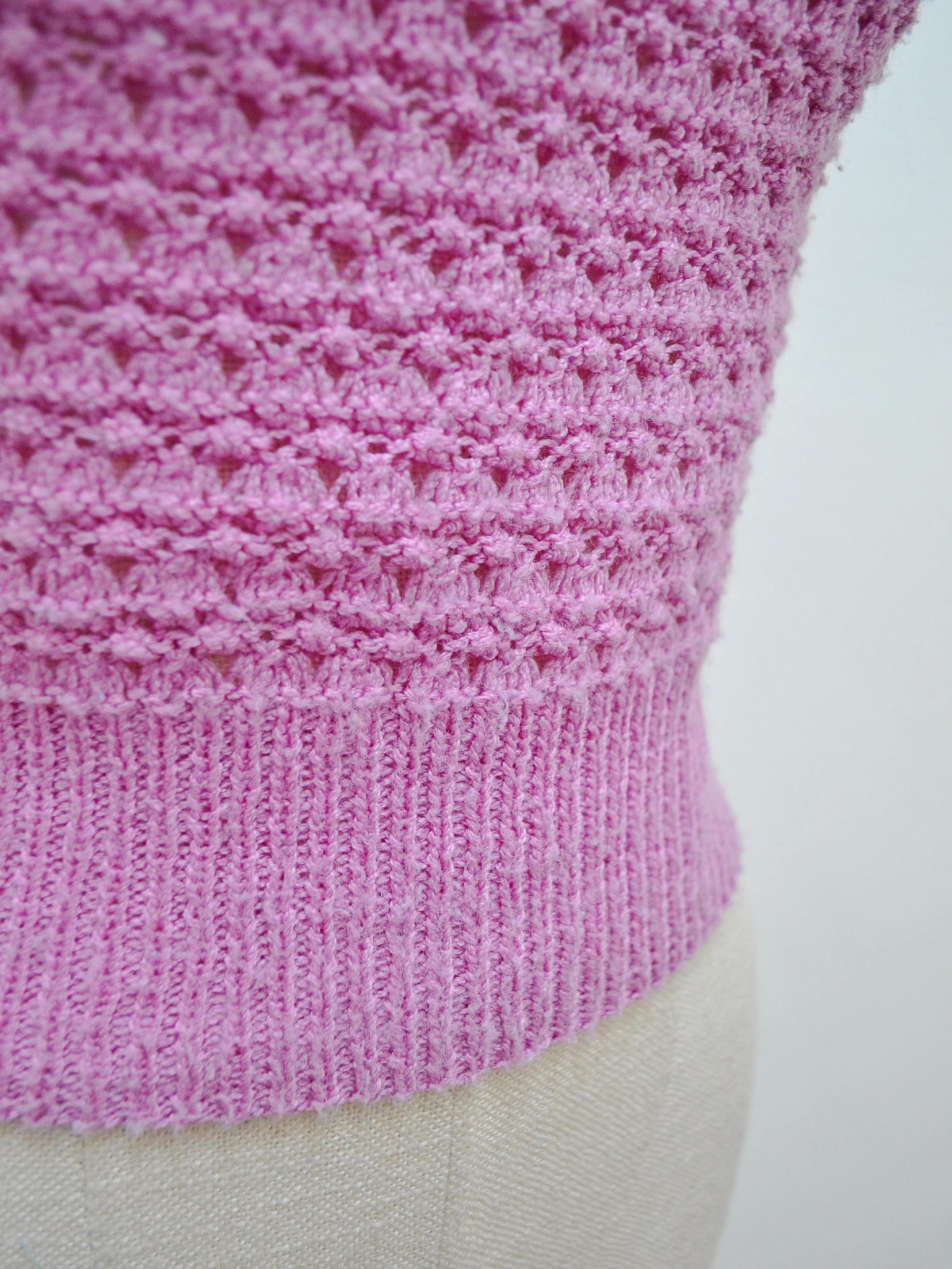 A sweet short sleeved sweater top, handknitted in pink yarn, feels like a good quality soft acrylic. Very 1940s in style but I'm putting it a few decades later, with button fastening to back neck. Looks the part with 30s-60s ensembles!