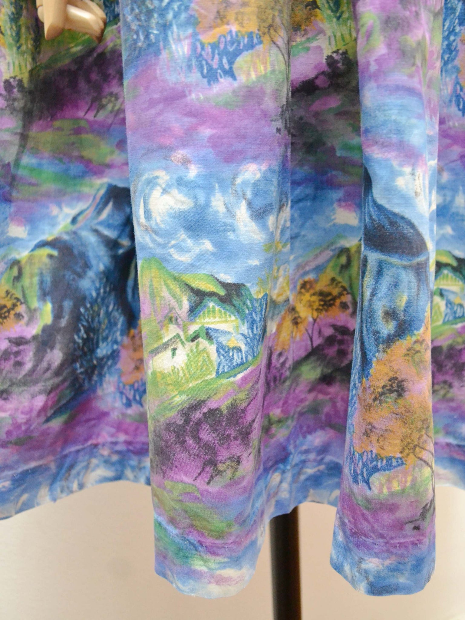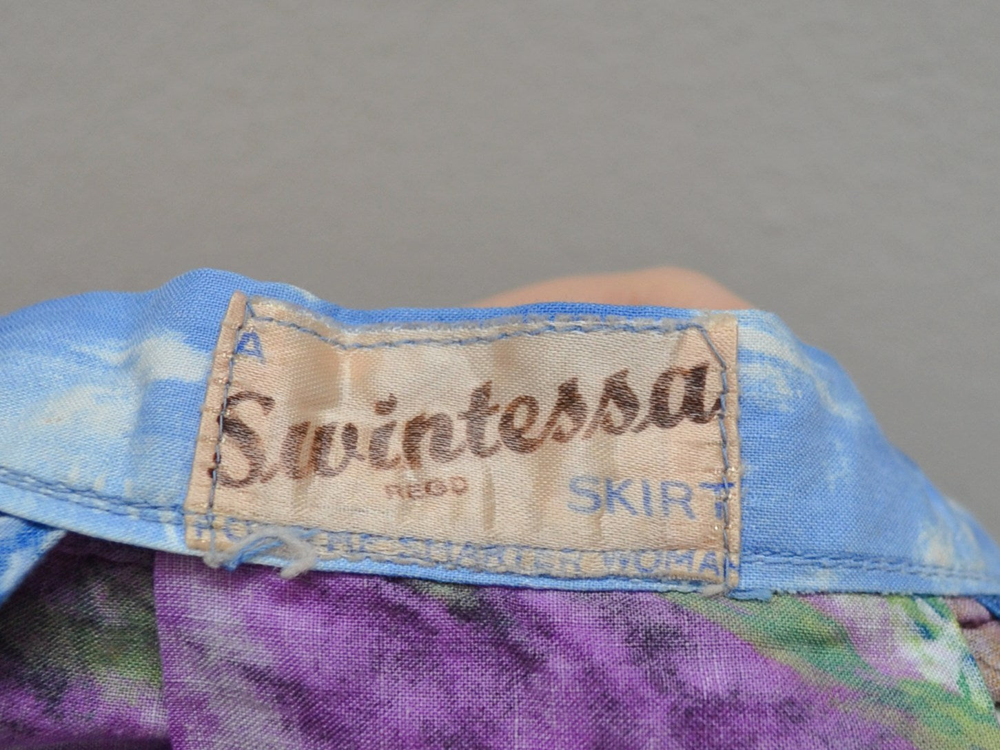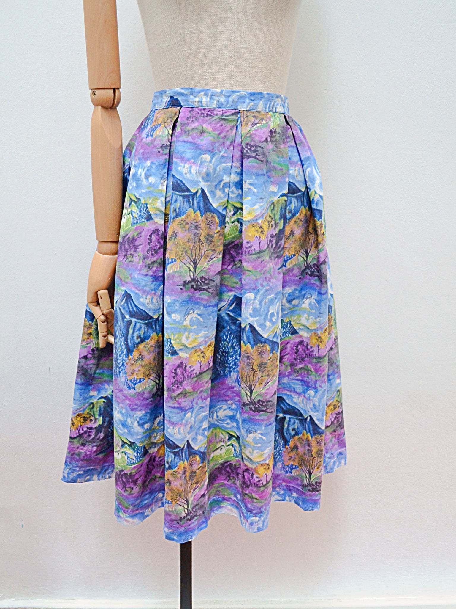An eyecatching day skirt circa late 50s early 60s, printed in pretty colourway of blues ad purples, depicting mountain scene with rustic dwellings nestled inbetween. Pleated for fulness, with button and side zip fastening, which is an early nylon example with metal pulley. ‘Swintesas’ label, which sweetly reads “for the smarter woman”!