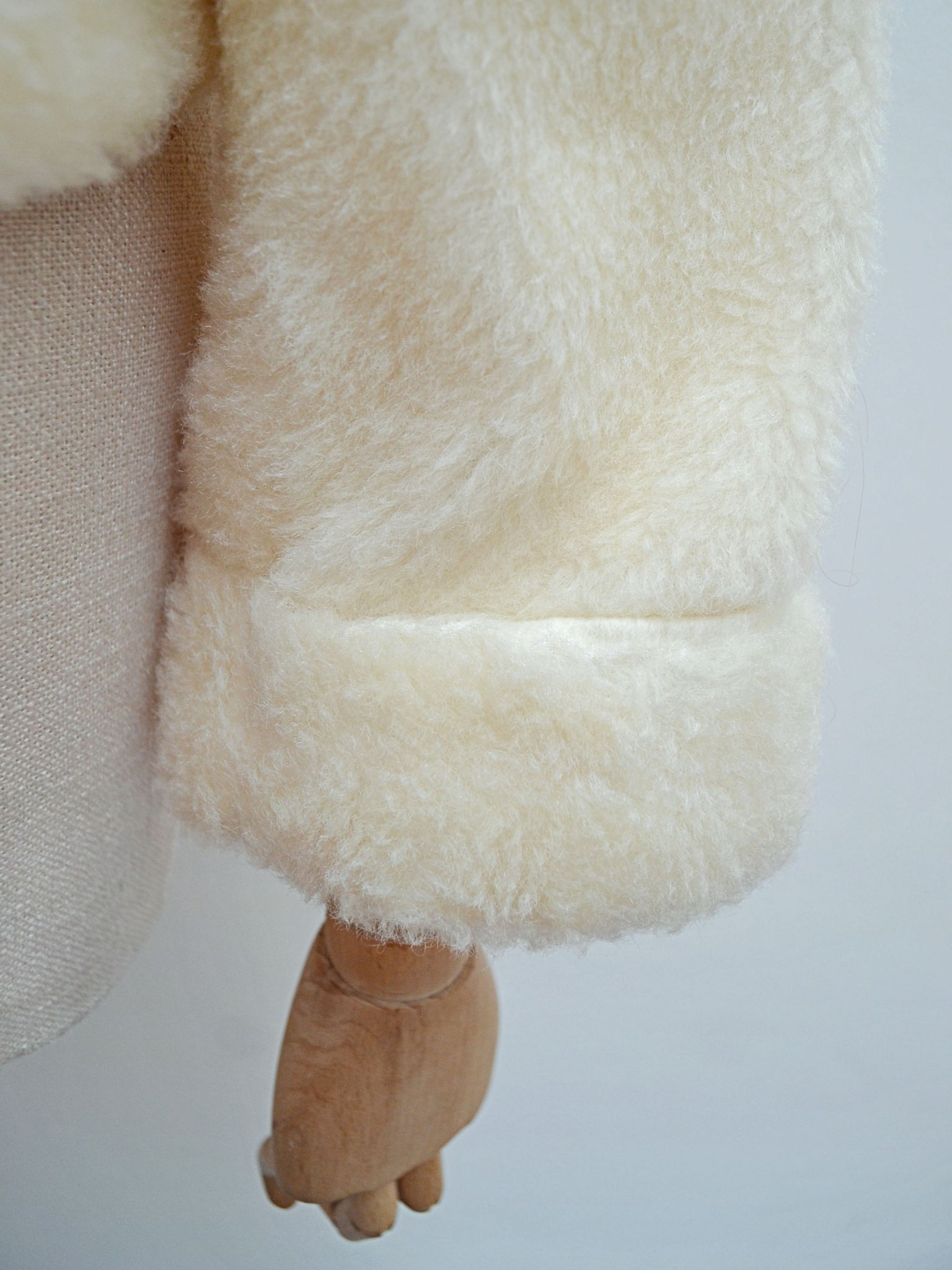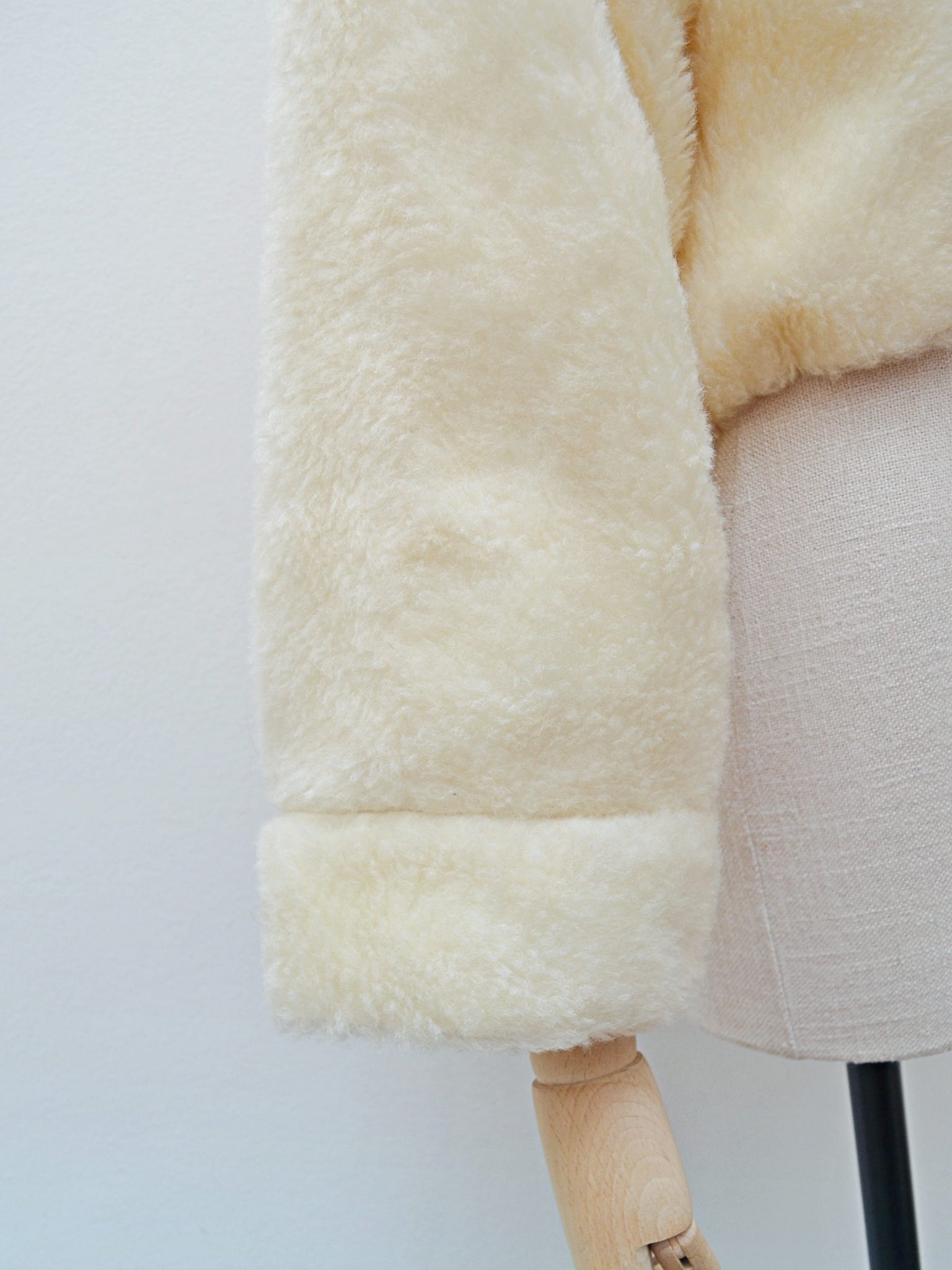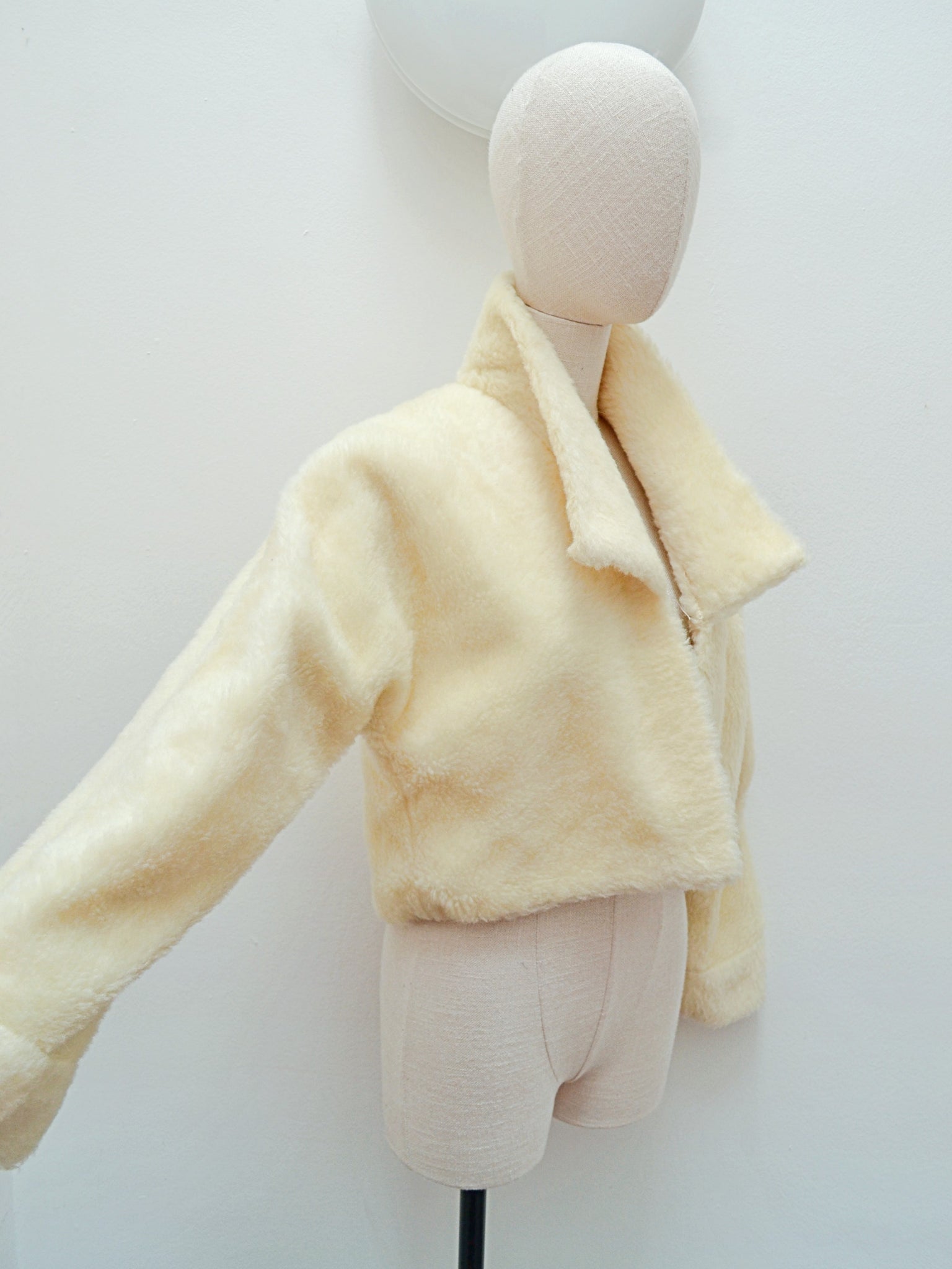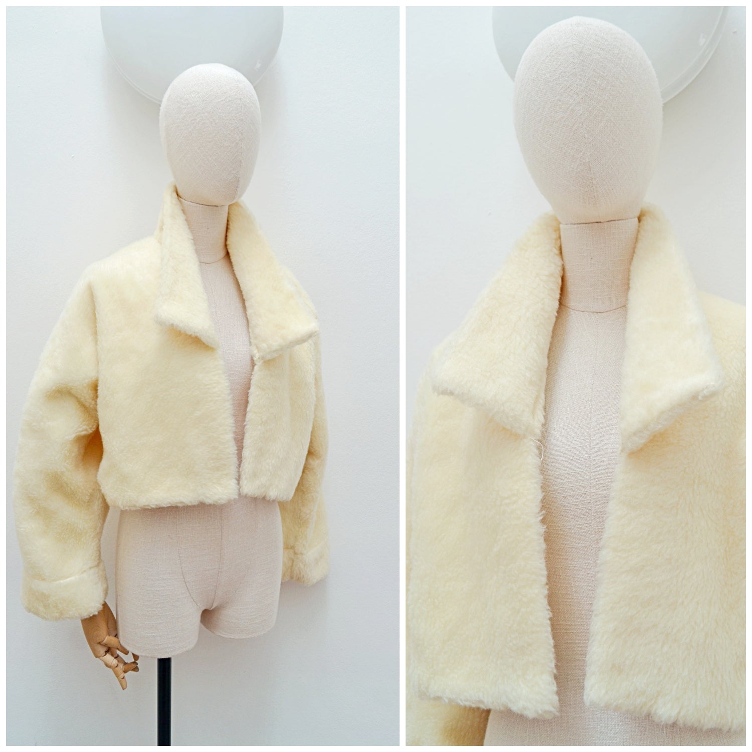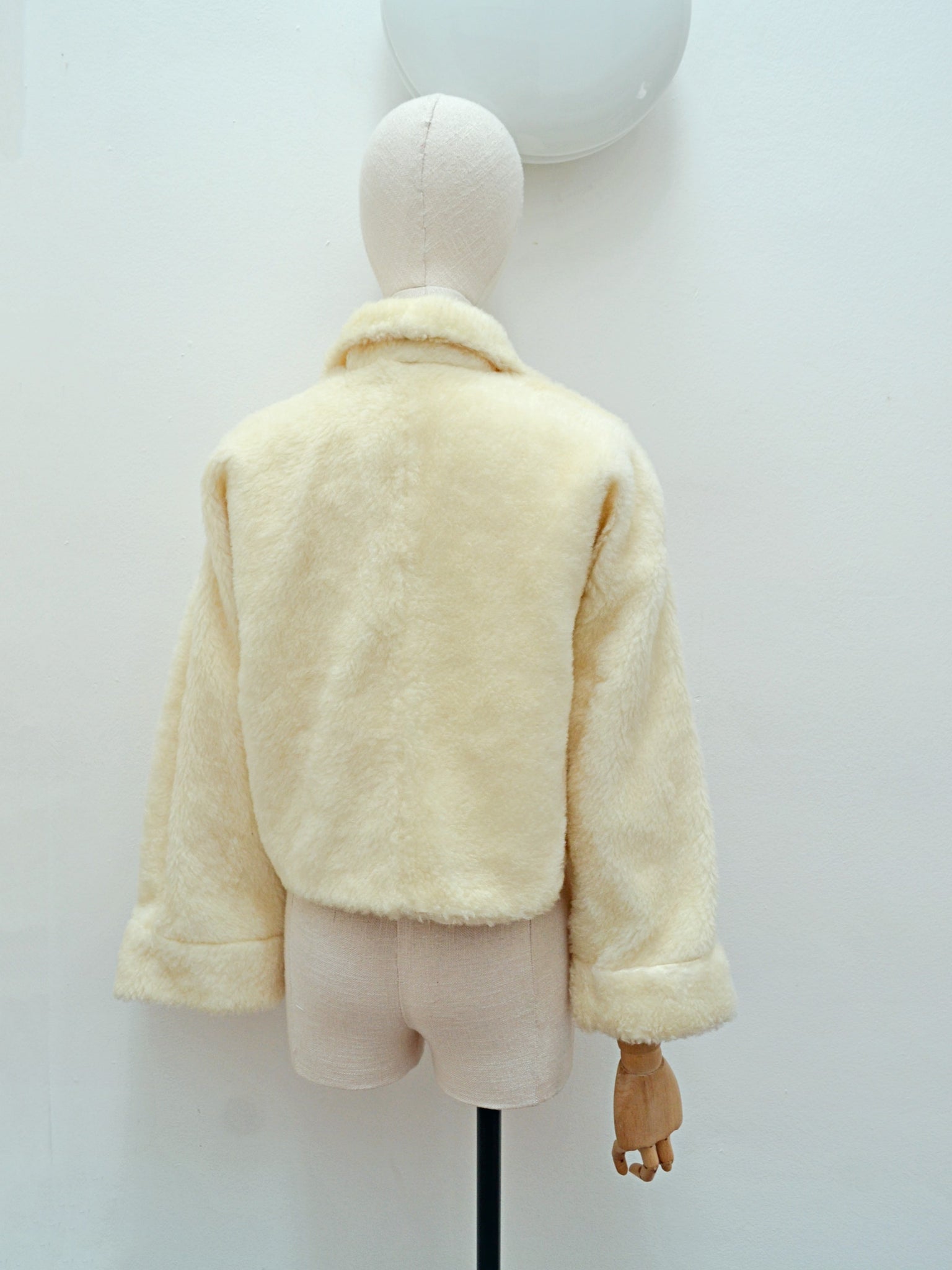 A cosy and chic 1950s waist length jacket, in cream soft mohair pile ‘faux fur’, open fronted ie no fastenings. With collar able to be worn popped for some drama, wide sleeve cut in one with the body, and mock cuffs.