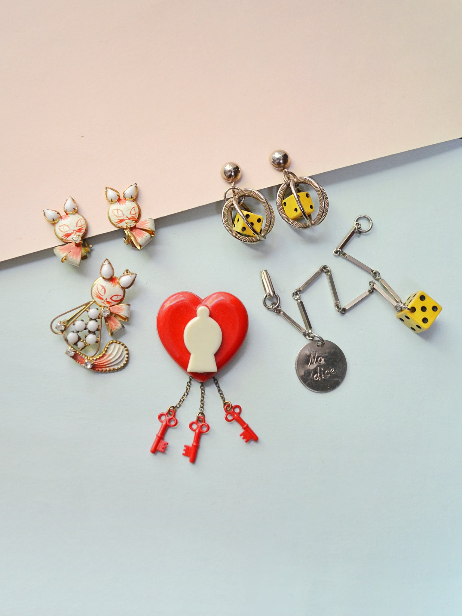 A fabulous 1950s costume jewellery set, with novelty theme of pampered kitties wearing bows around their necks. Brooch is formed from goldtone wire, body picked out in small prong-set milk glass cabochons, with domed metal face handpainted with delicate features in coral pink. Earrings feature the same painted domes, and teardrop shaped glass ears, with clip backs. Twinkling clear rhinestones finish the neck bows and tail.