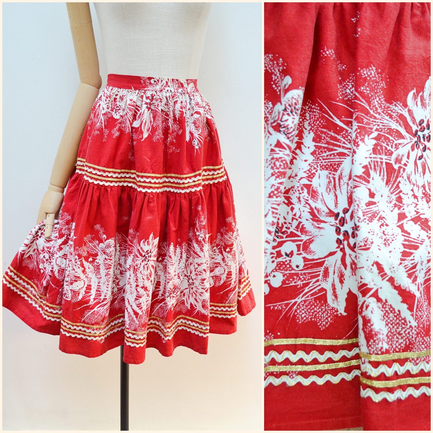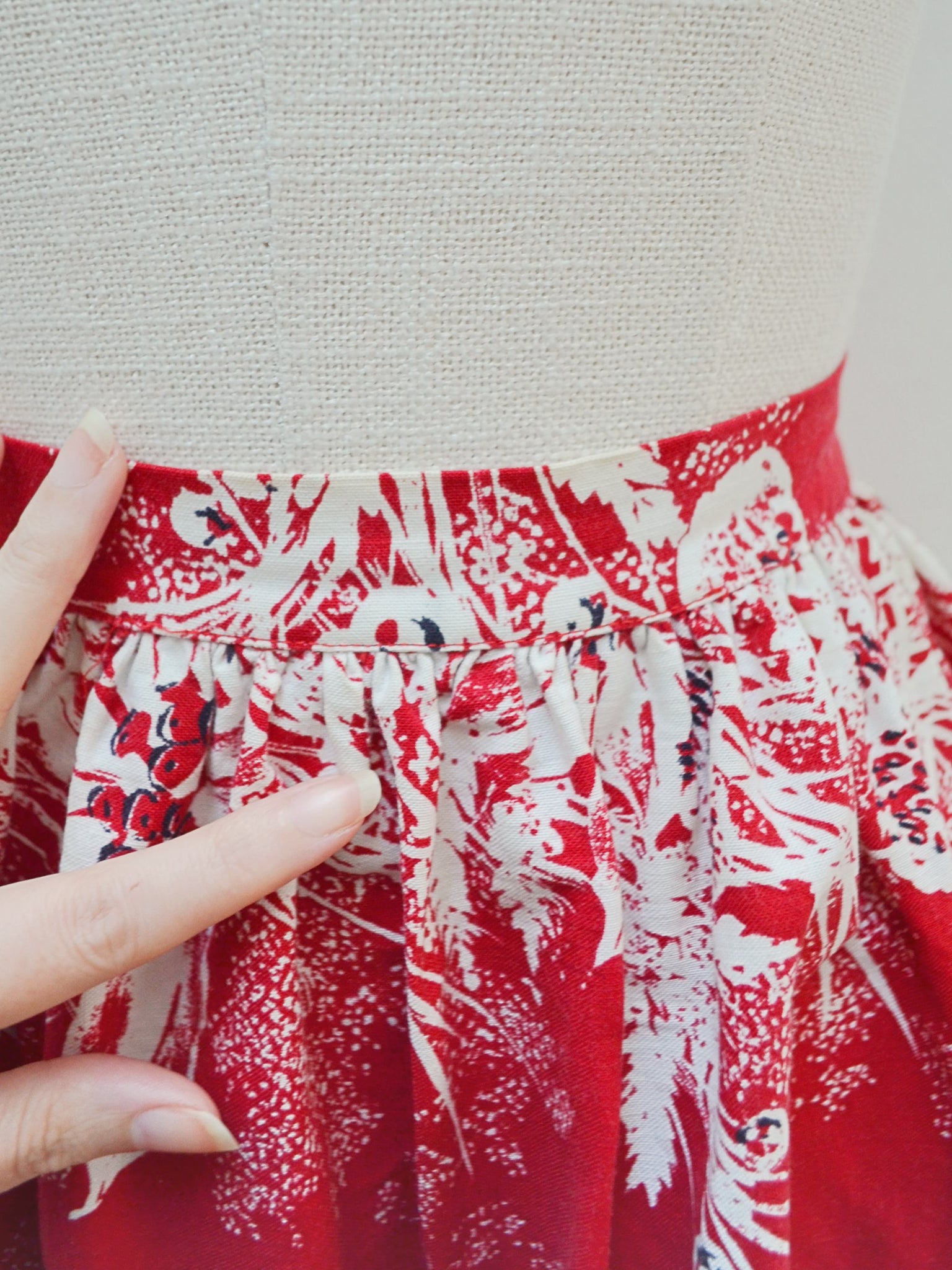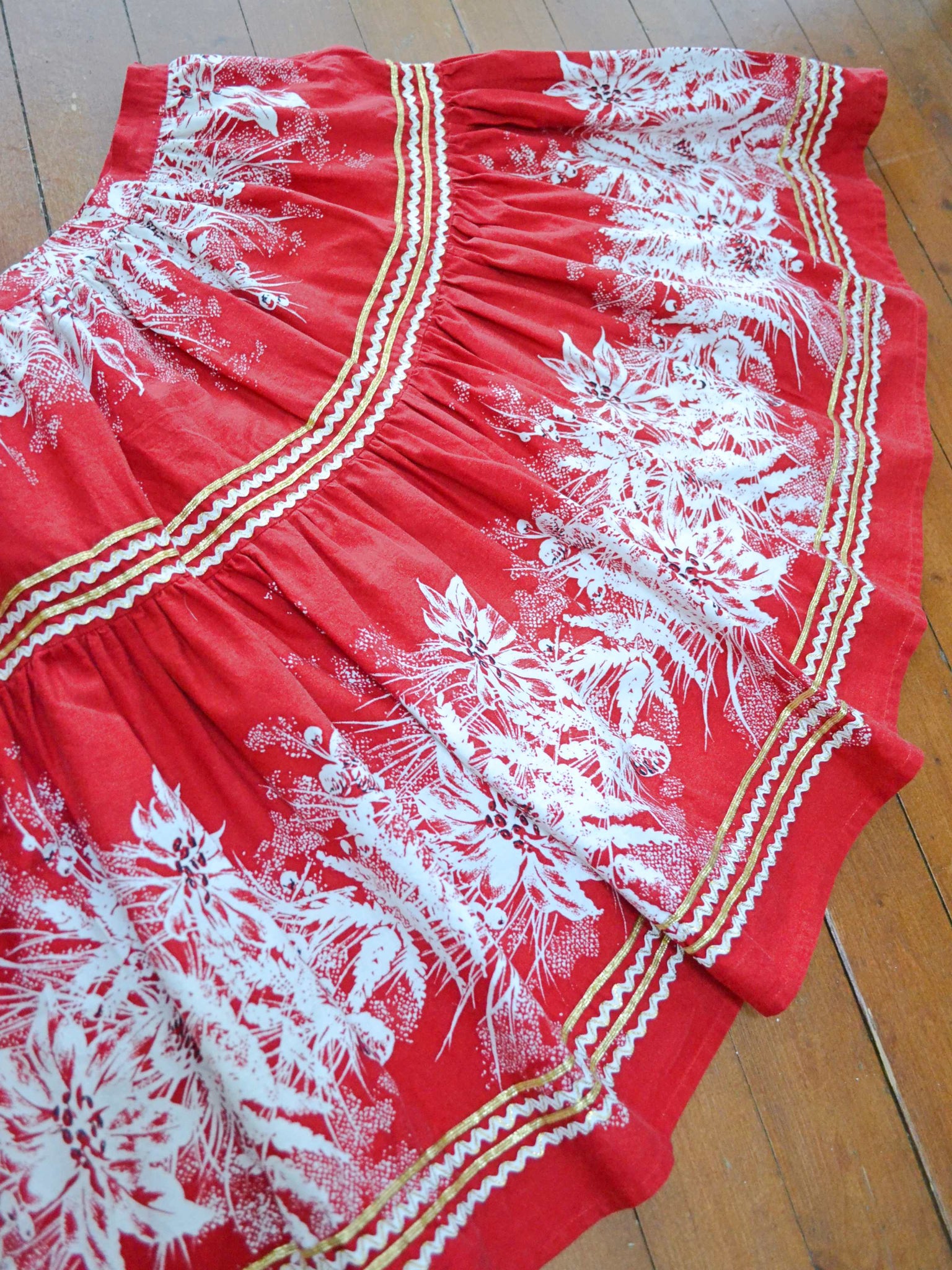 A gorgeous 1950s patio style skirt, in bright red cotton printed with sprays of florals/berries/wheatshafts in white and black. Festive-friendly as the florals resemble Poinsettias, and lurex braid and ricrac details each tier in white and gold. Side metal zip to fasten.