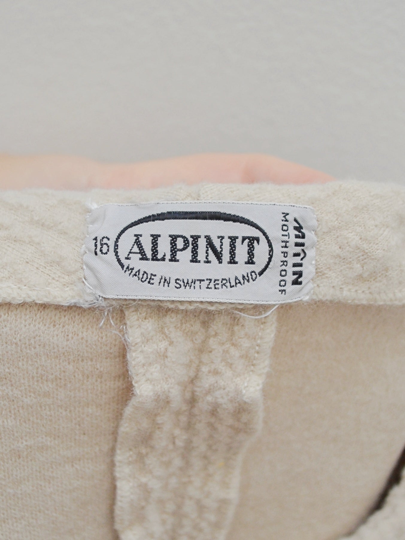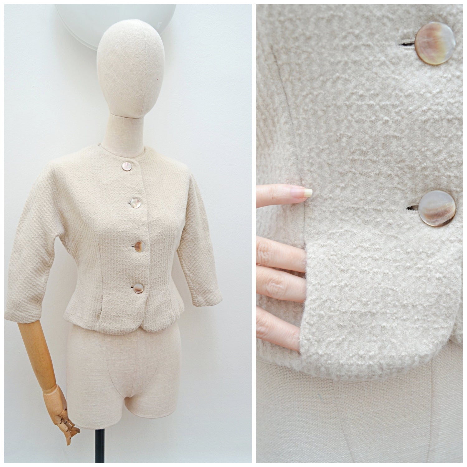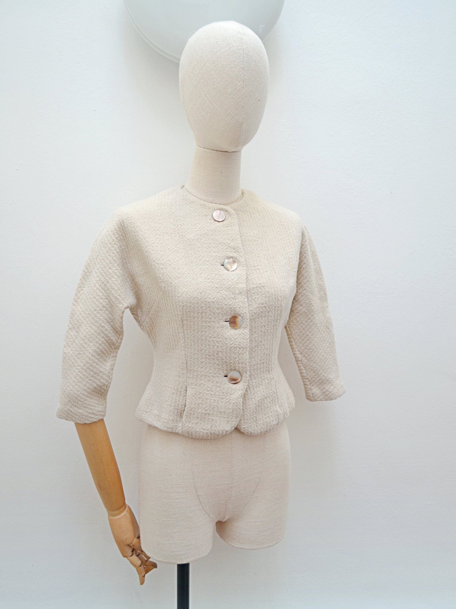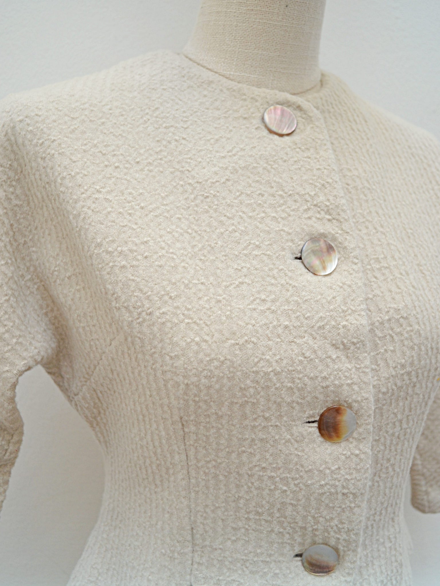 A chic little early 1960s day jacket in waffle texture jersey, a versatile shade of putty-cream/dove, from ‘Alpinit’ label. Fitted, with dolman 3/4 length sleeve, and button fastening. Plus pockets! Unlined