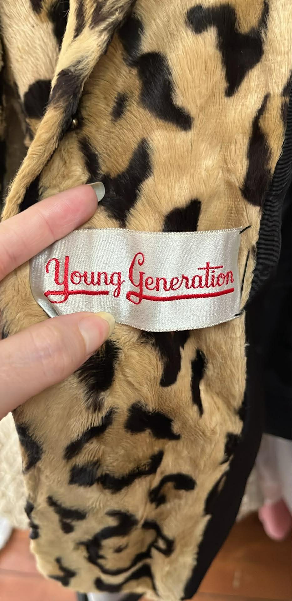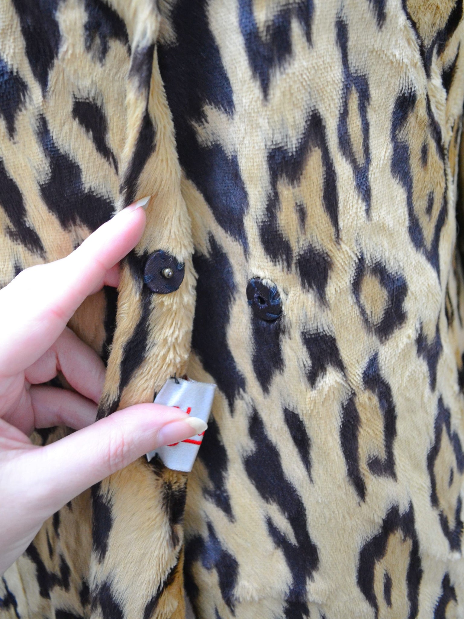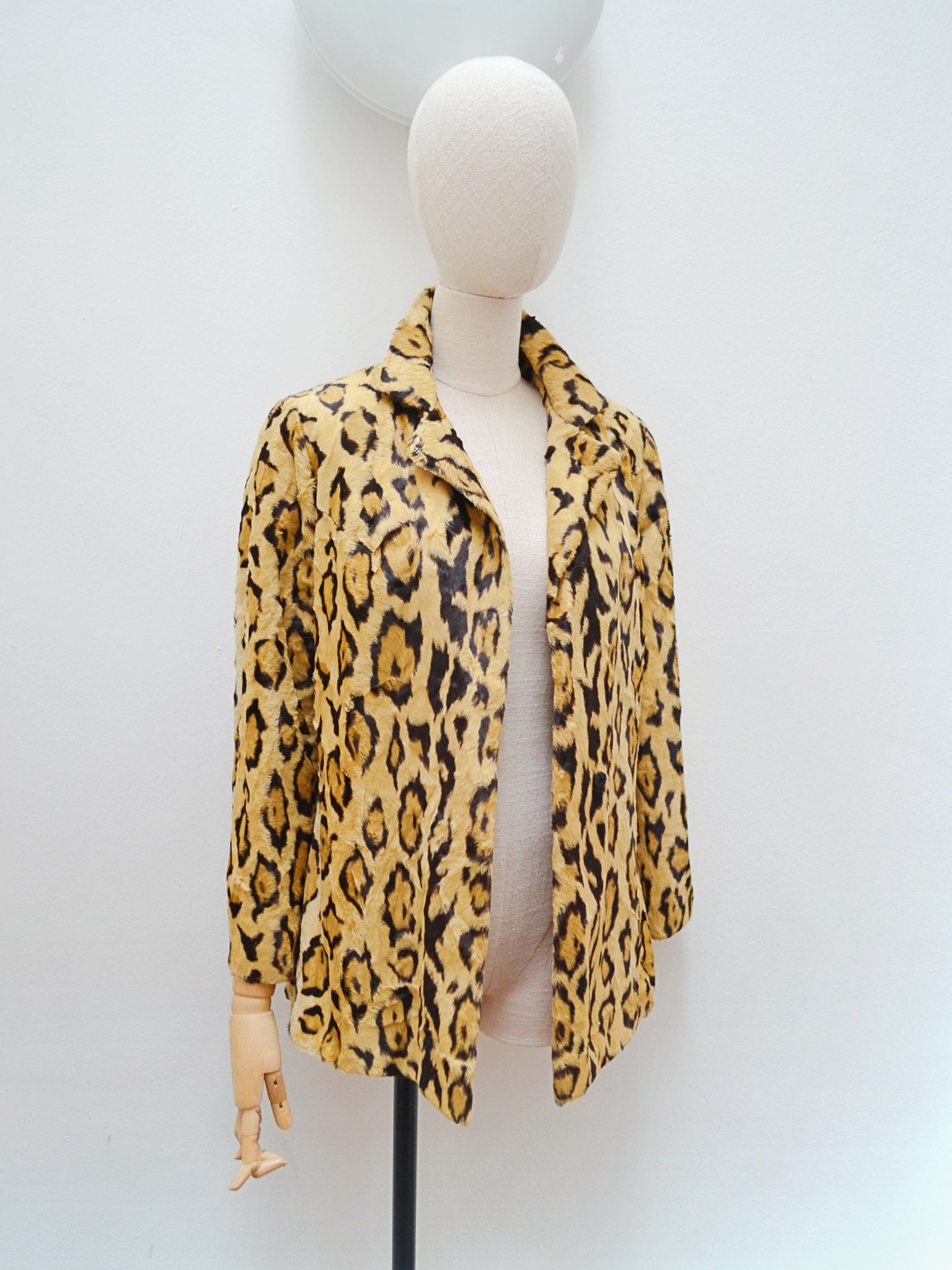 A gorgeous early 1960s short jacket from ‘Cole Of Columbus’ which was a womenswear & bridal store (a few pics of the facade attached!), from a ‘Young Generation’ range. In super soft leopard print velveteen, with the print wonderfully utilised to leave a black patterned stripe down the front. Only gently fitted, it fastens with hook and eye at the neck, and taffeta-covered popstud at the waist. Featuring small pointed collar, and pockets concealed in the side seams, the back is finished with deep vent. Lined in high quality taffeta feel lining. Will fit approx XS-S;
