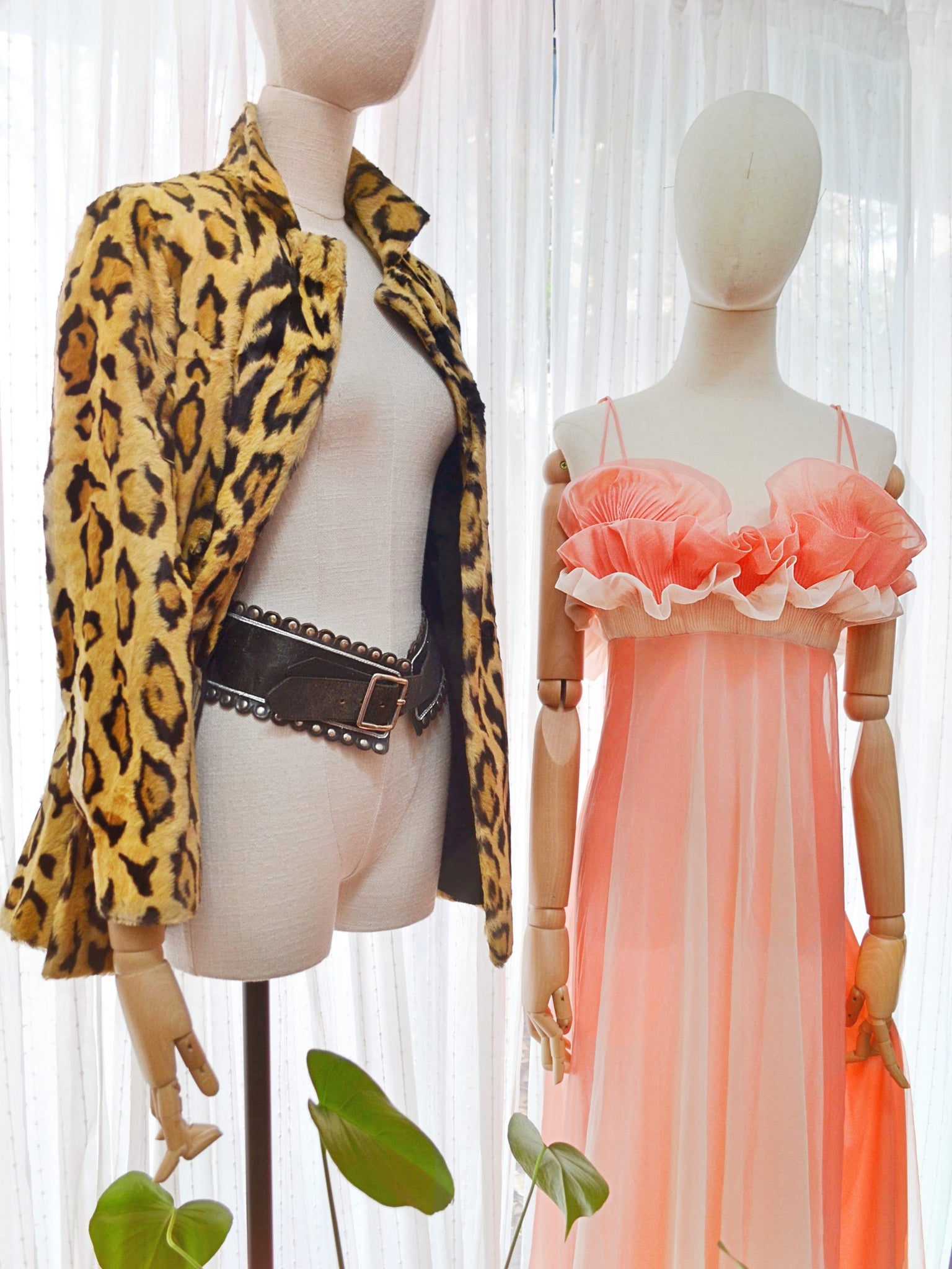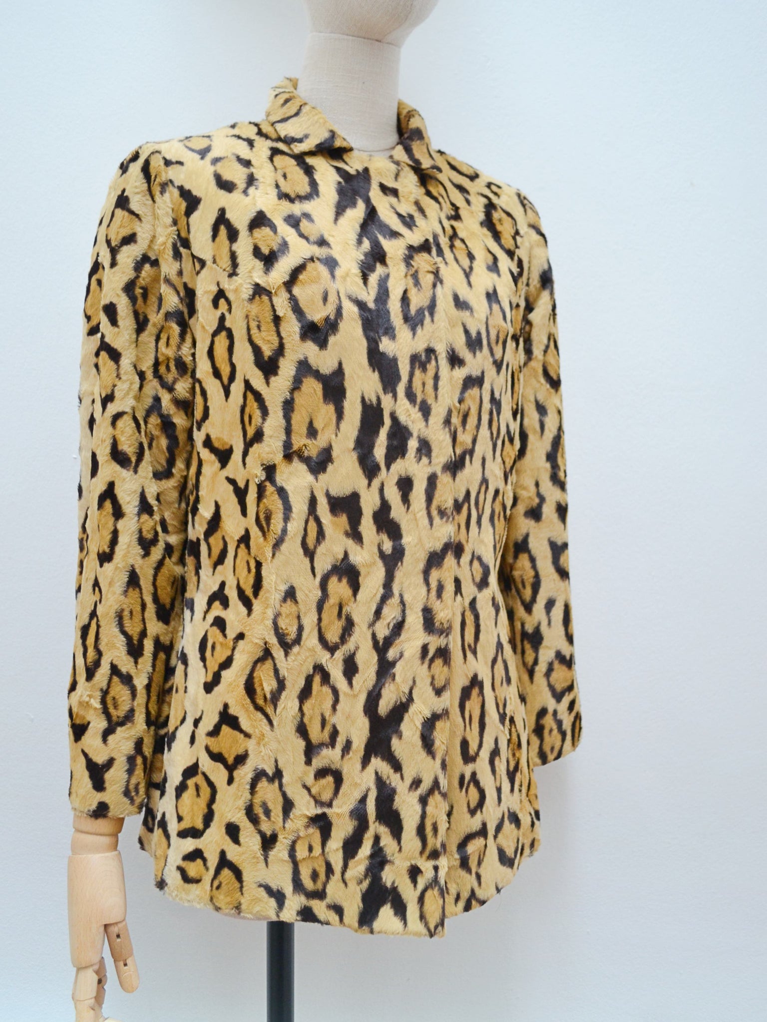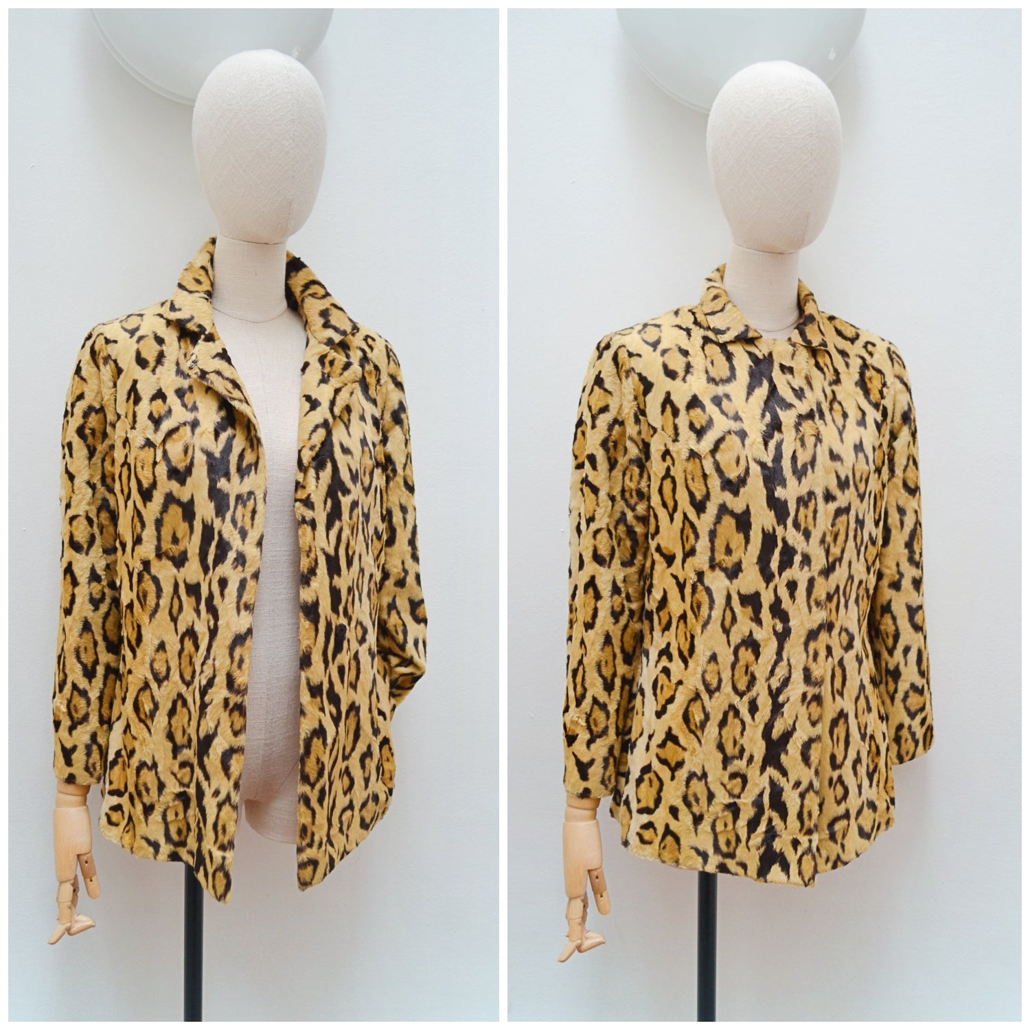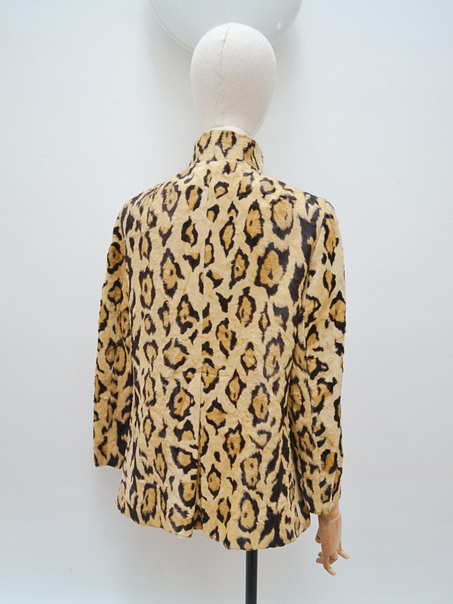 A gorgeous early 1960s short jacket from ‘Cole Of Columbus’ which was a womenswear & bridal store (a few pics of the facade attached!), from a ‘Young Generation’ range. In super soft leopard print velveteen, with the print wonderfully utilised to leave a black patterned stripe down the front. Only gently fitted, it fastens with hook and eye at the neck, and taffeta-covered popstud at the waist. Featuring small pointed collar, and pockets concealed in the side seams, the back is finished with deep vent. Lined in high quality taffeta feel lining. Will fit approx XS-S;