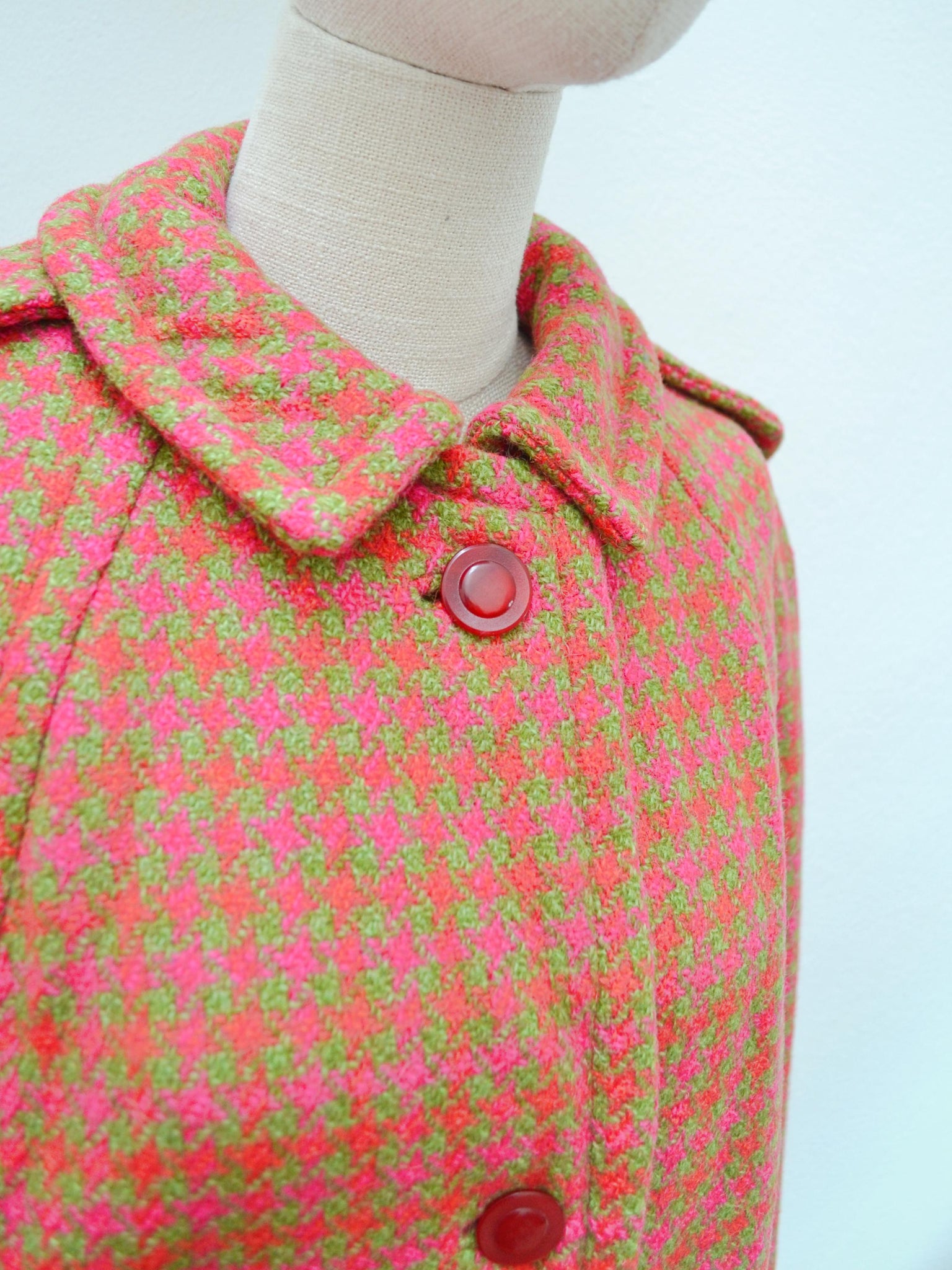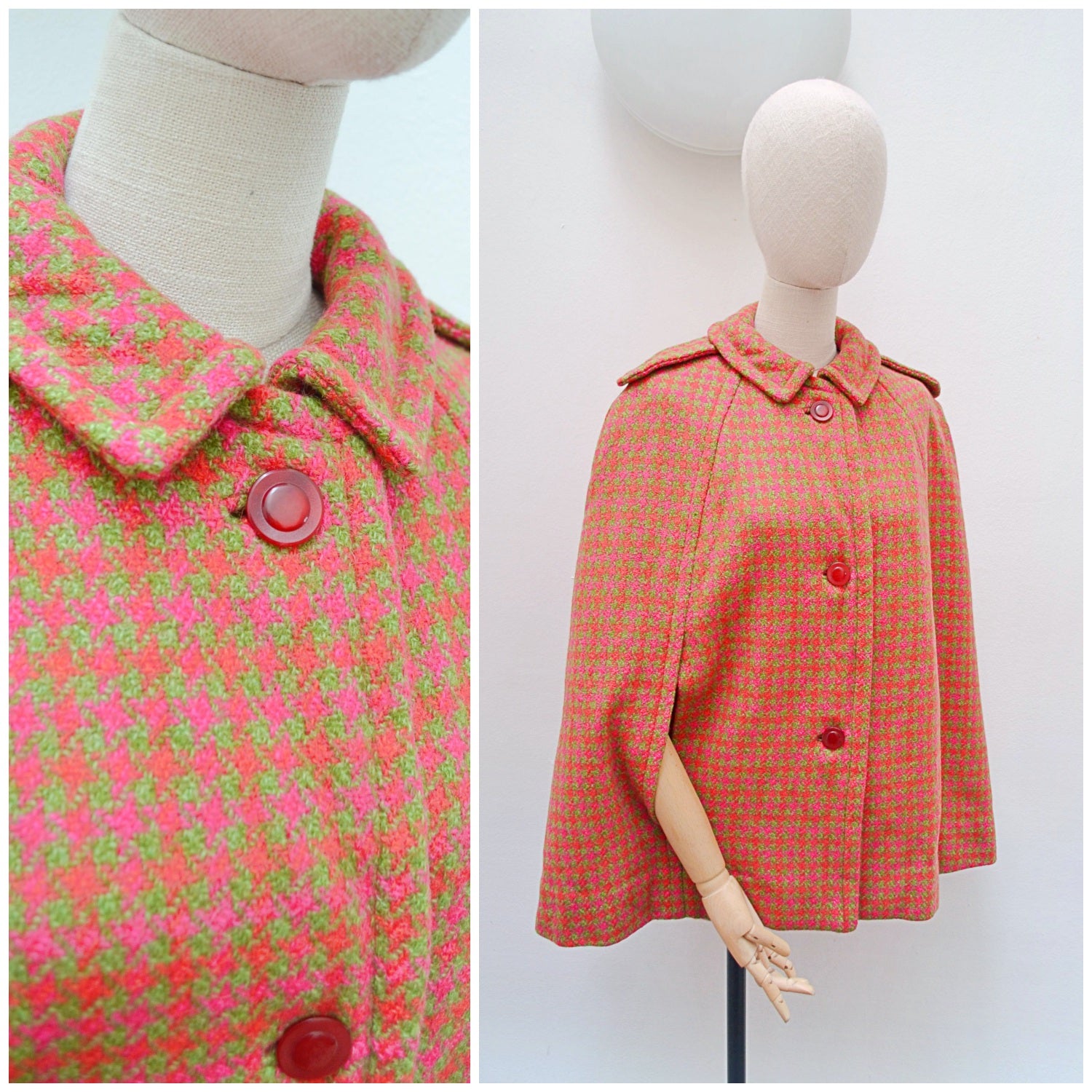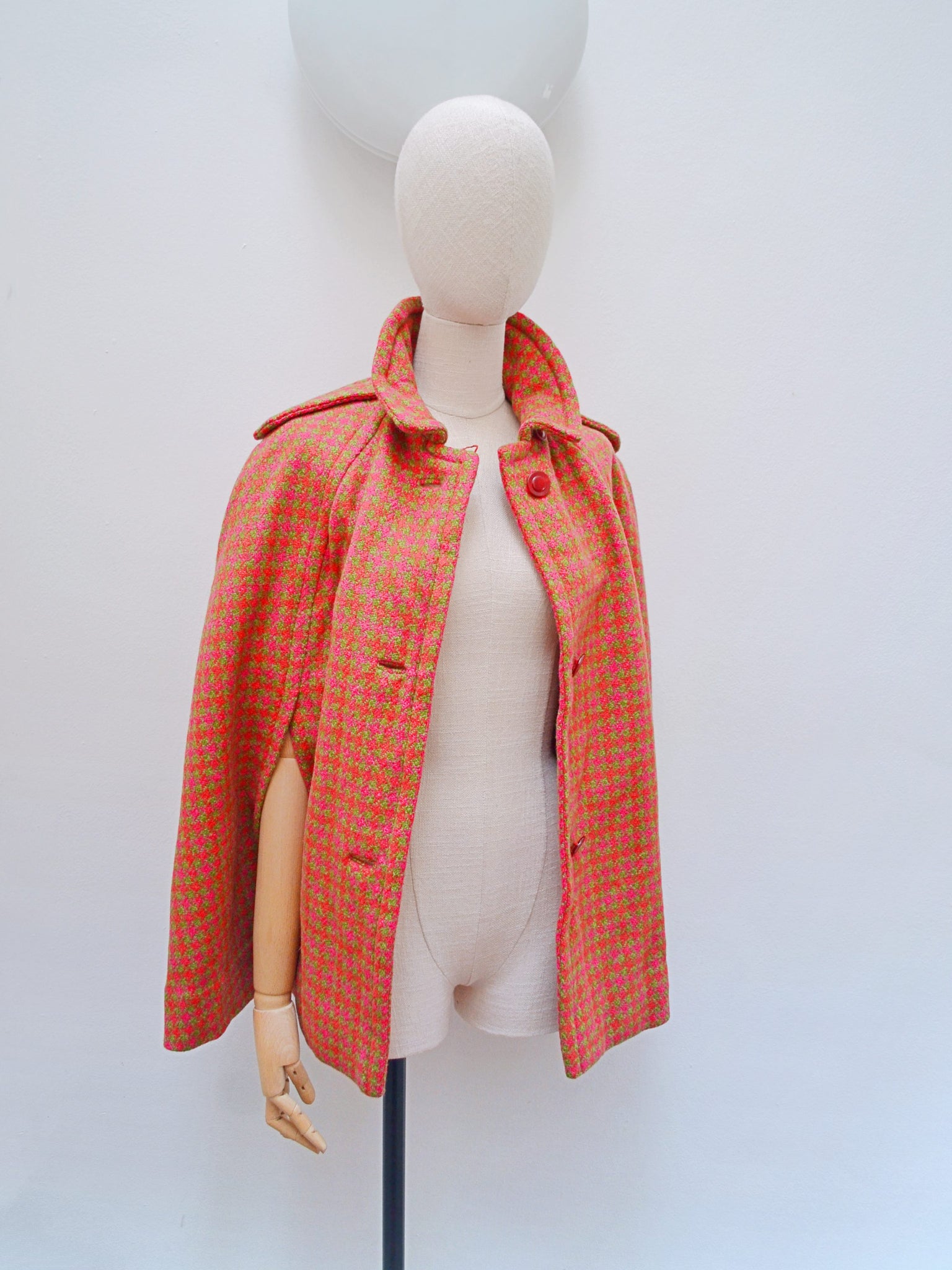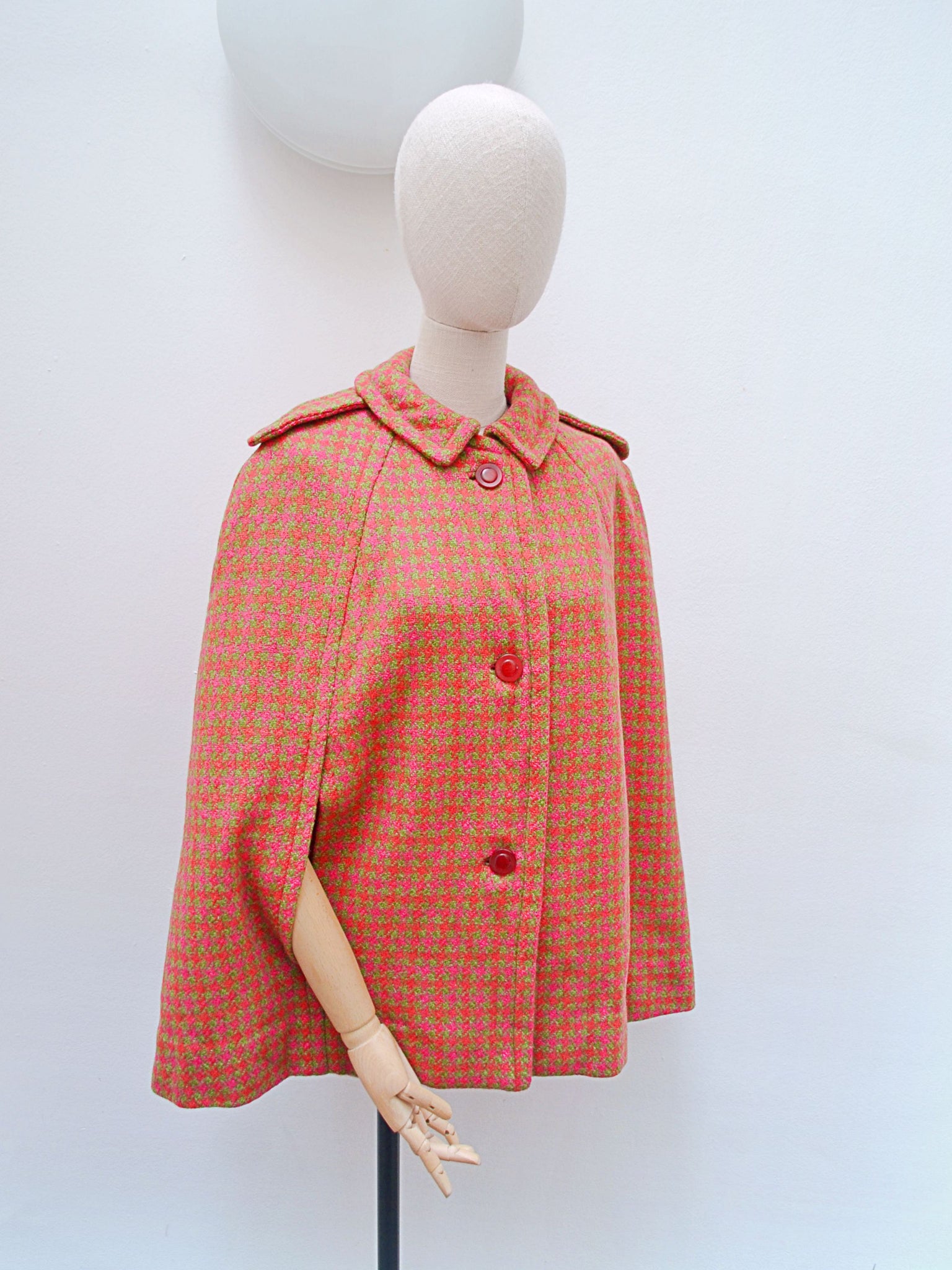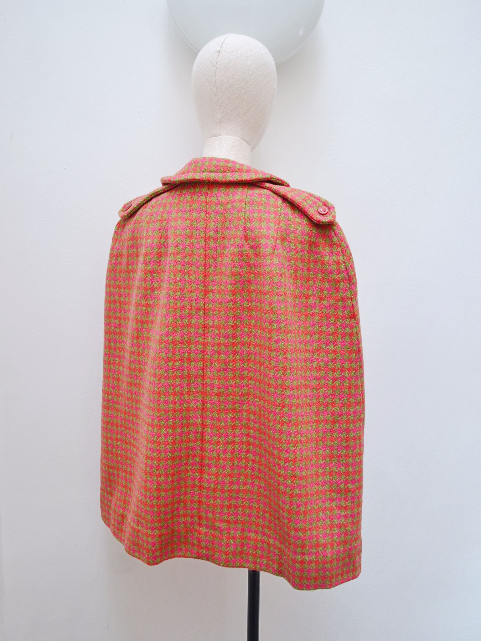 A chic 1960s hip length cape, in the best colourway of pink and orange against sage green. Fastening with pink buttons to front, and shoulder epaulet details, arms pass through front slits and it is lined in red.