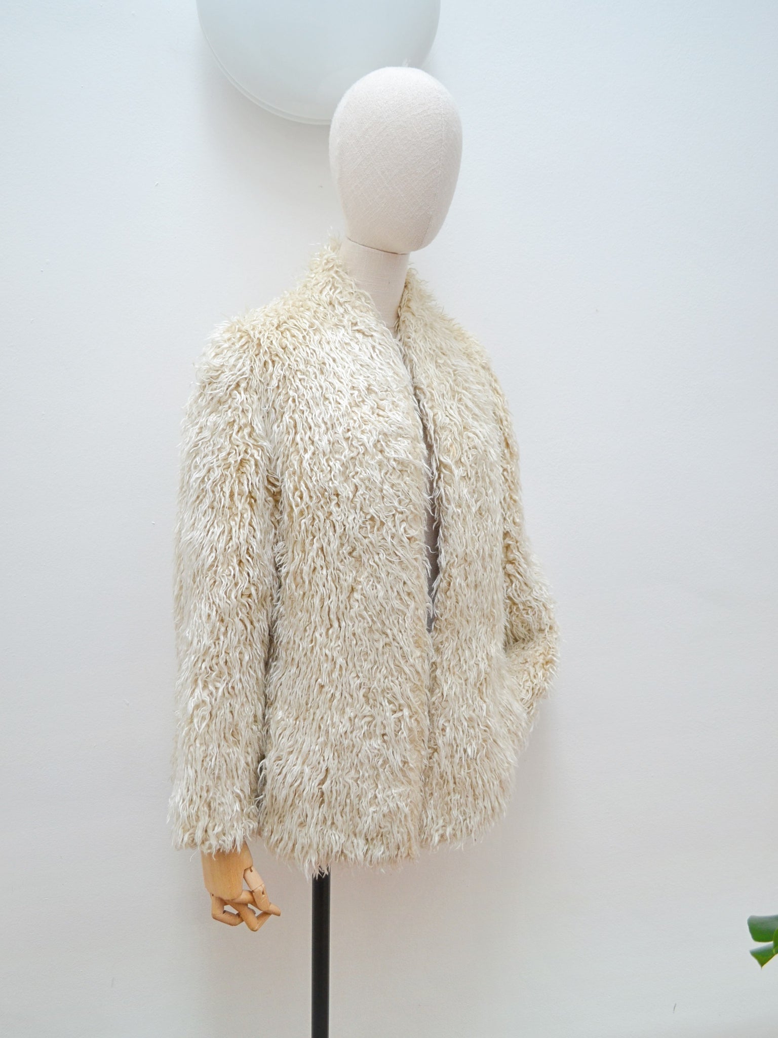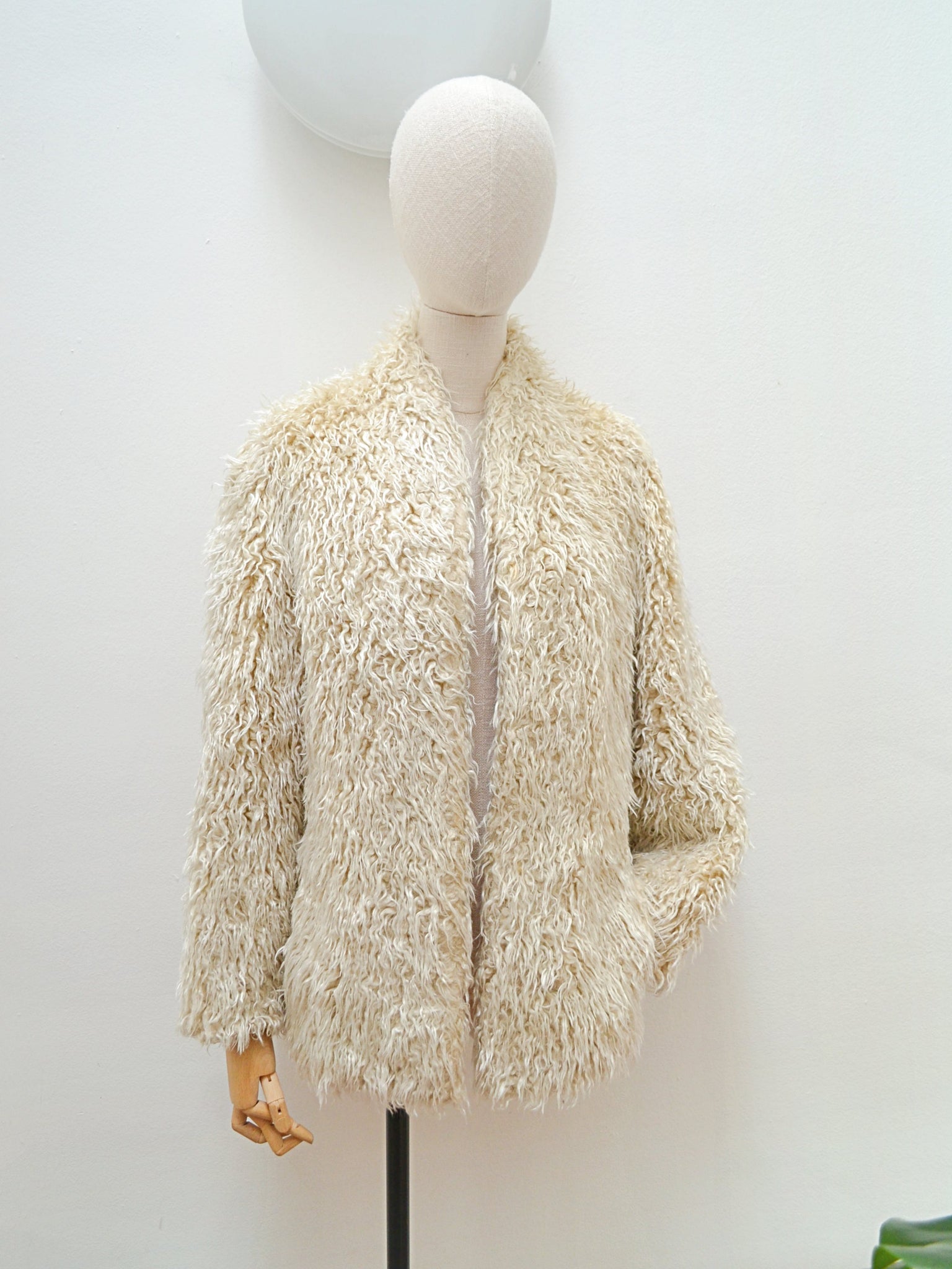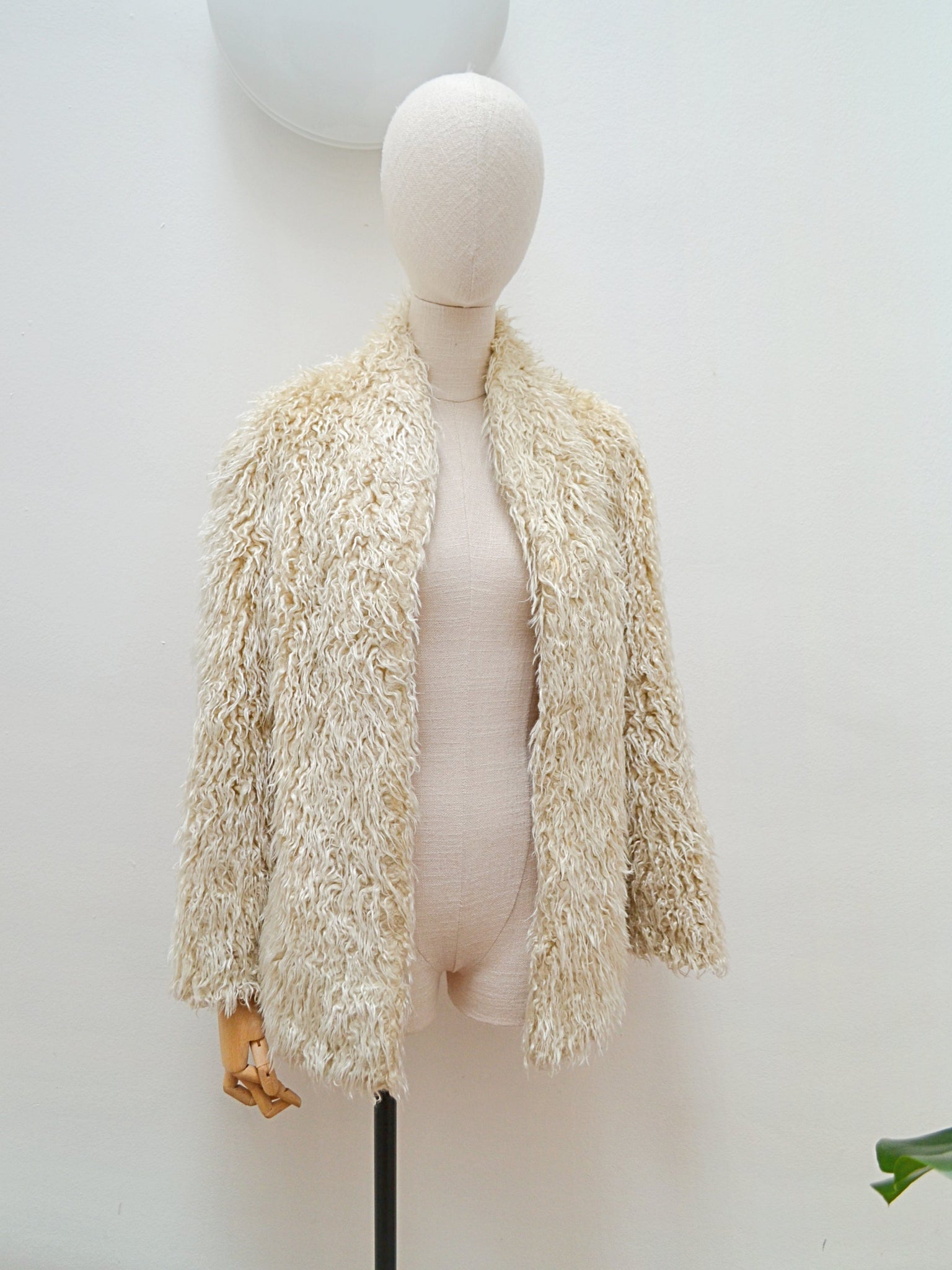 A funky late 1970s spring-weight jacket from my favourite name in faux fur, Astraka, in playful fluffy imitation shaggy sheepskin. Open fronted, it's a hip length unfitted cut, with side pockets hidden in the seaming, and satin lining.