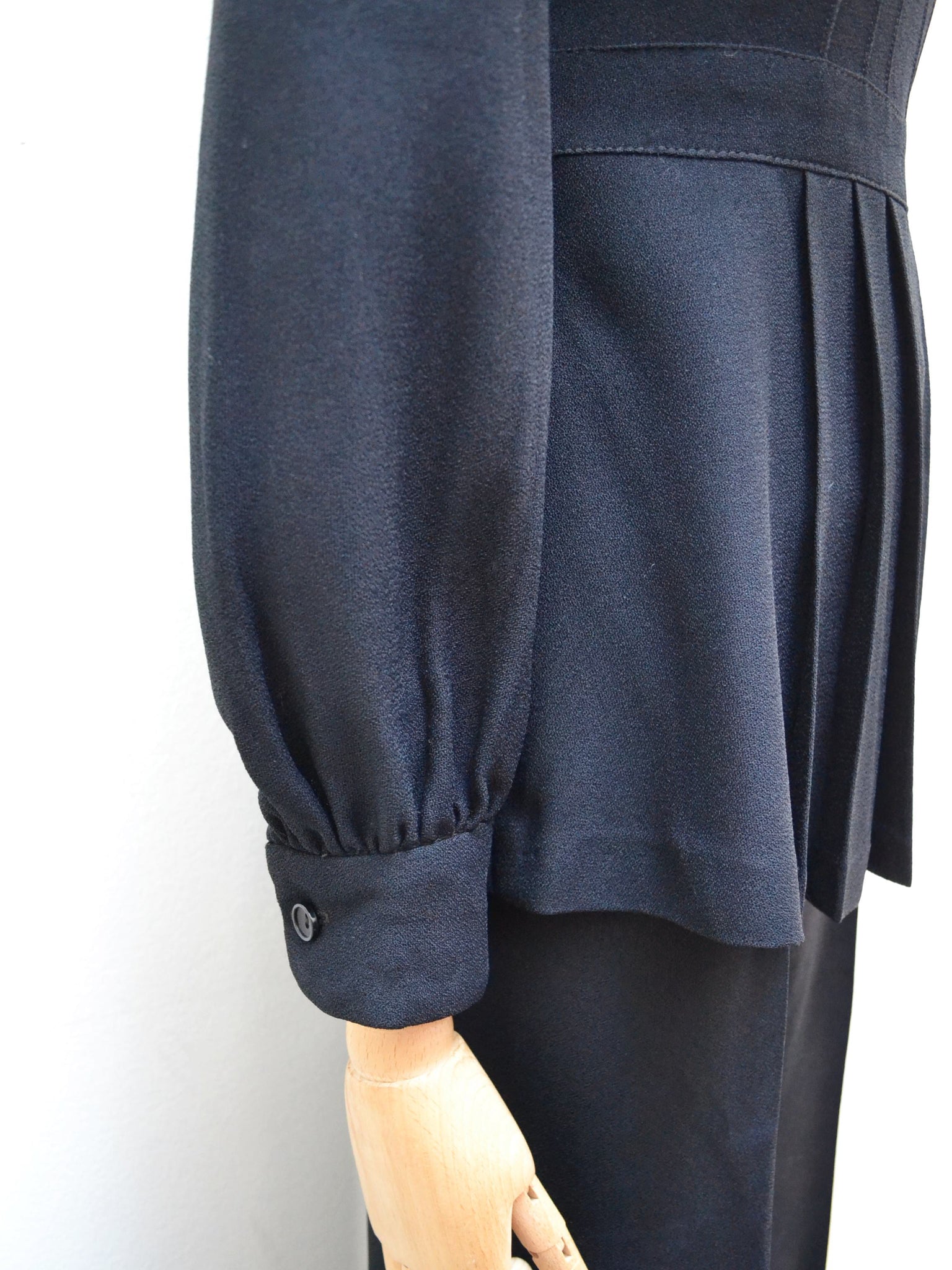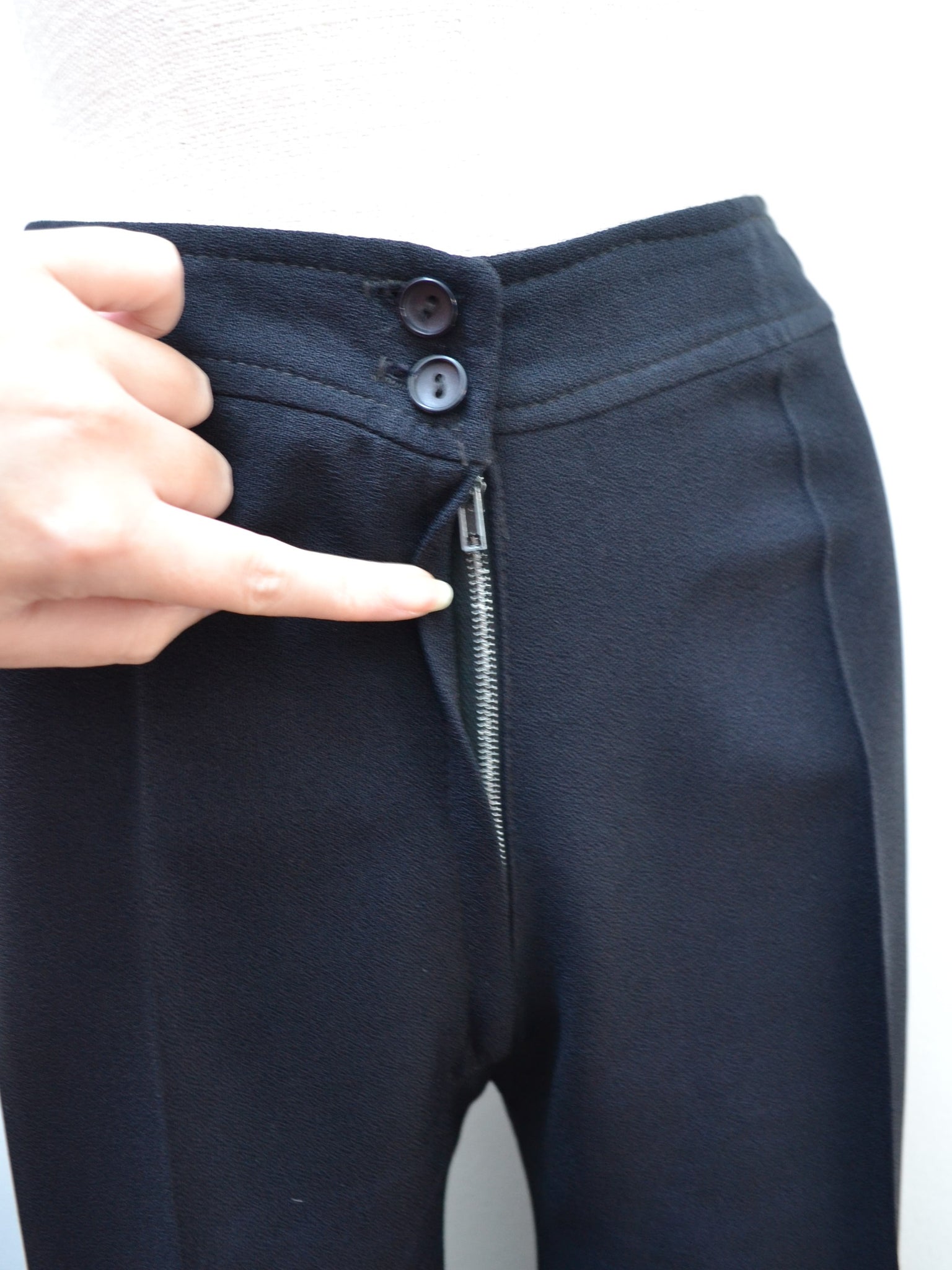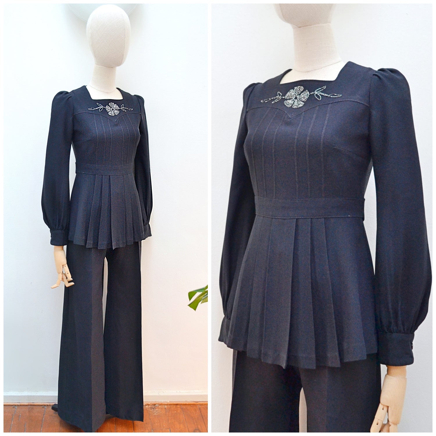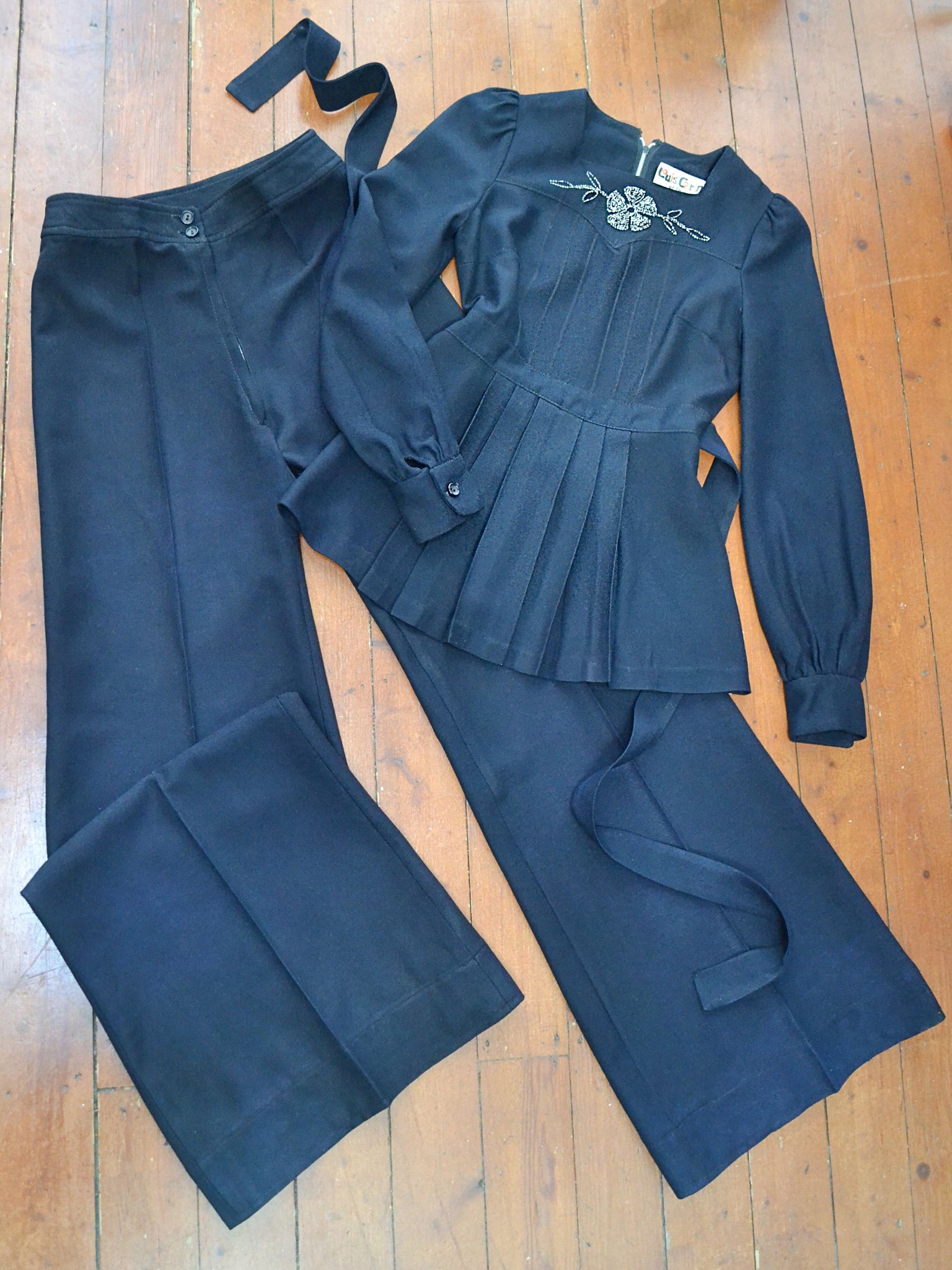 The most chic 1970s evening set from ‘Louis Caring of London’ label, in good quality black manmade crepe, comprised of trousers and tunic top. Top is closely fitted to waist band, which ties to the back as desired, and features pleating below. Long sleeves are cuffed, and gathered at sleeve head for puffed shoulder detail. Long metal zip to fasten at back, and chest is finished with silver lurex embroidery in floral design. Pants are waisted, with zip and button fly, and fabulous flared leg with pressed crease. Both articles unlined