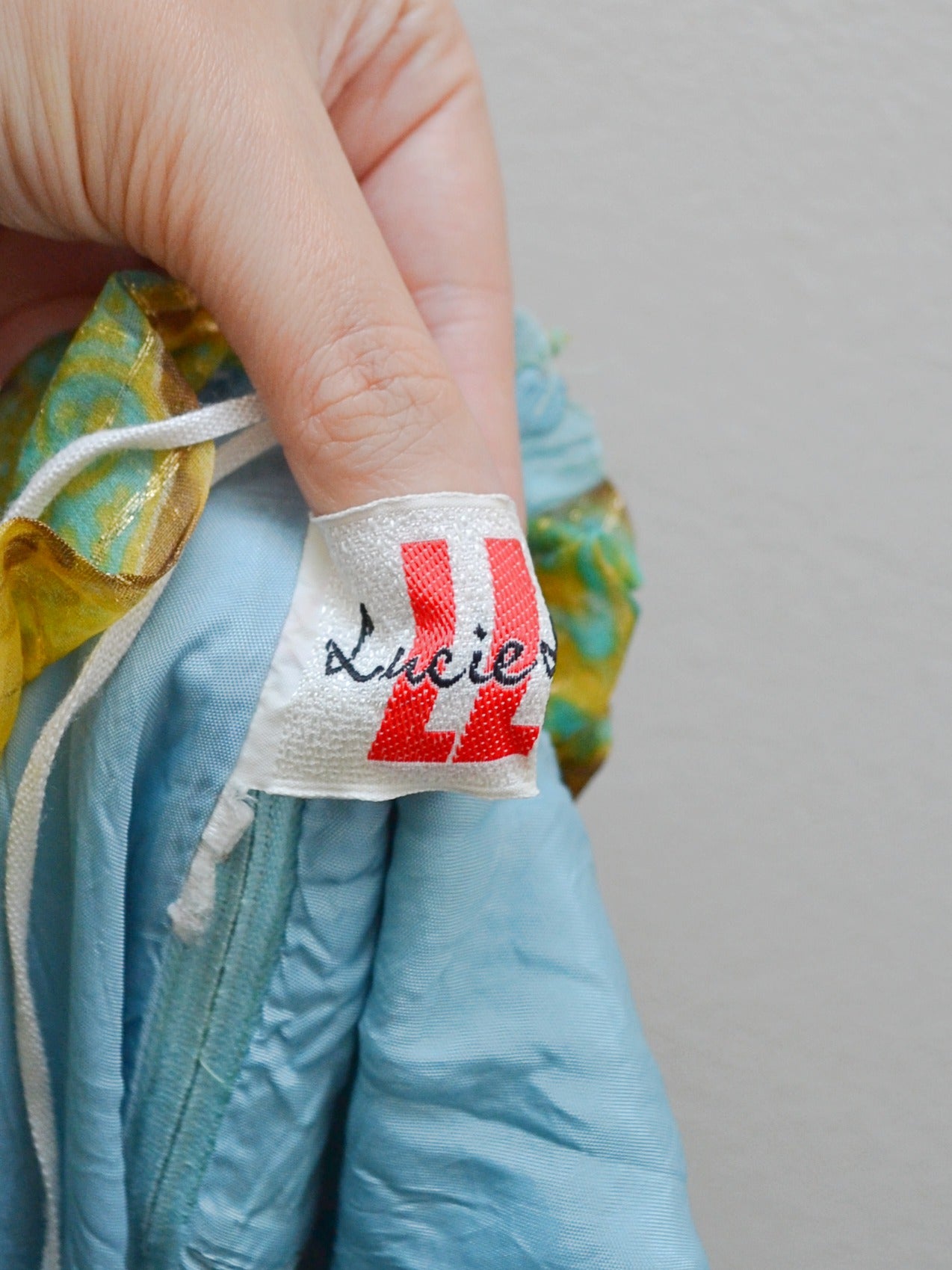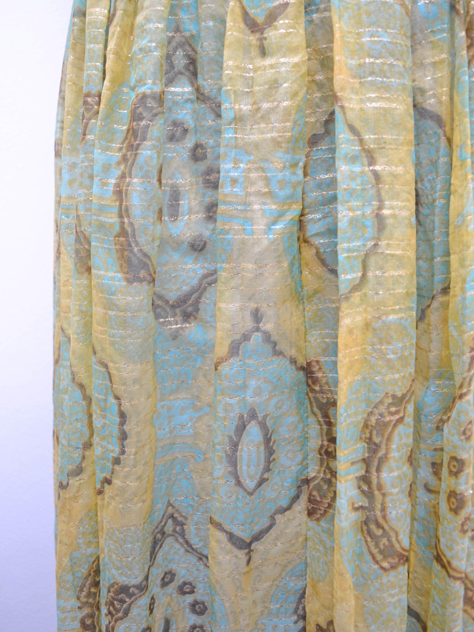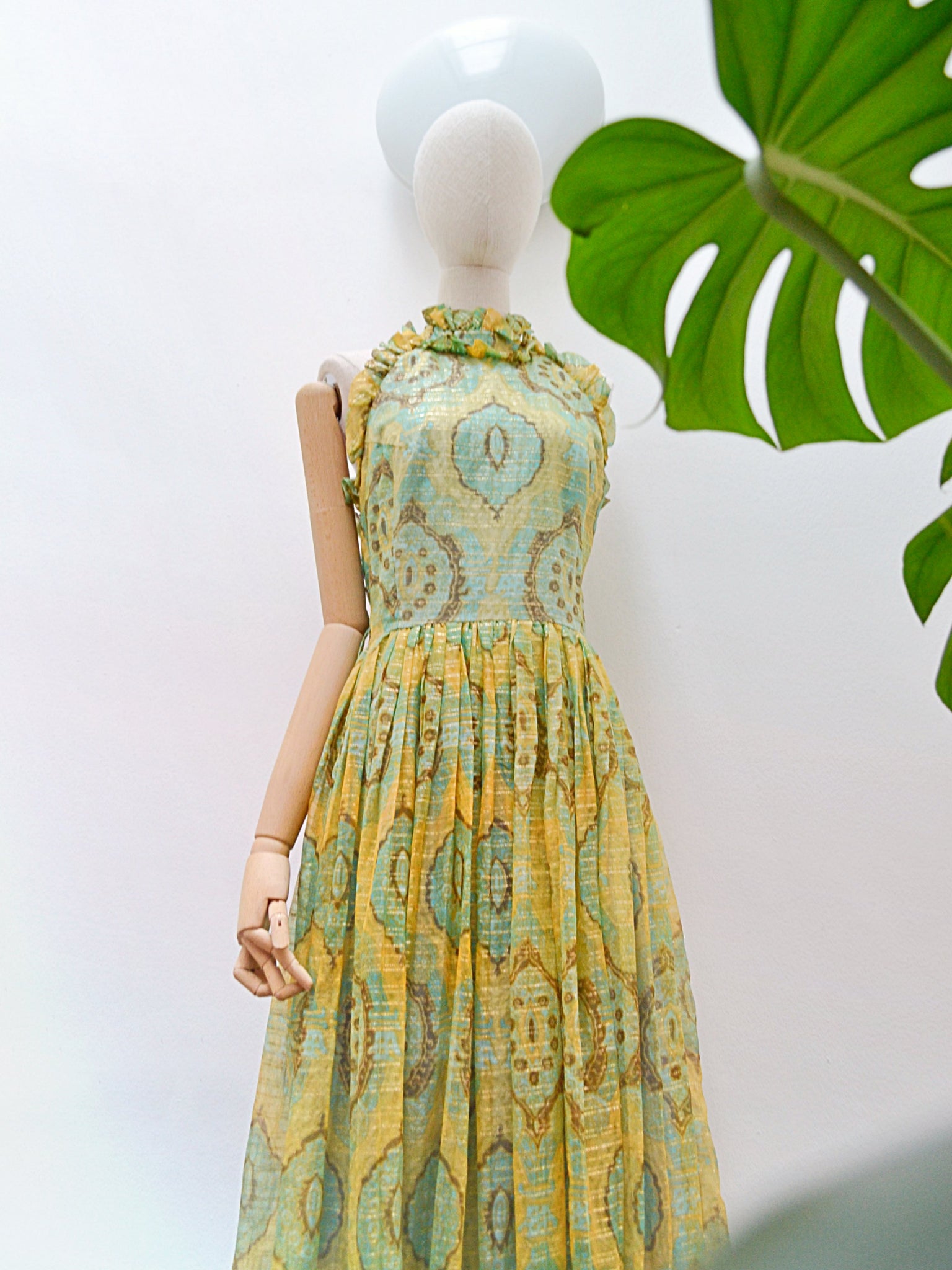 Gorgeous eye-catching 1970s maxi length party dress from ‘Lucie Linden’ label, in lined sheer nylon organza, printed with large design in greens and yellows, with gold stripe running through. With fitted halterneck bodice and ruffled neck fastening, skirt is pleated for fulness, and there are belt loops for your own belt if desired.