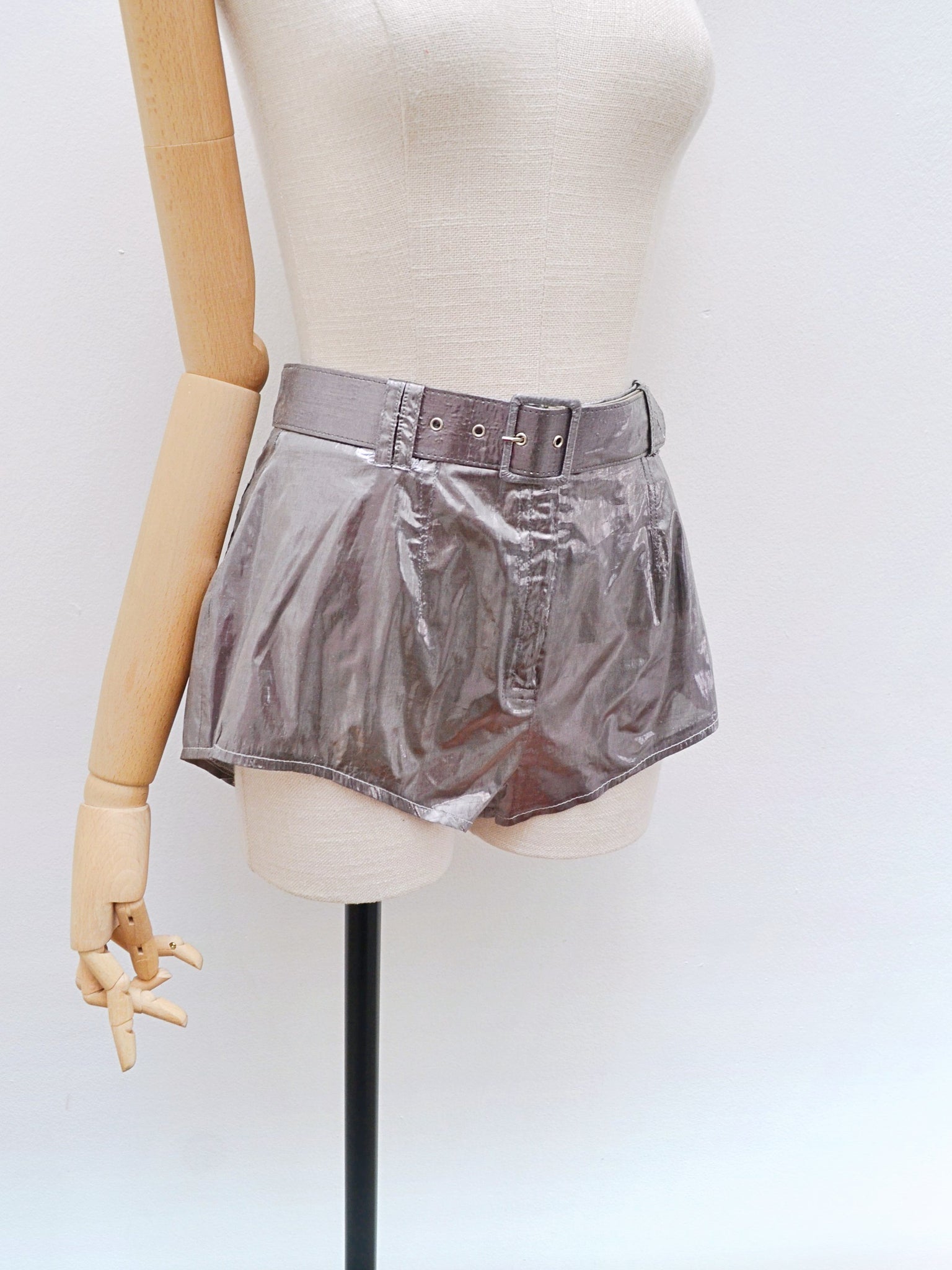 Dutch Designers ‘Puck & Hans’ label hotpants, I’m saying approx 1978-1984 from documented collections during this time, in graphite silver lightweight lamé. With back pockets and original matching vinyl-backed belt, they fasten with front zip fly and are unlined so be warned they’re semi sheer! Ooh lala!