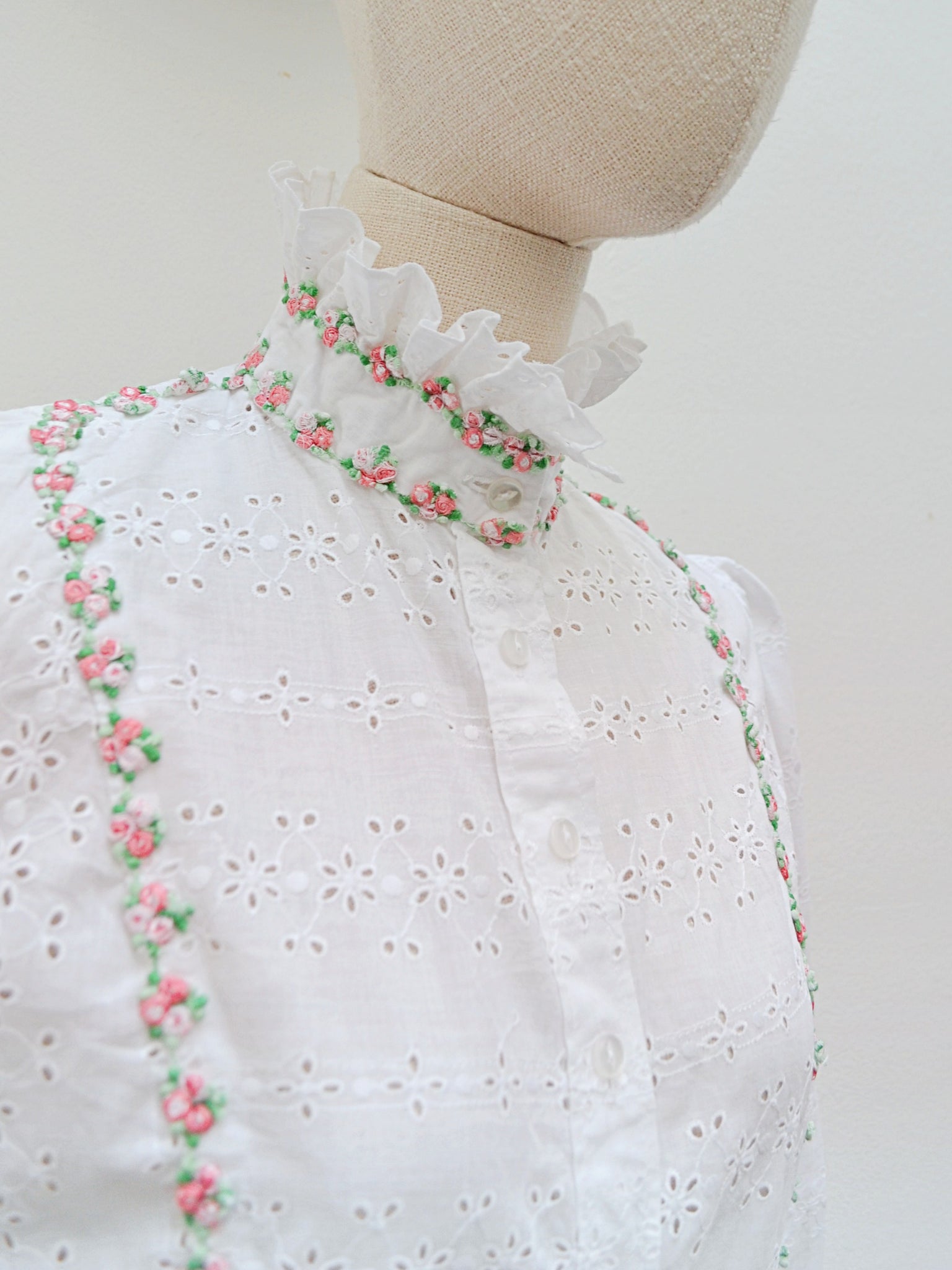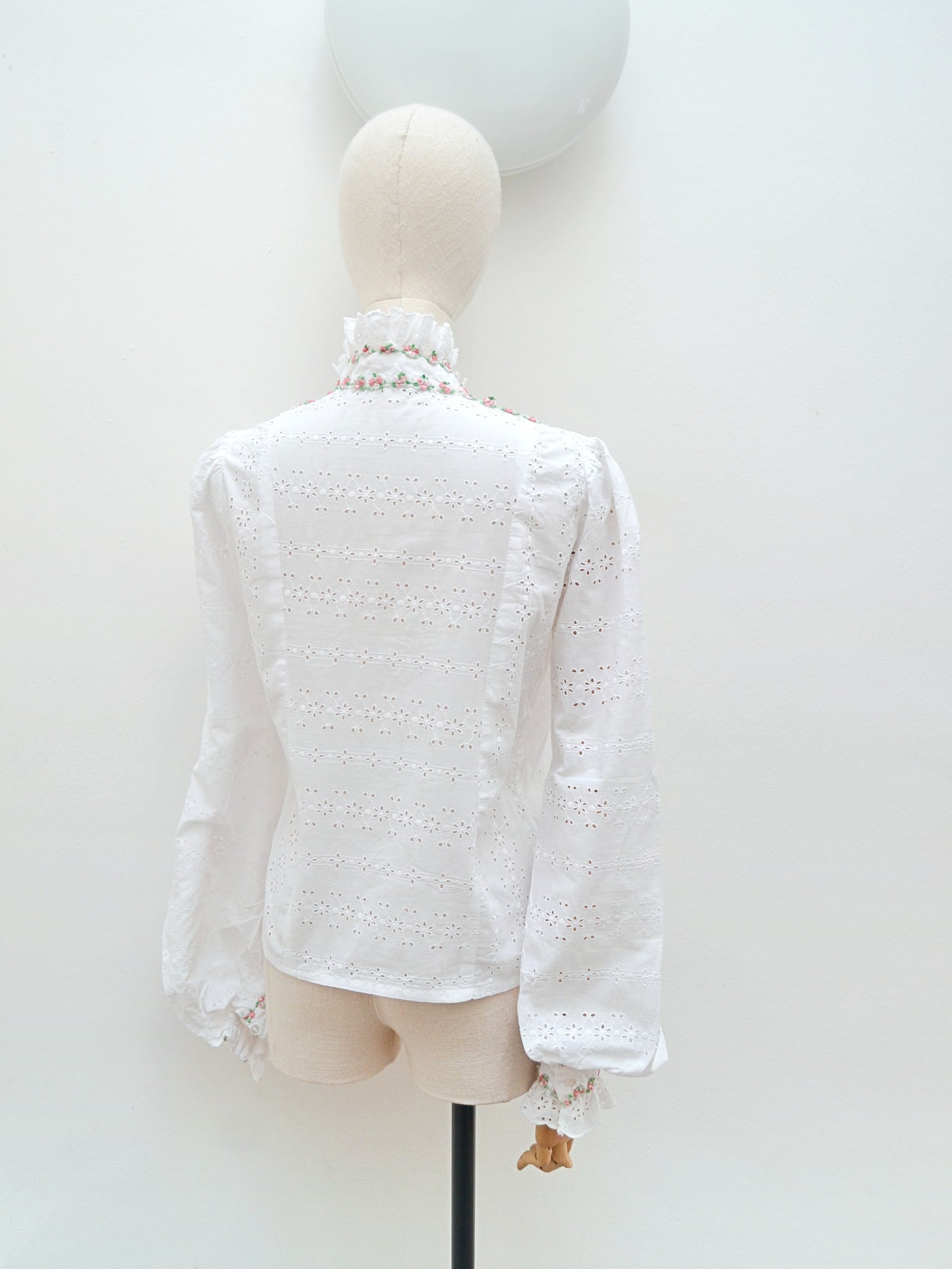 A sought-after blouse from collectible 1970s label, Quad, in crisp white Broderie Anglais cotton. Lightly fitted, with button front fastening, and appliqued floral braid in pinks and green. With victoriana high ruffled neckline, the long sleeves flare and balloon, gathered to a flat ruffle cuff. Such romance!