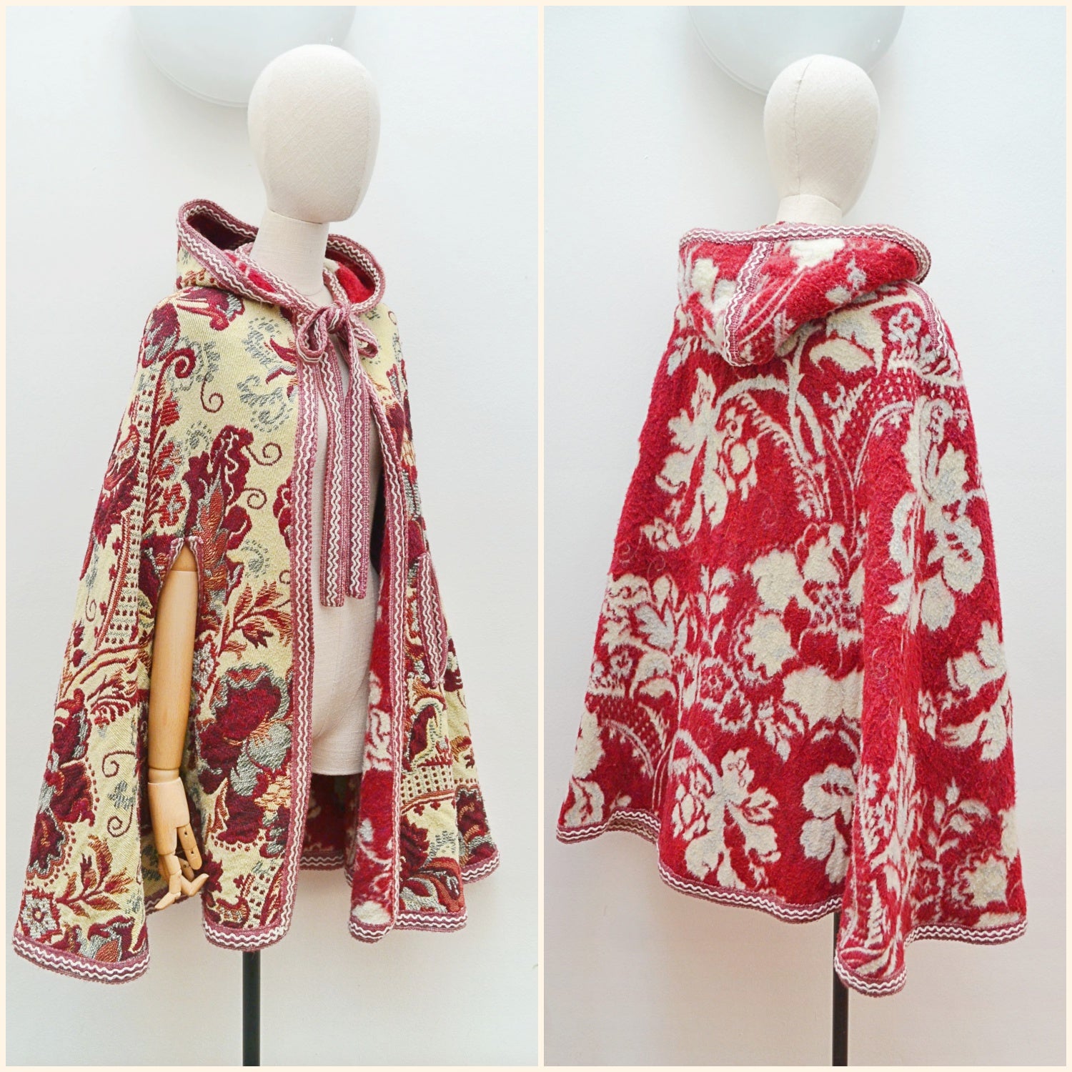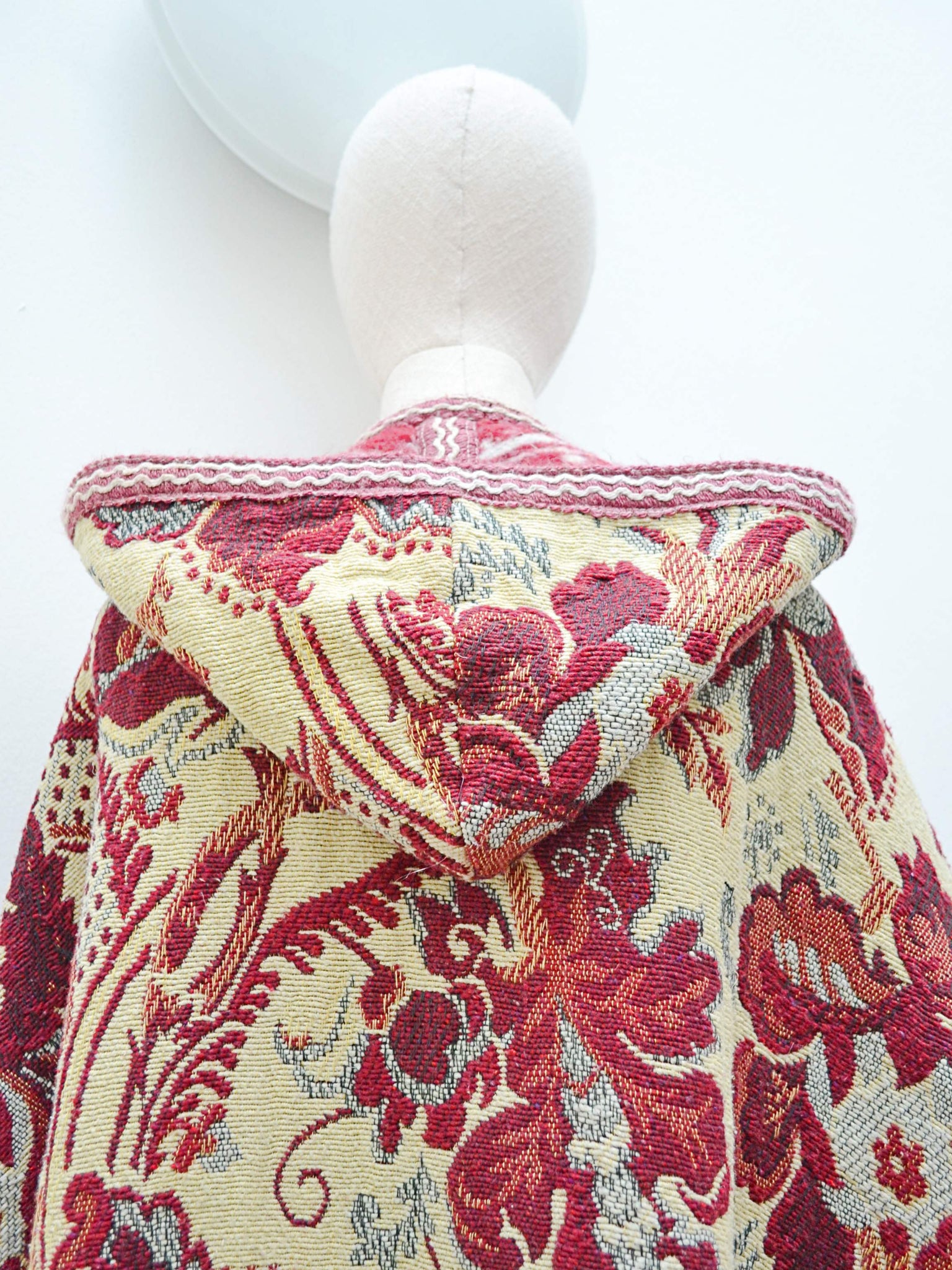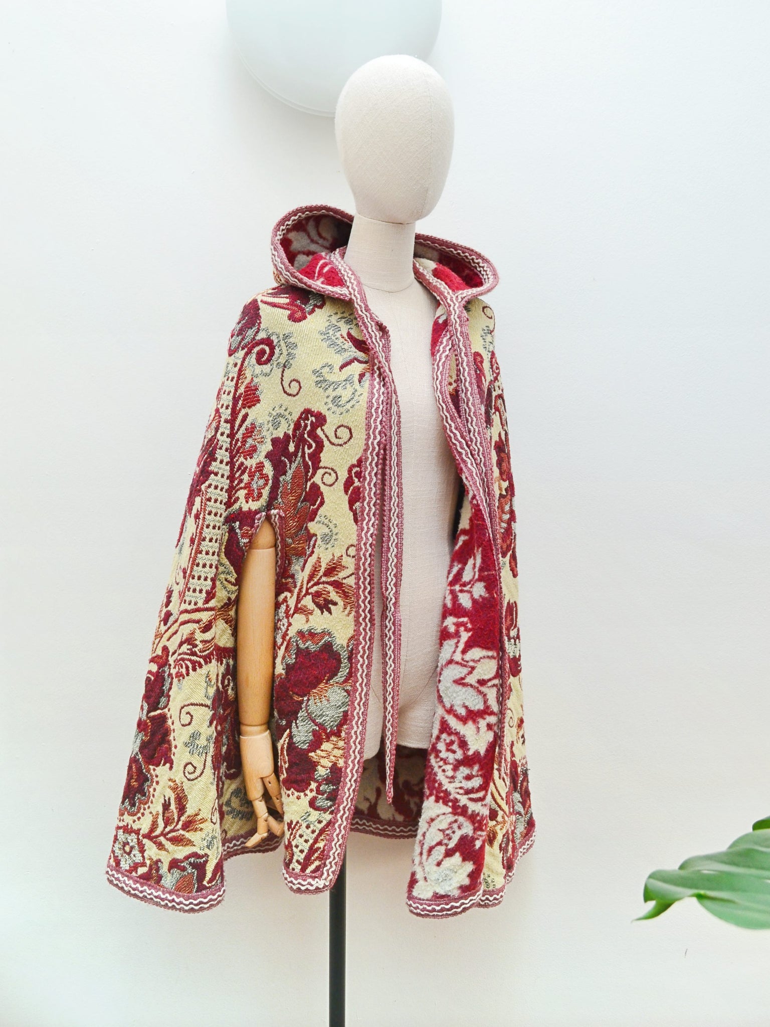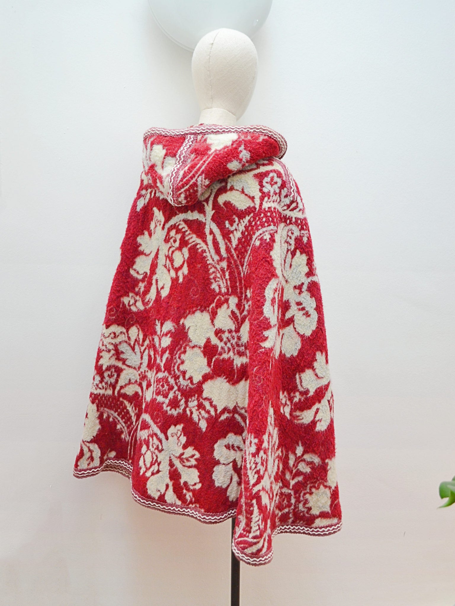 Incredible 1970s reversible cape, with ornate floral design picked out both sides in mulberry red and cream. With patterned braid finishing the arm openings and hem, plus long ties which fasten the piece at the neck. One side is tapestry style and predominantly cream, with the reverse in a soft acrylic fleece