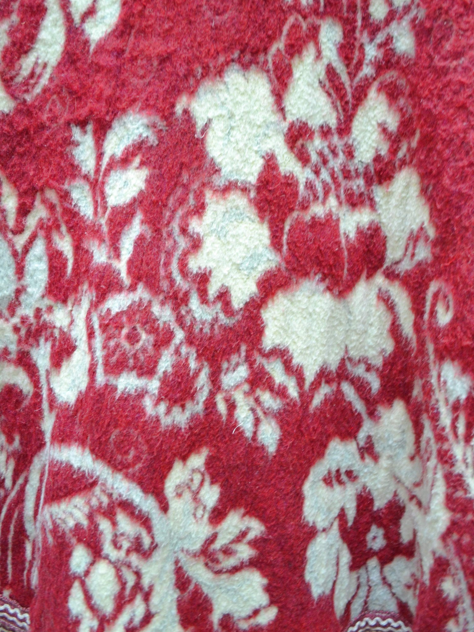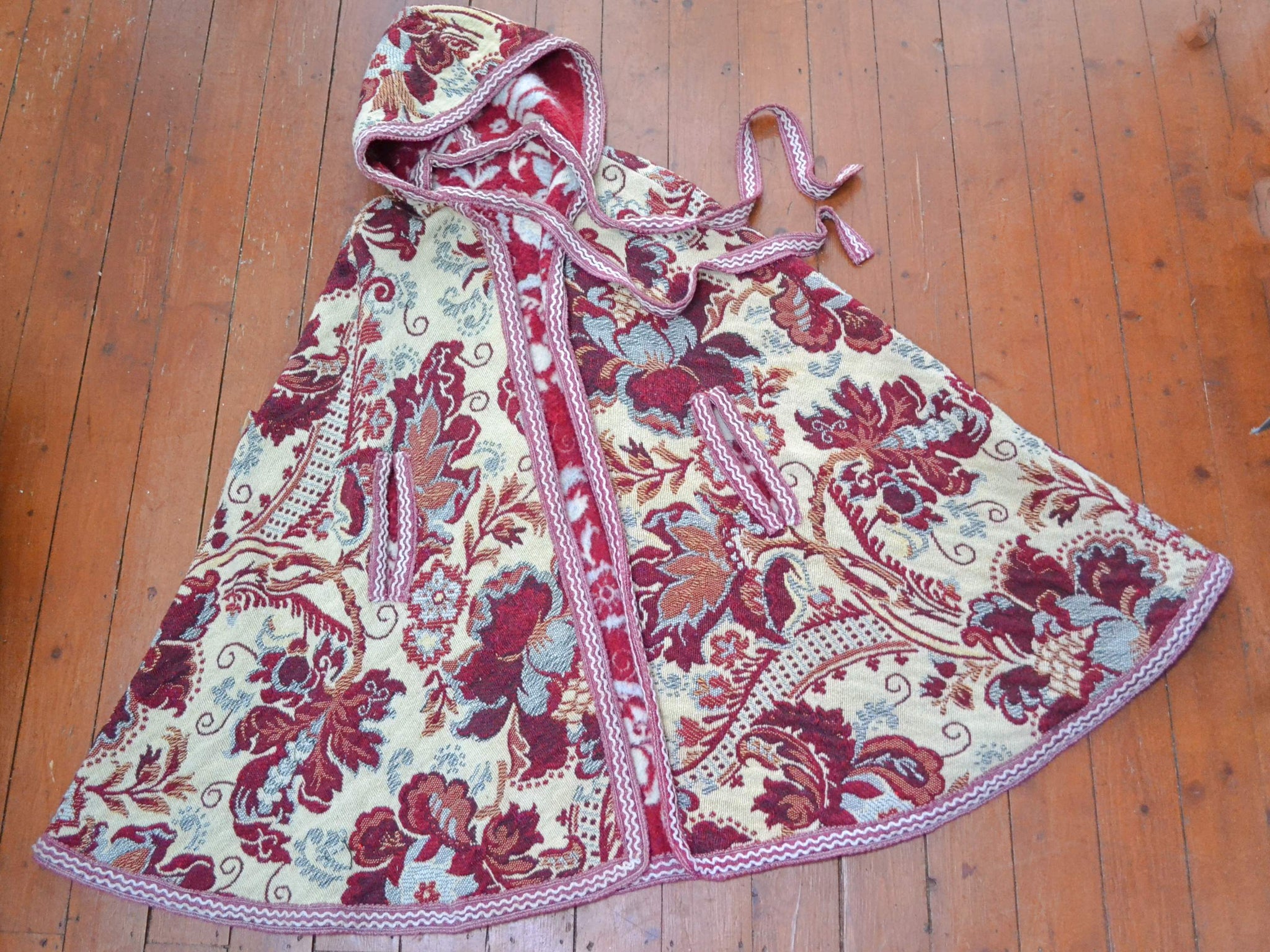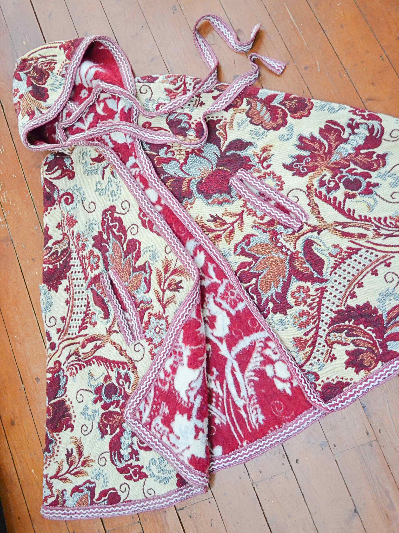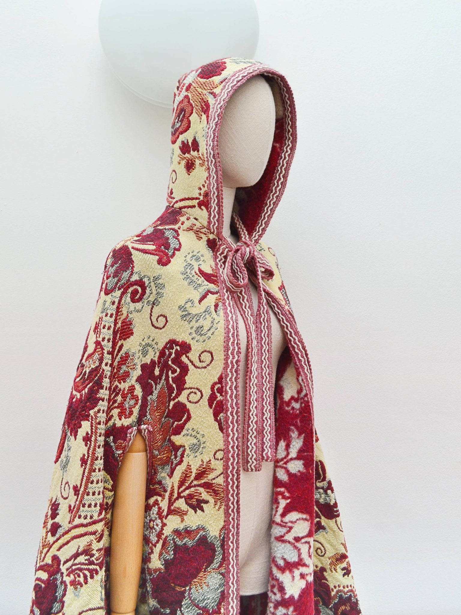 Incredible 1970s reversible cape, with ornate floral design picked out both sides in mulberry red and cream. With patterned braid finishing the arm openings and hem, plus long ties which fasten the piece at the neck. One side is tapestry style and predominantly cream, with the reverse in a soft acrylic fleece