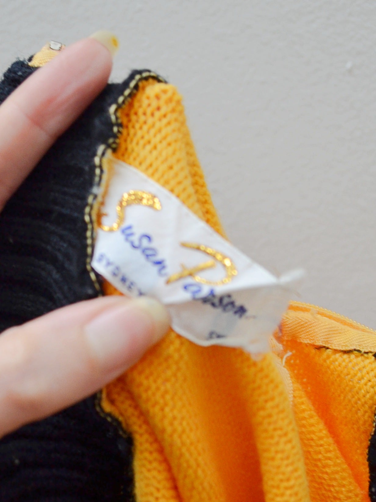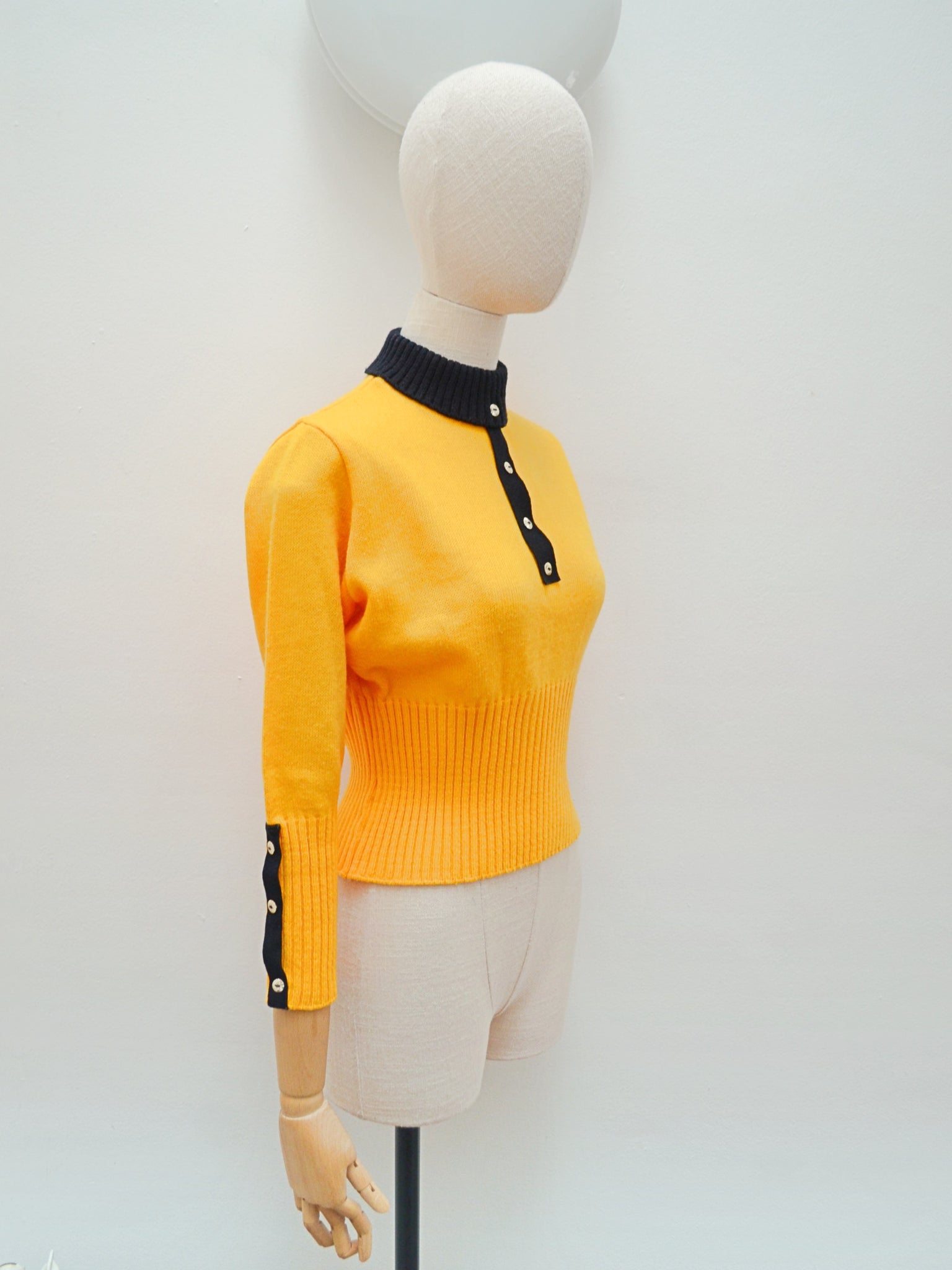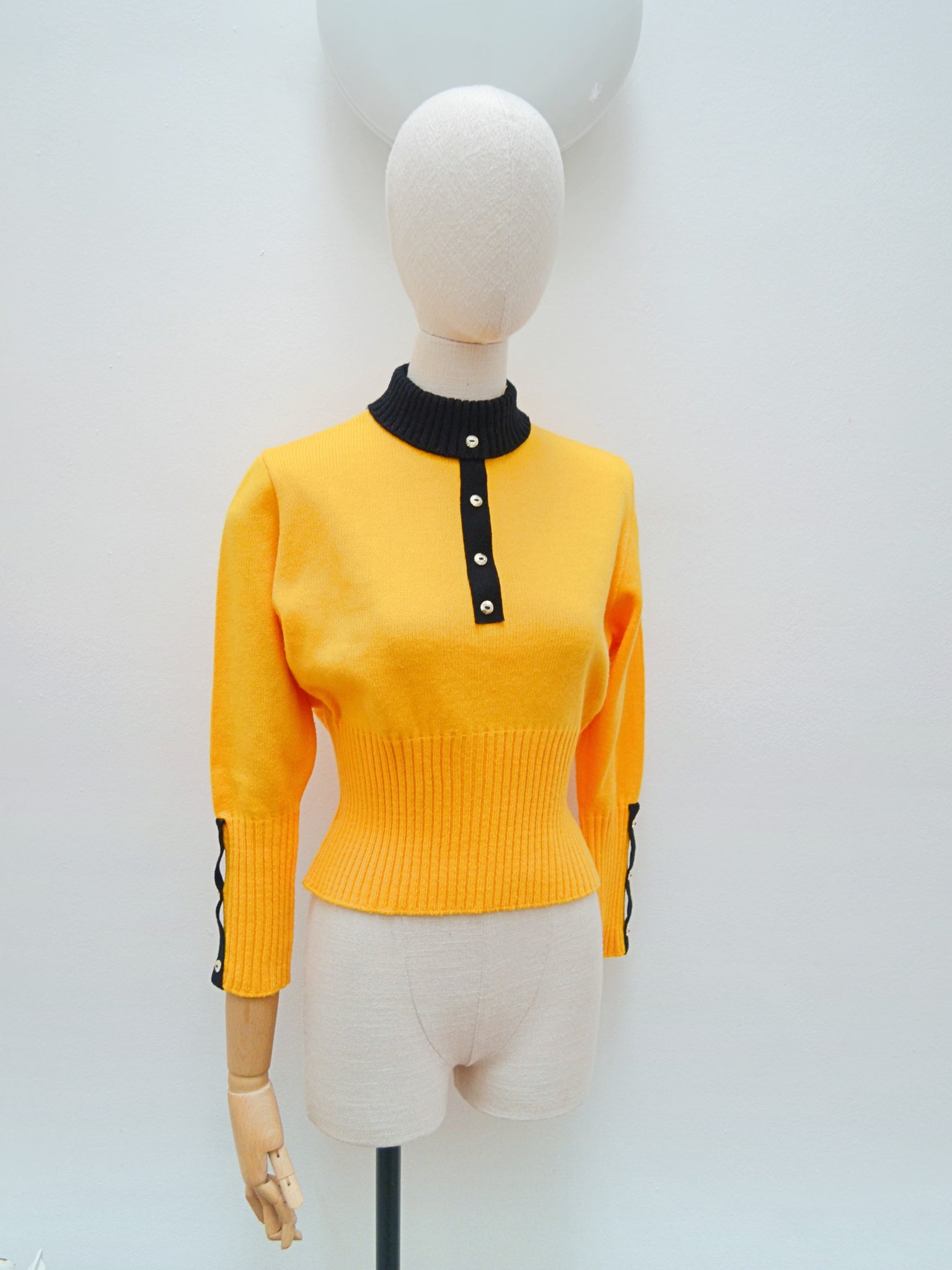 A fabulous 1970s sweater in skinnyrib acrylic jersey, with blocks of colour to the front and plain black back/sleeves. Ideal for wearing with flares, or A line skirt and boots!