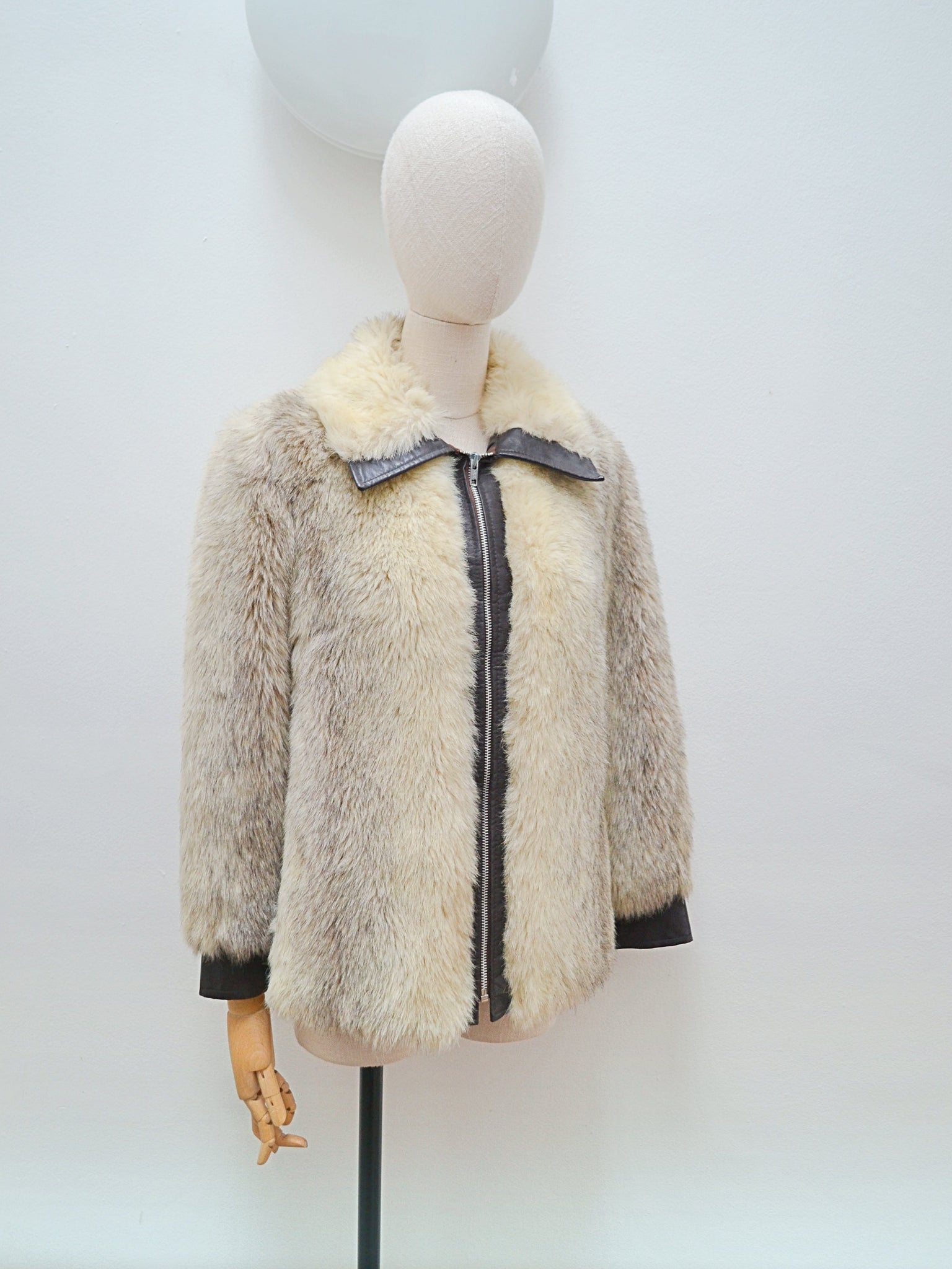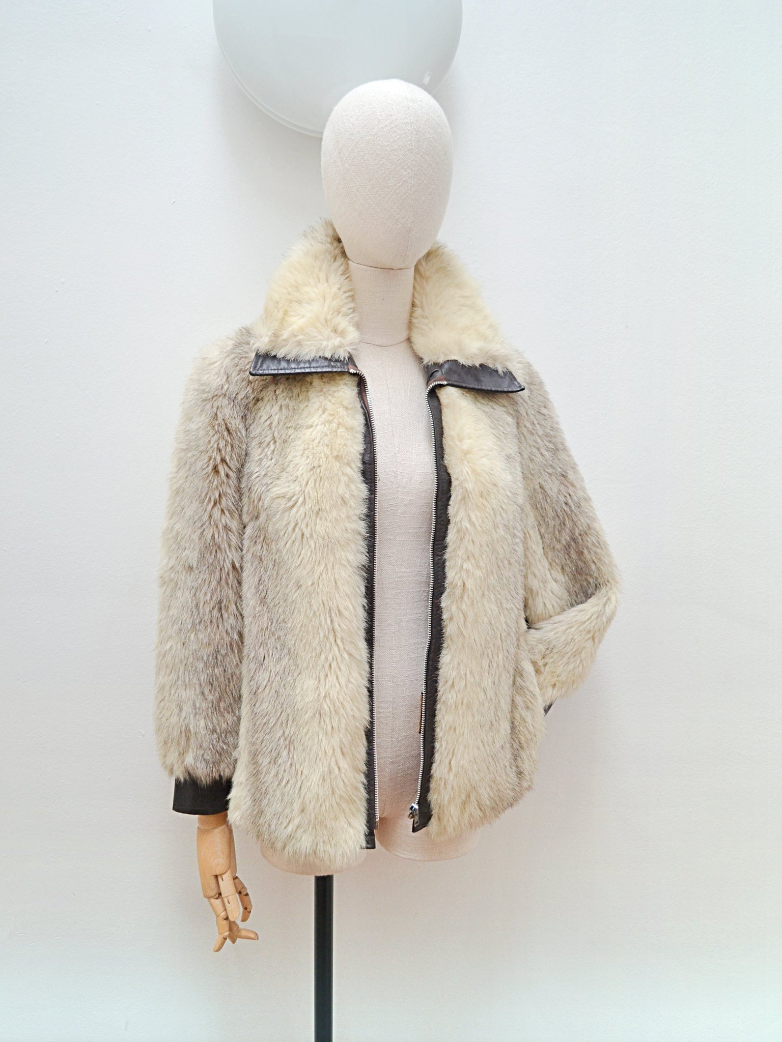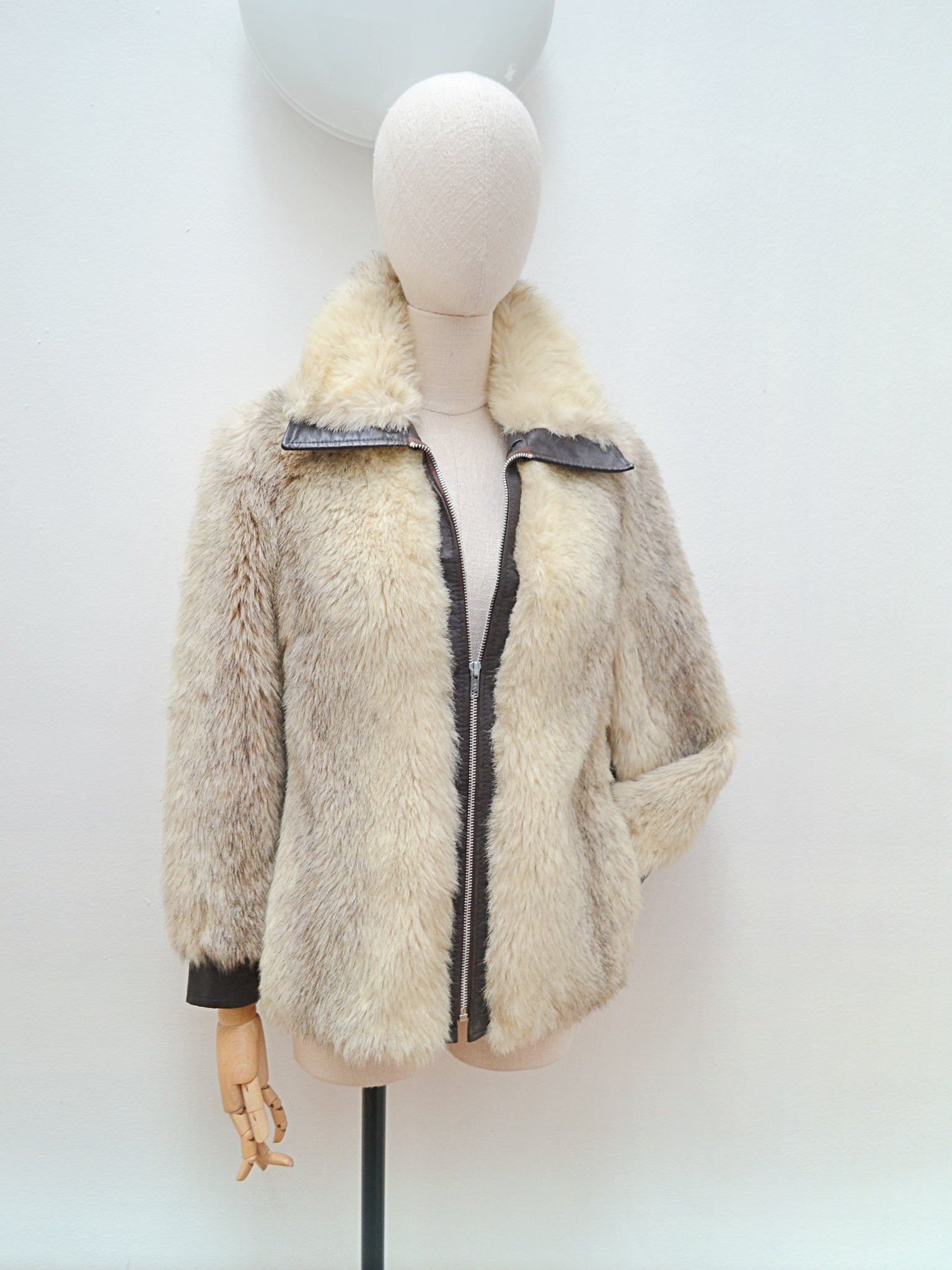 A sumptuous 1970s day jacket from ’Snugkoat’ label, in fluffy faux artcic fox? fur, with contrast panels of darkest brown leatherette. With pockets concealed in the side seams and zip front.