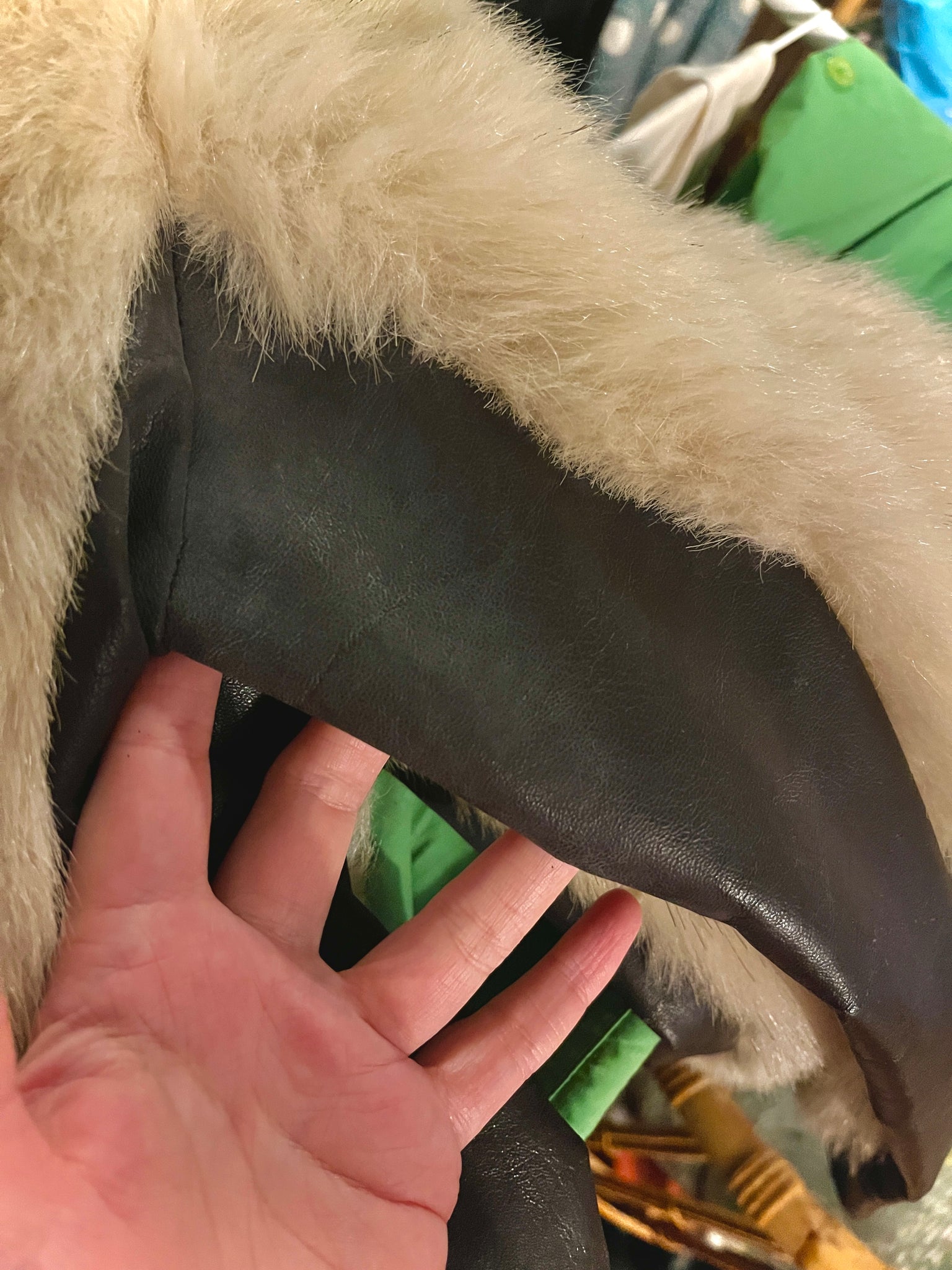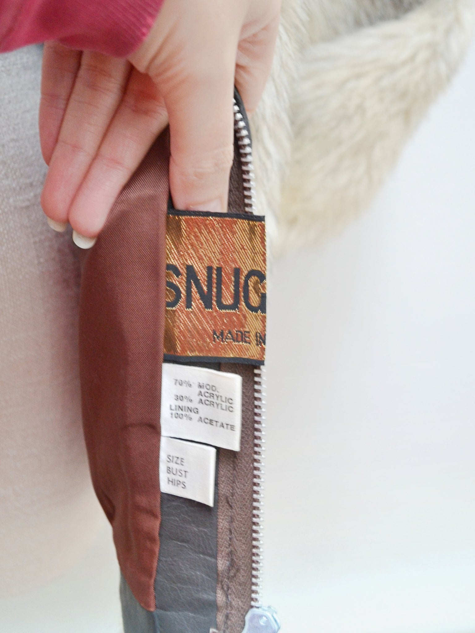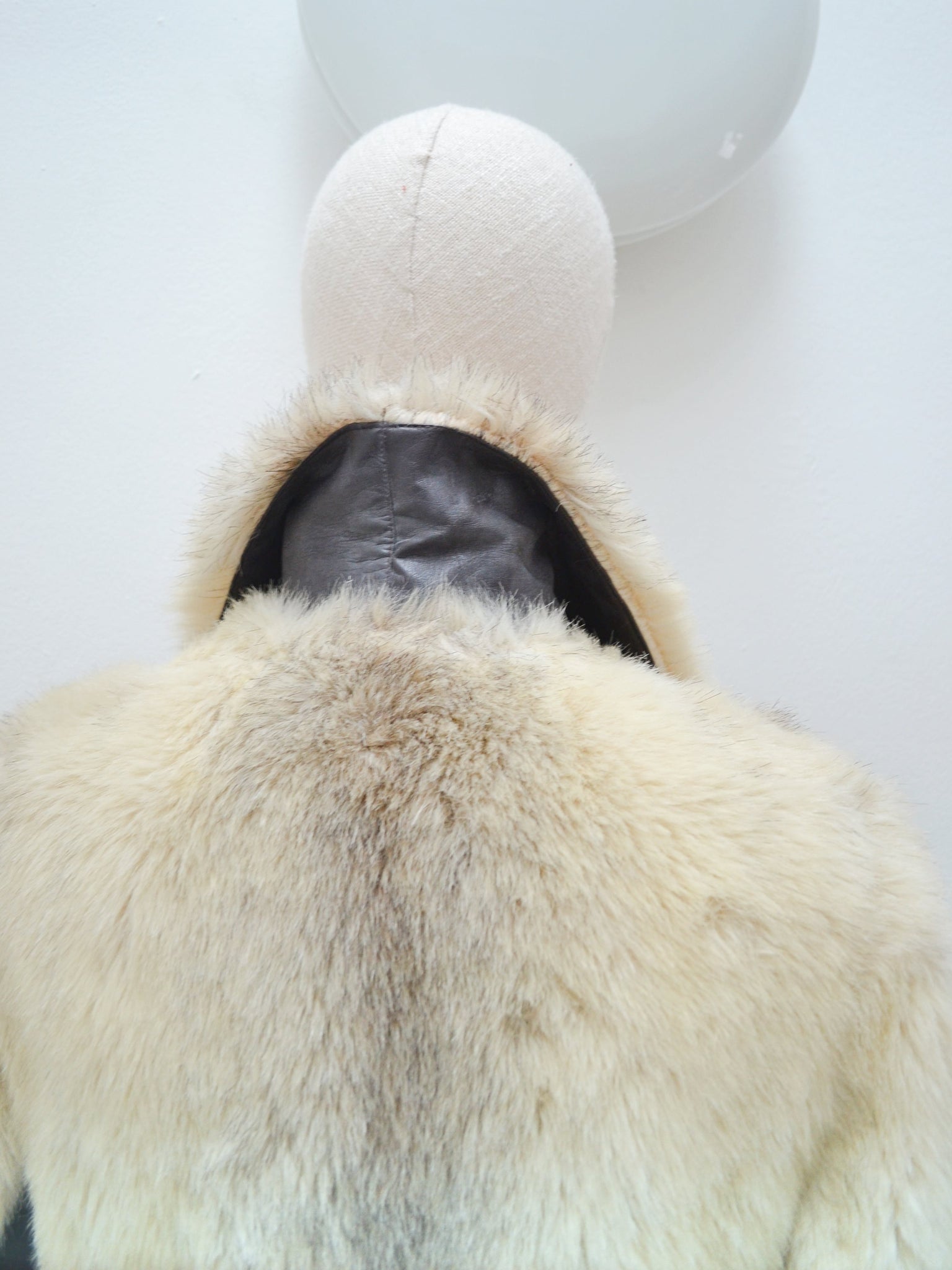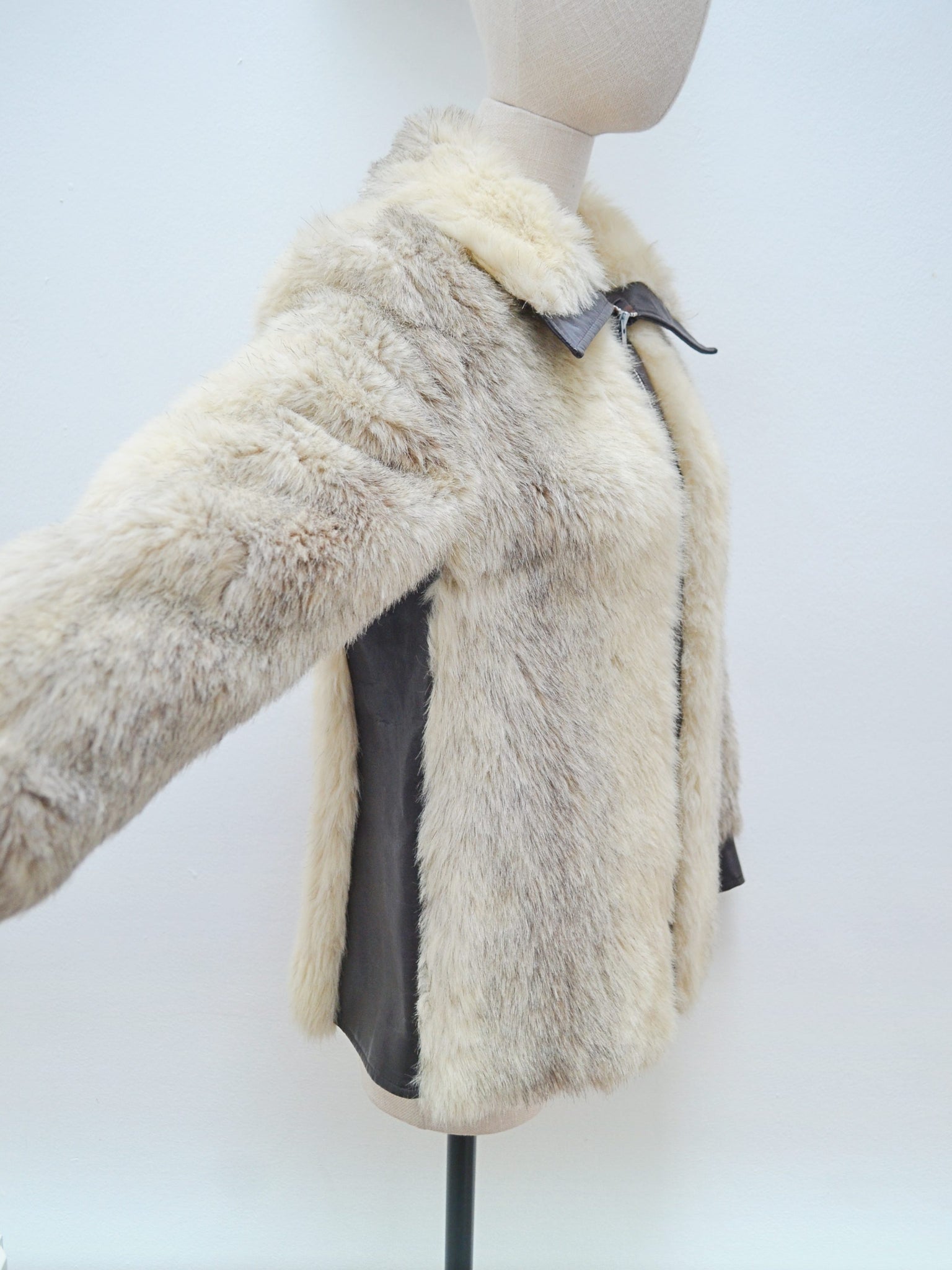 A sumptuous 1970s day jacket from ’Snugkoat’ label, in fluffy faux artcic fox? fur, with contrast panels of darkest brown leatherette. With pockets concealed in the side seams and zip front.