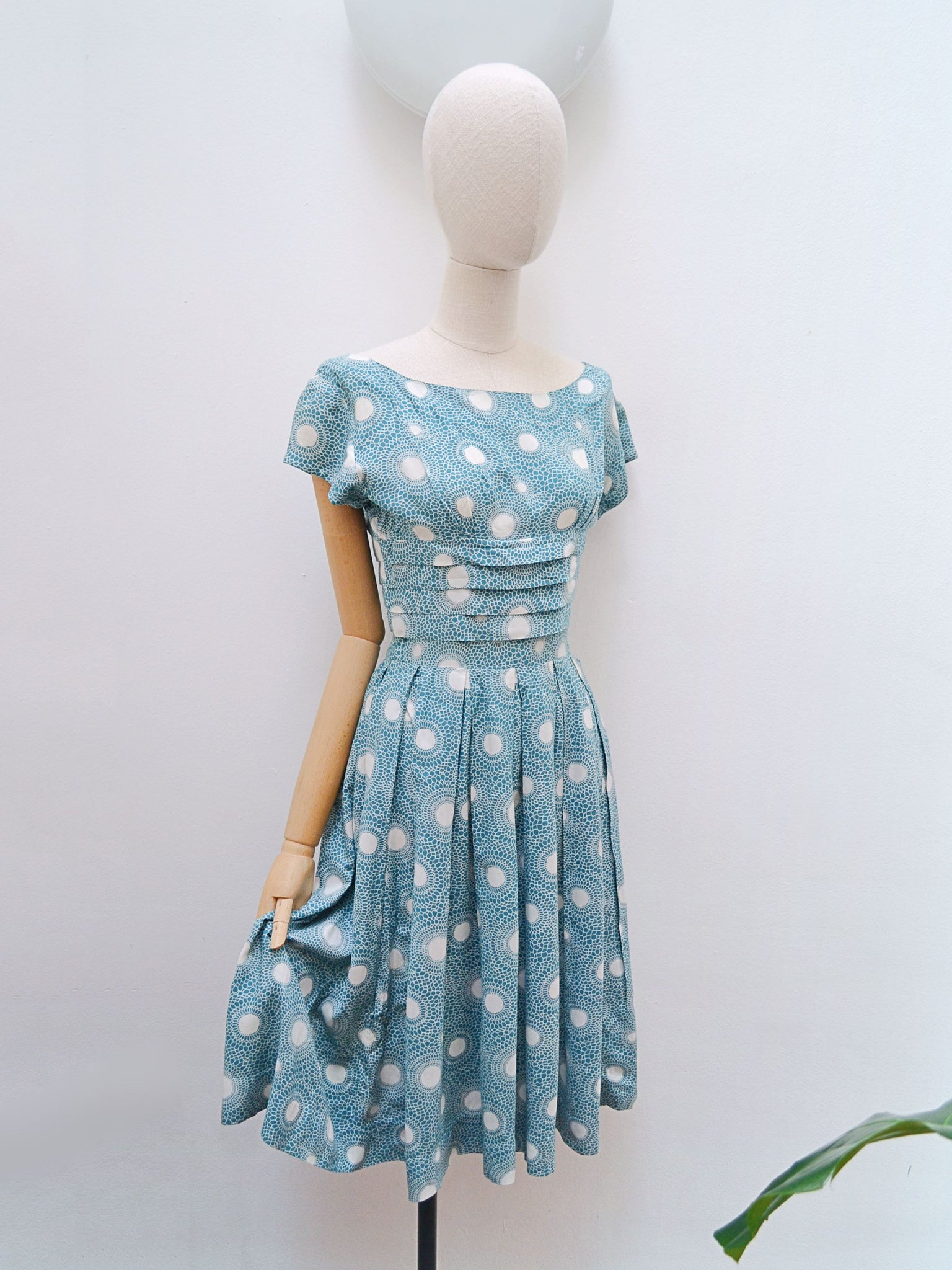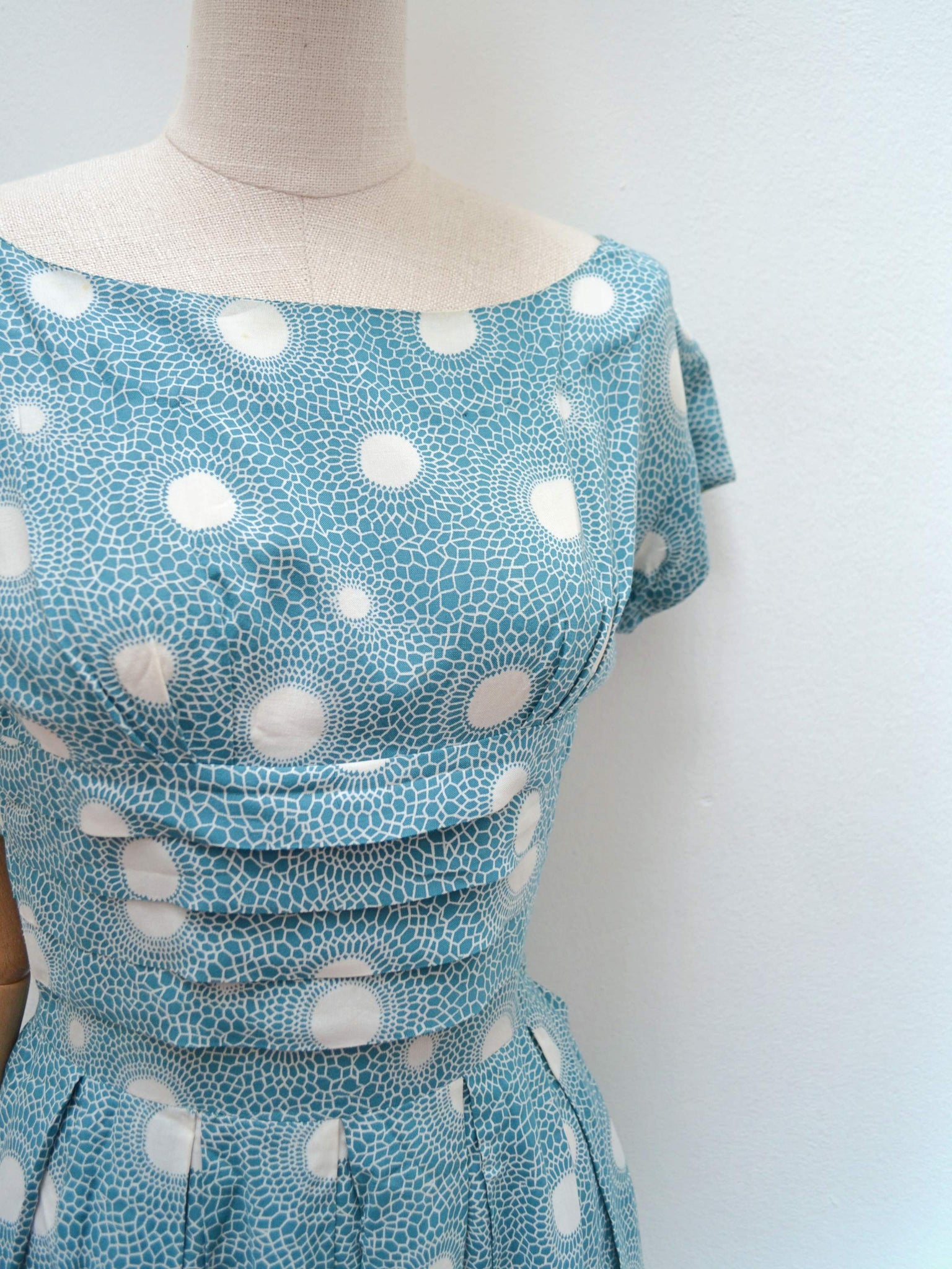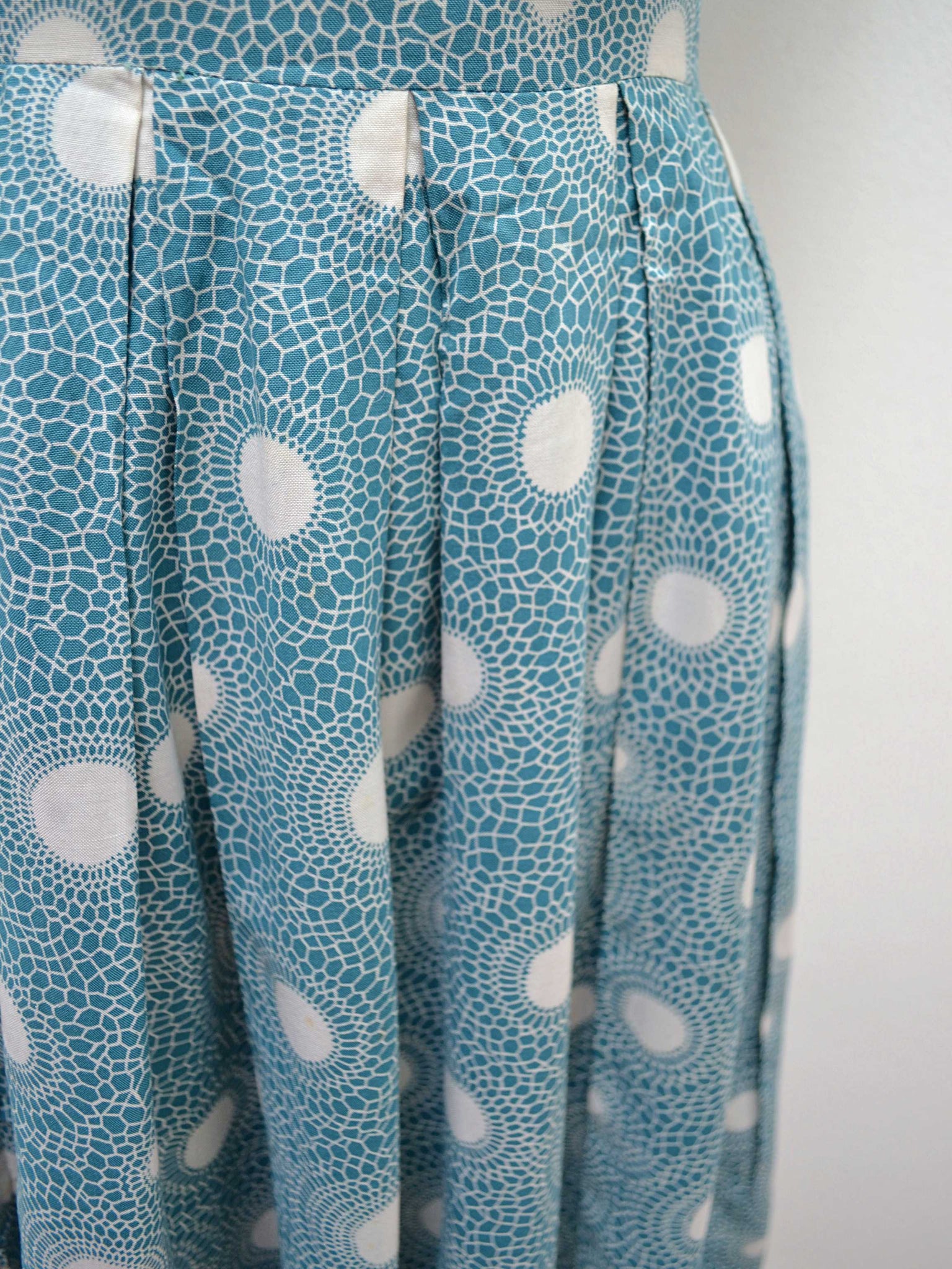 A lovely little early 1960s day dress in rayon, printed with white polka dots radiating out mosaic style halos against a gorgeous shade of teal. With fitted bodice and short sleeve, the midrif is detailed with tiered pleating, and full skirt is pleated from waist. Nylon, but original, zip to fasten at back, no labels remain.