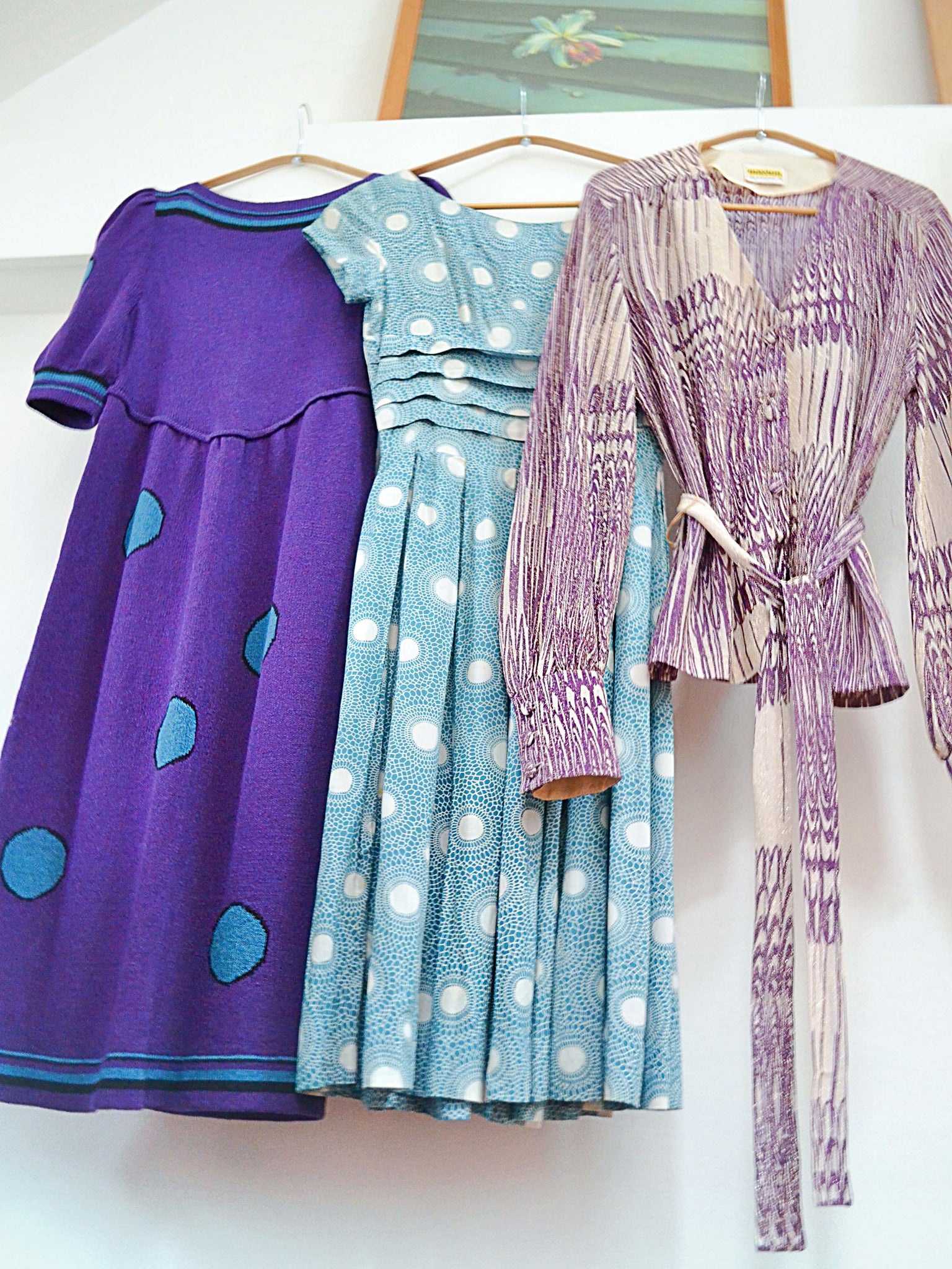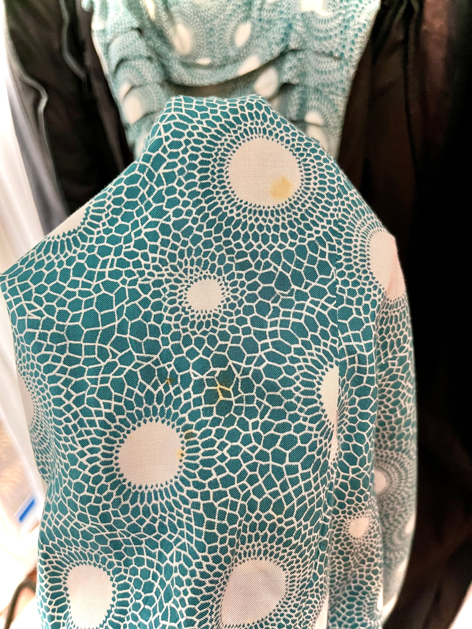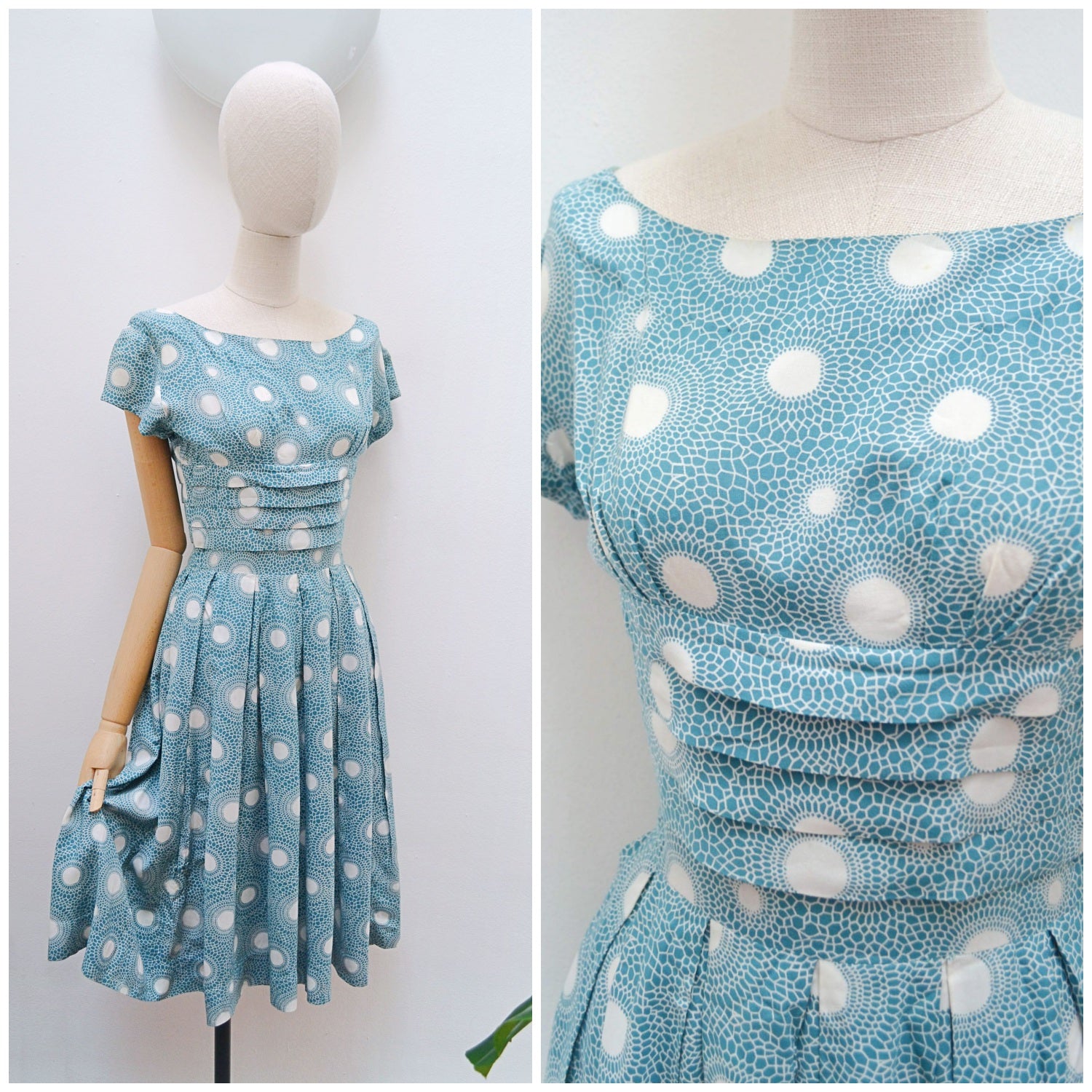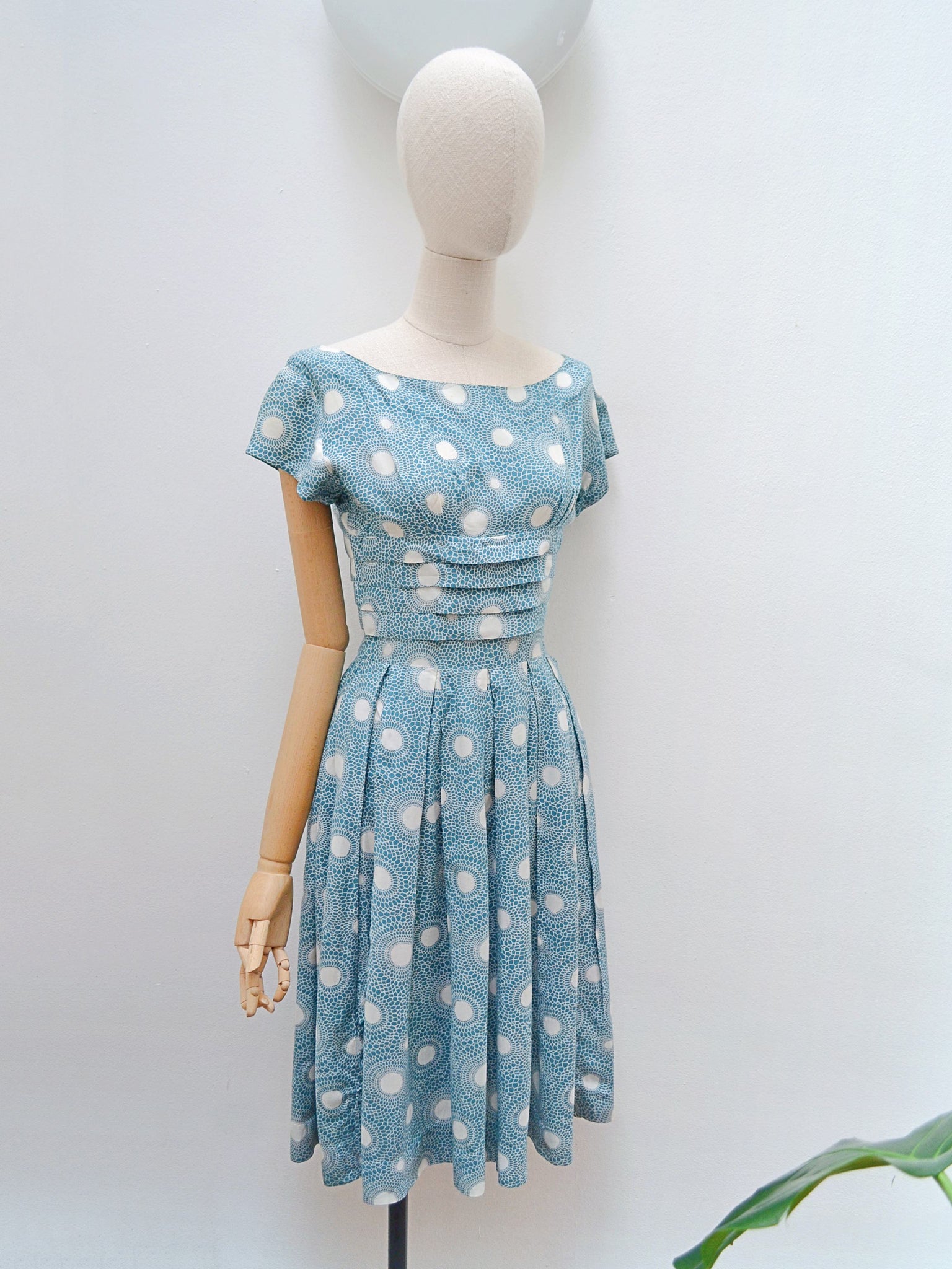 A lovely little early 1960s day dress in rayon, printed with white polka dots radiating out mosaic style halos against a gorgeous shade of teal. With fitted bodice and short sleeve, the midrif is detailed with tiered pleating, and full skirt is pleated from waist. Nylon, but original, zip to fasten at back, no labels remain.
