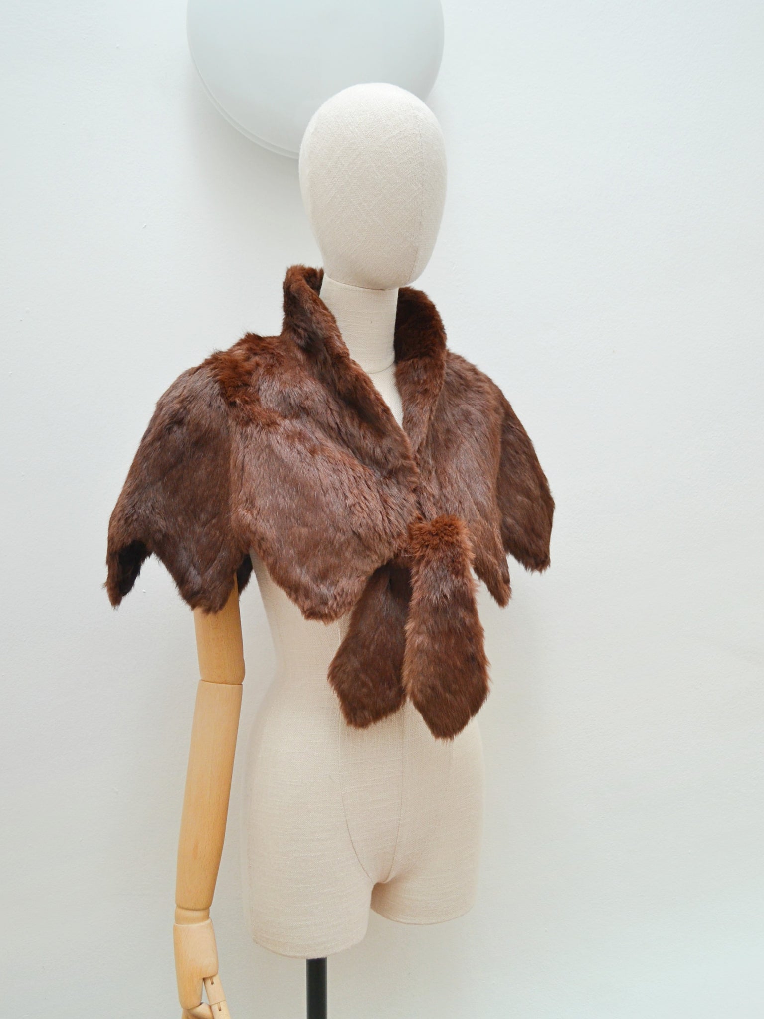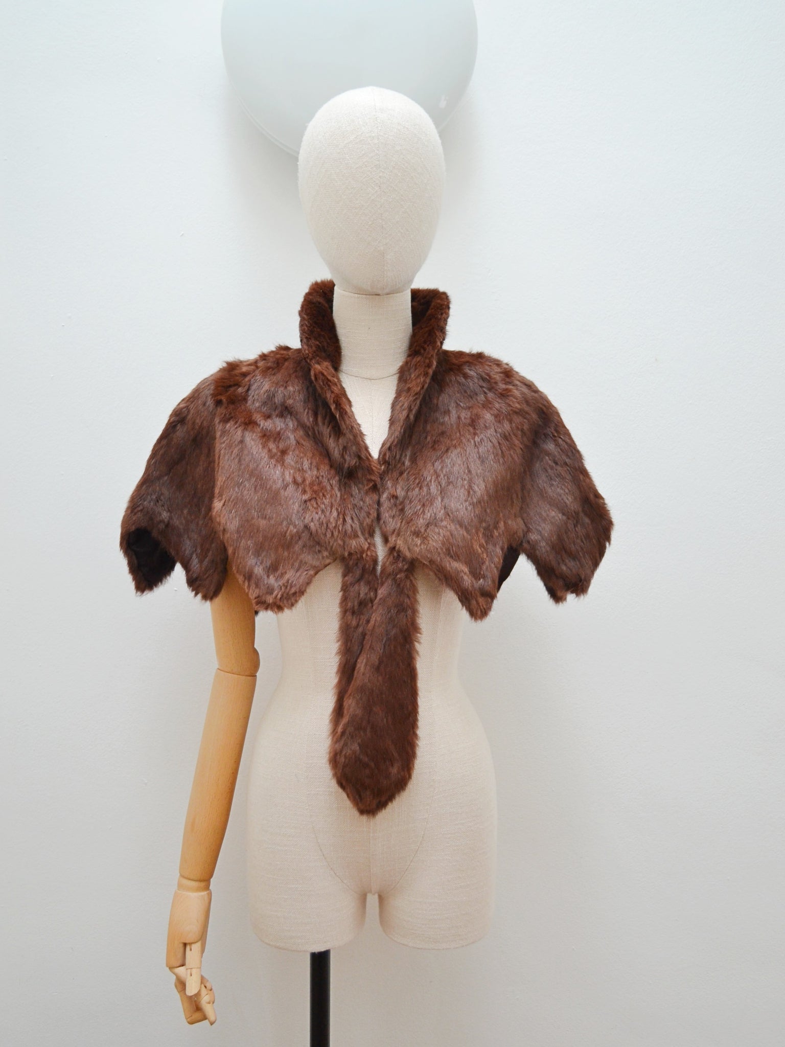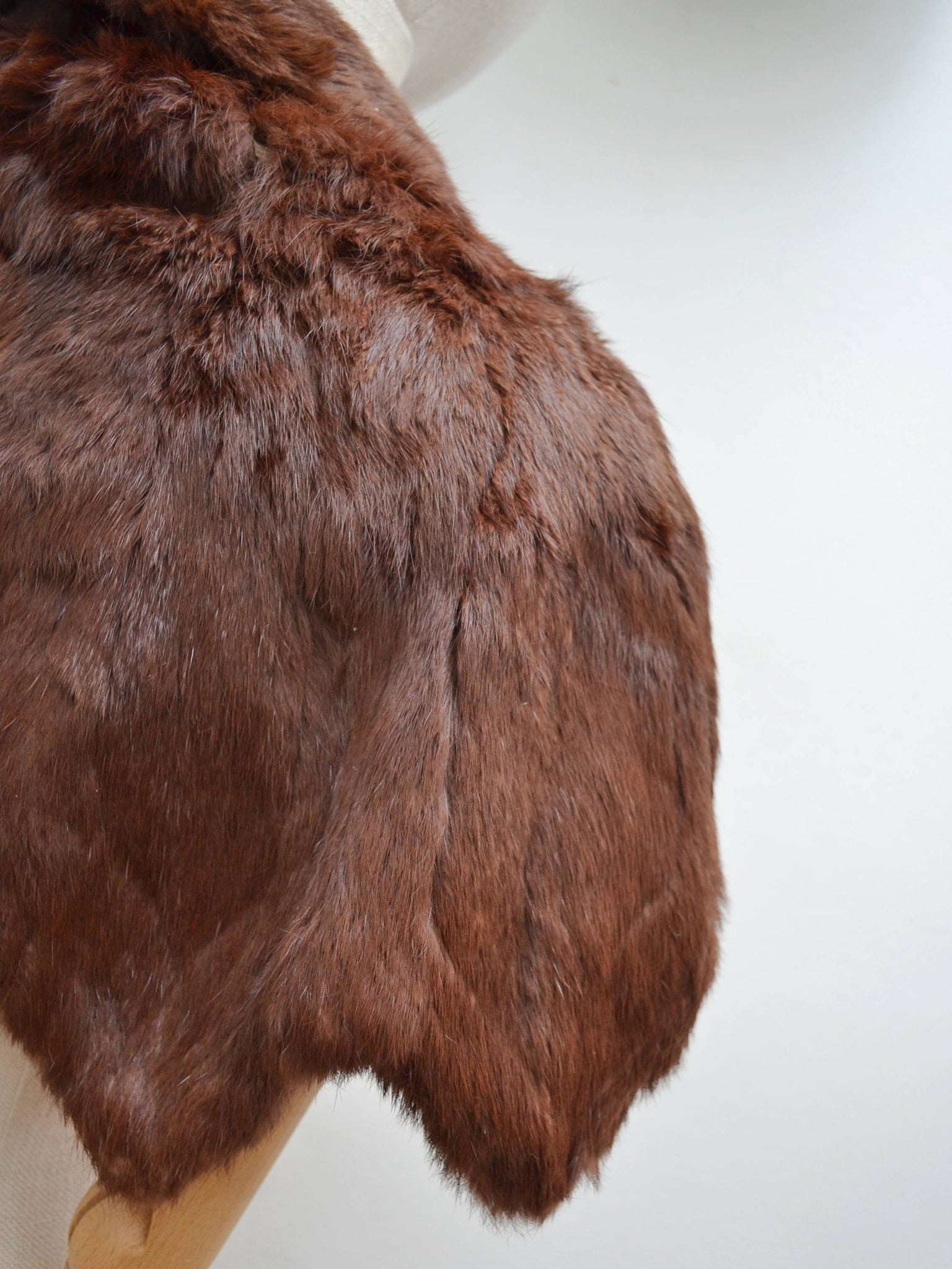 Gorgeous 1930s capelet in super soft rabbit fur, a rich glossy brown as though mink but not quite as dense a pile. Lined in a satiny rayon, with small collar able to be worn dramatically ‘popped’, and furriers hook fastening above tapered fur ties. Wonderful zig-zag hem! I would guess an XS-S size, shown on a 33" chest mannequin